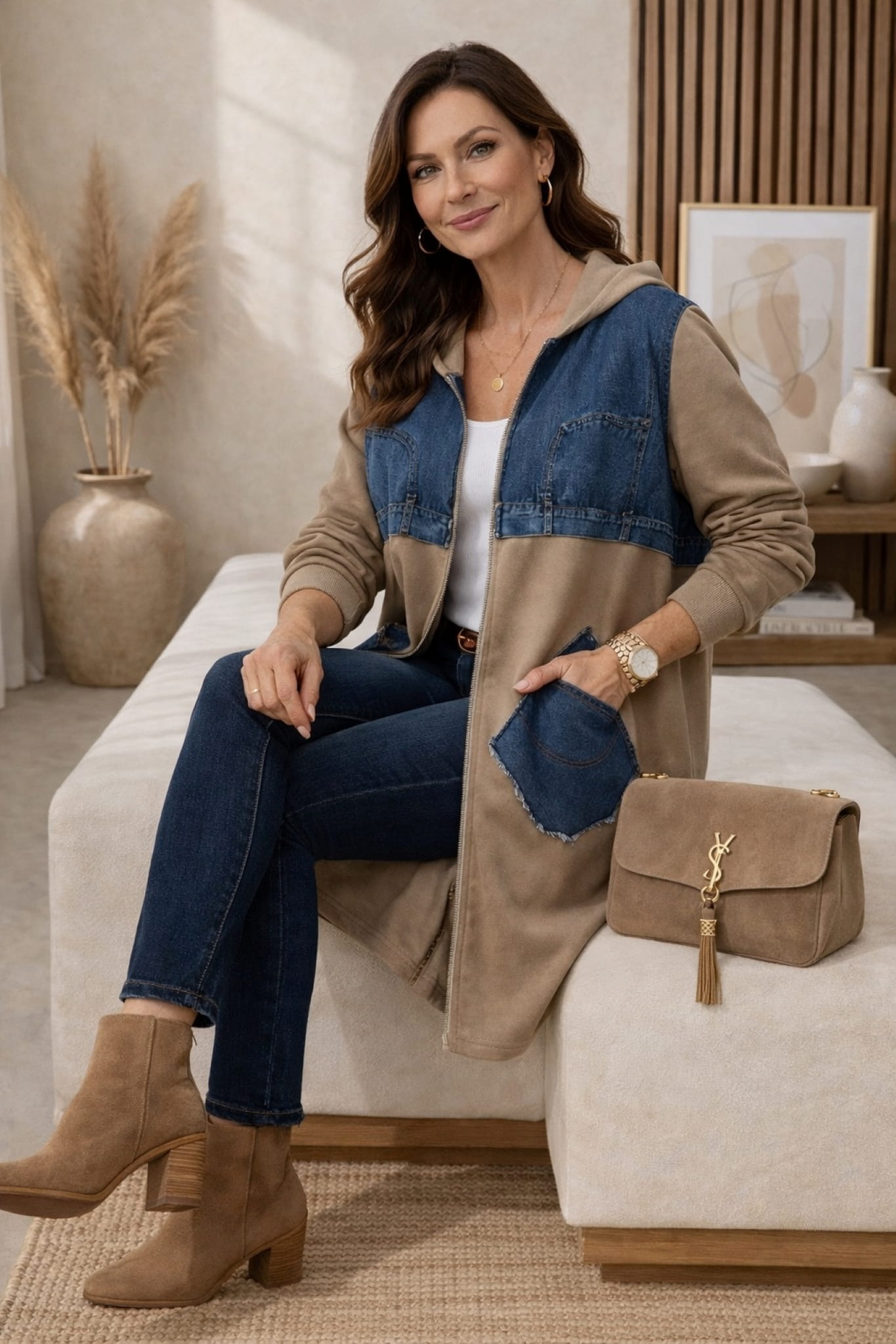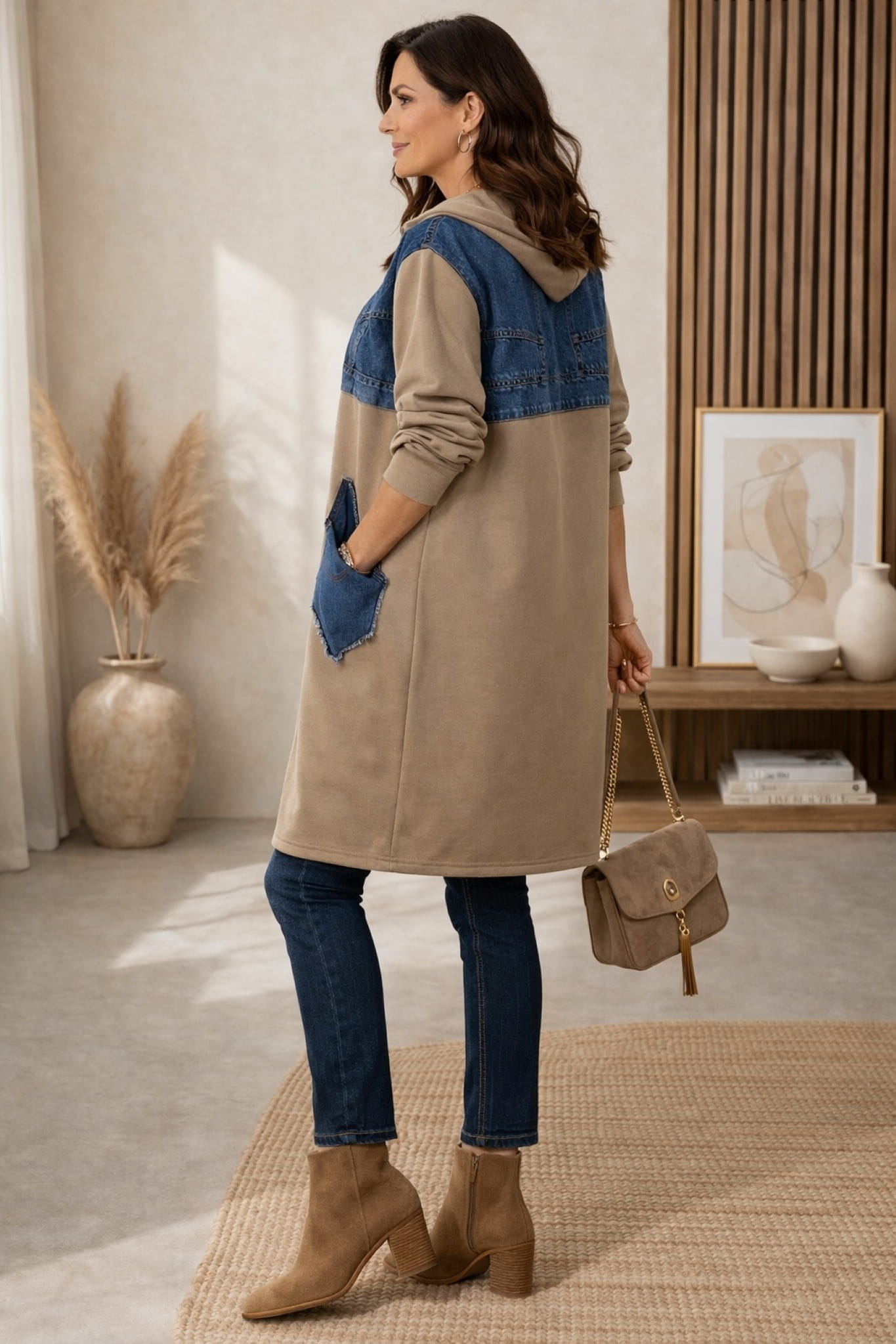 Bluza długa oversize z kapturem kieszeniami na suwak dresowa z jeansowymi wstawkami Barchi fango