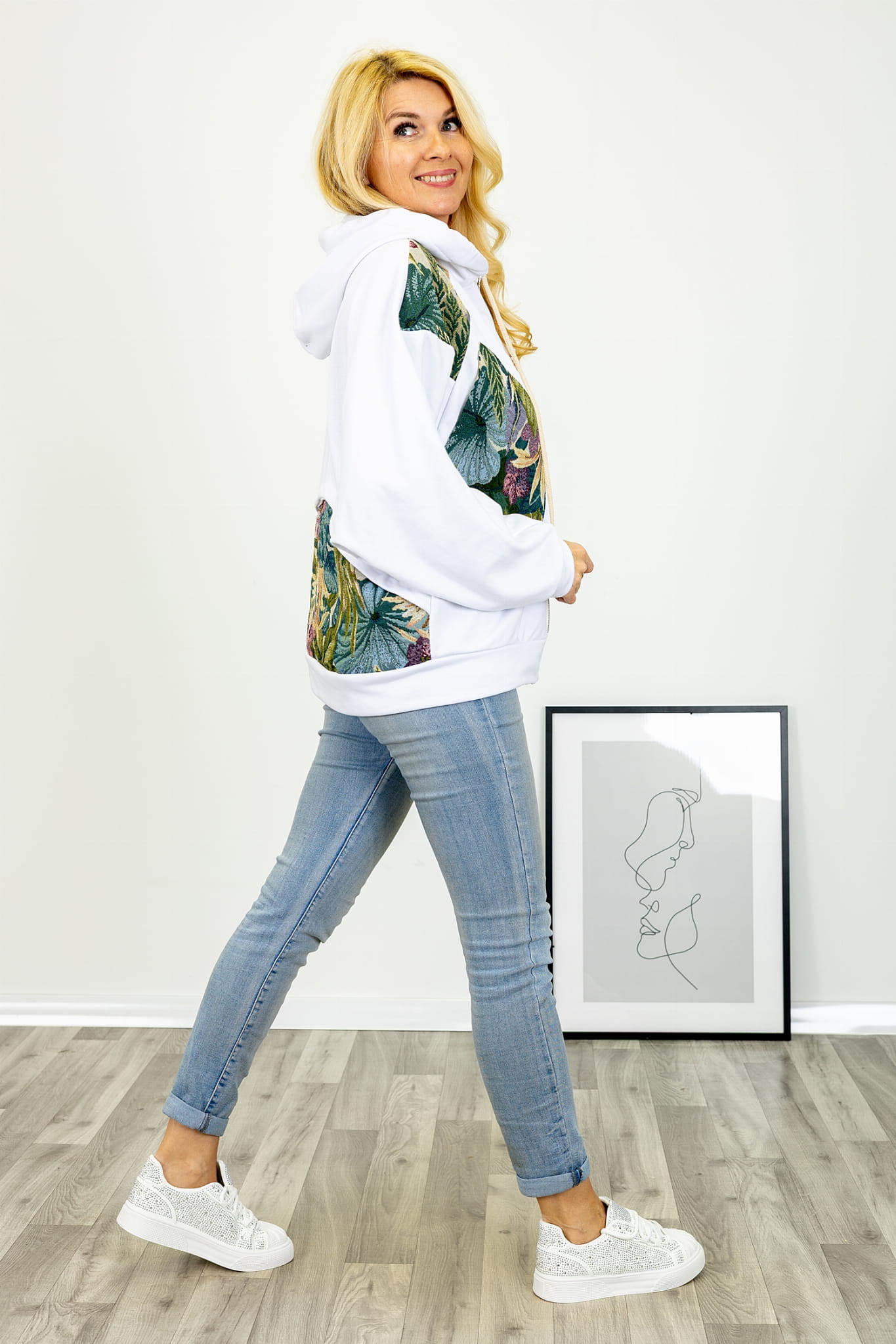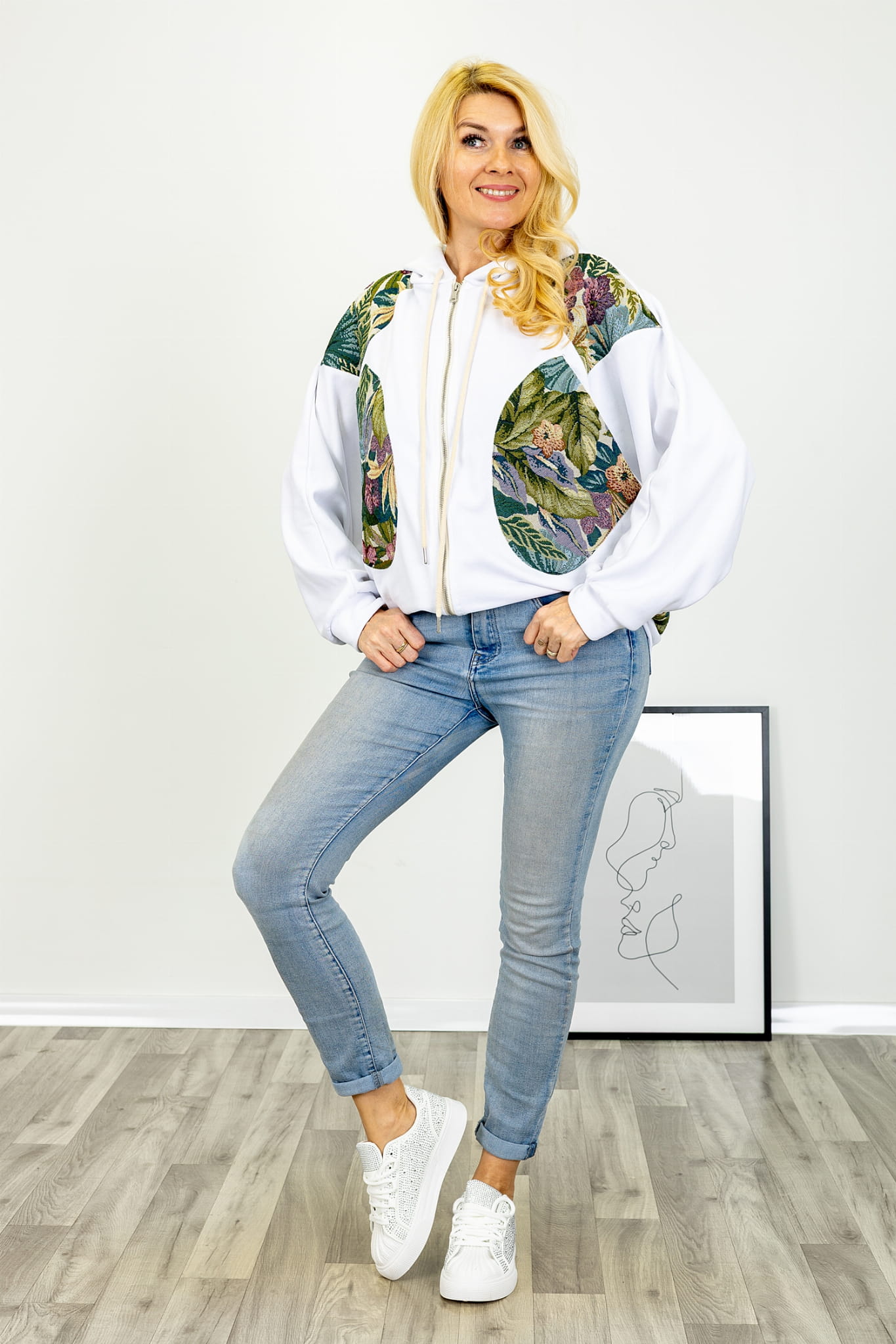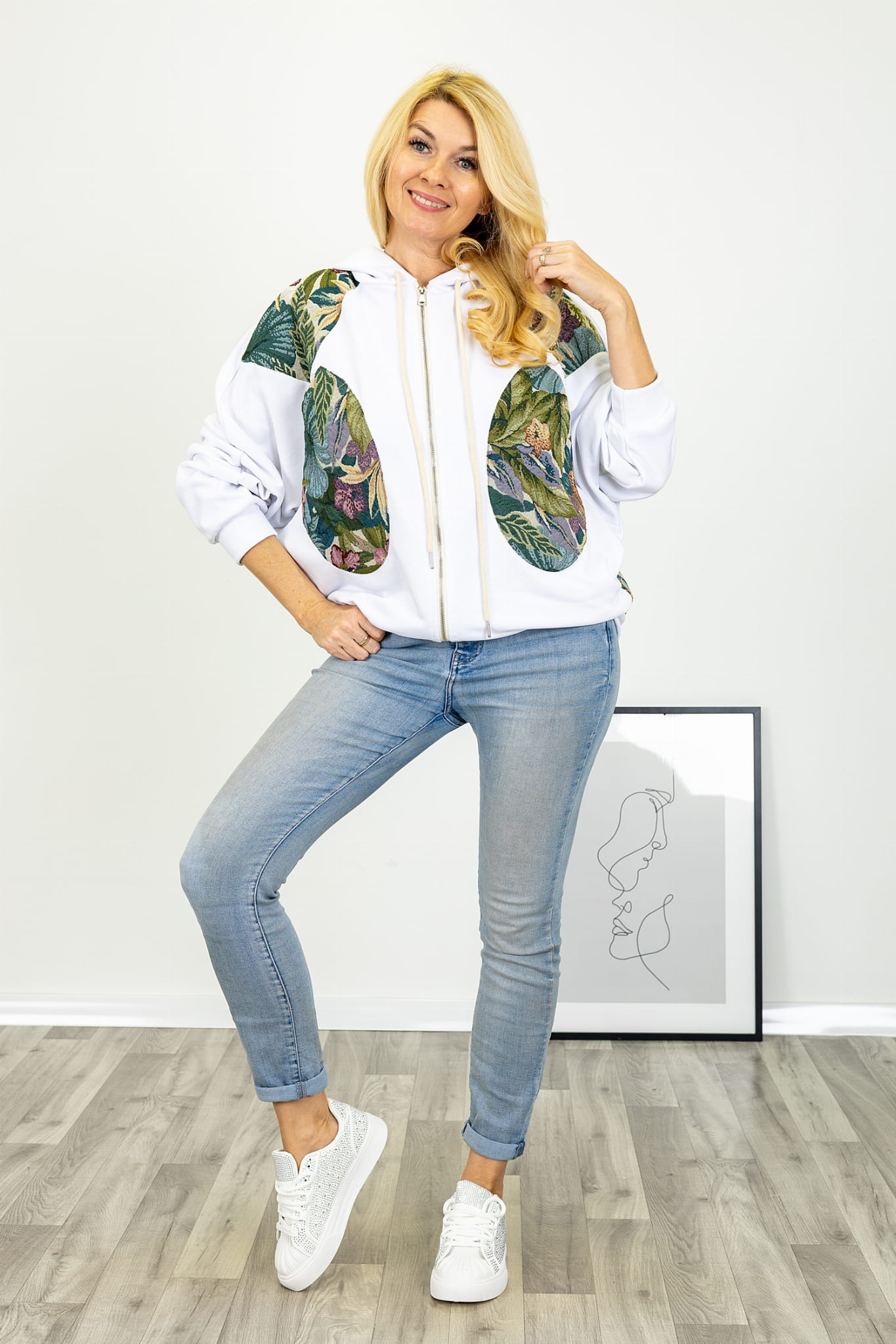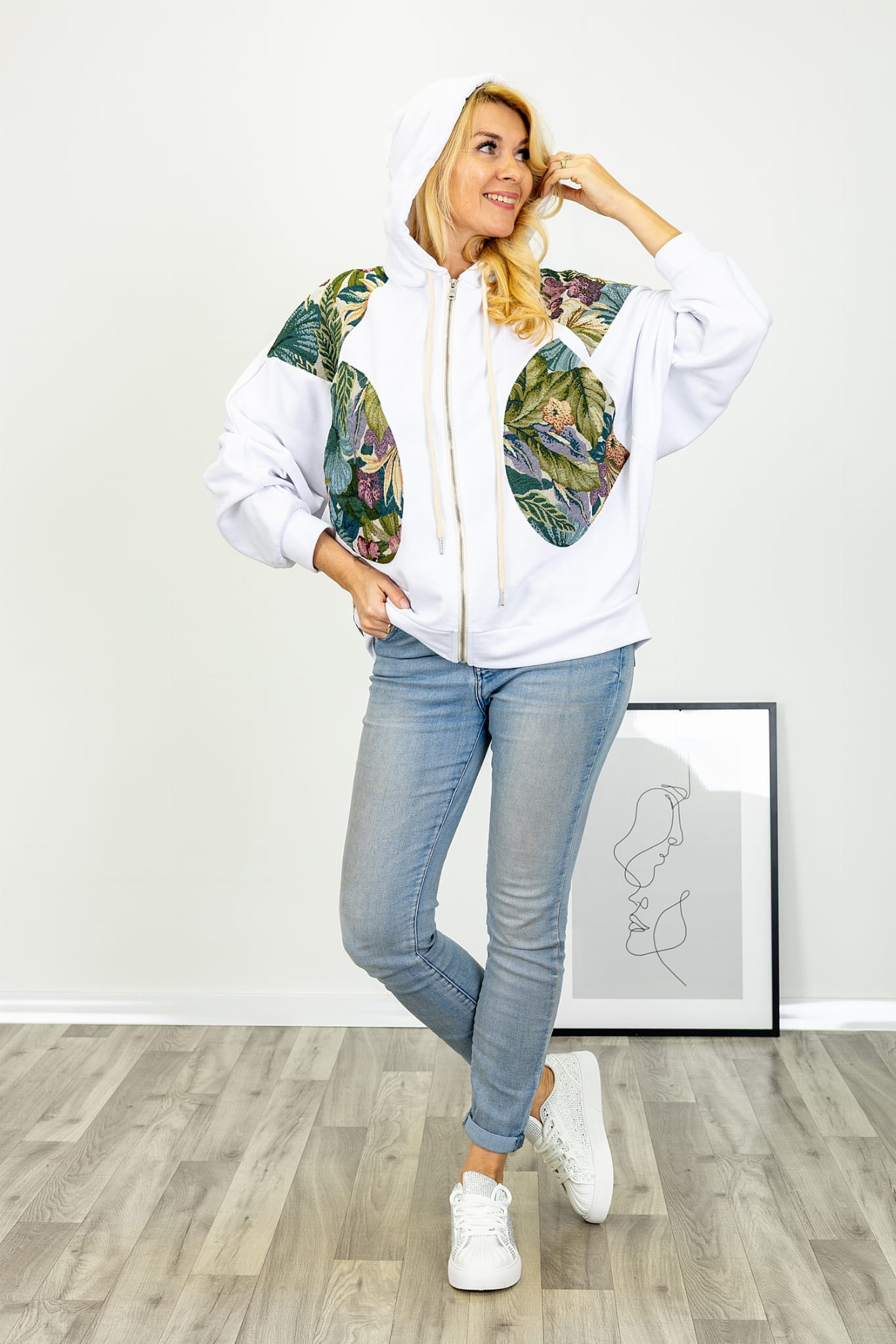 Bluza na suwak z kwiatowymi wstawkami duże kieszenie kaptur z troczkami Pinasca biała