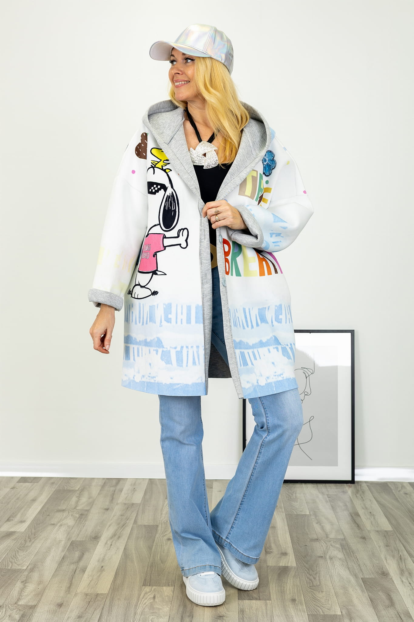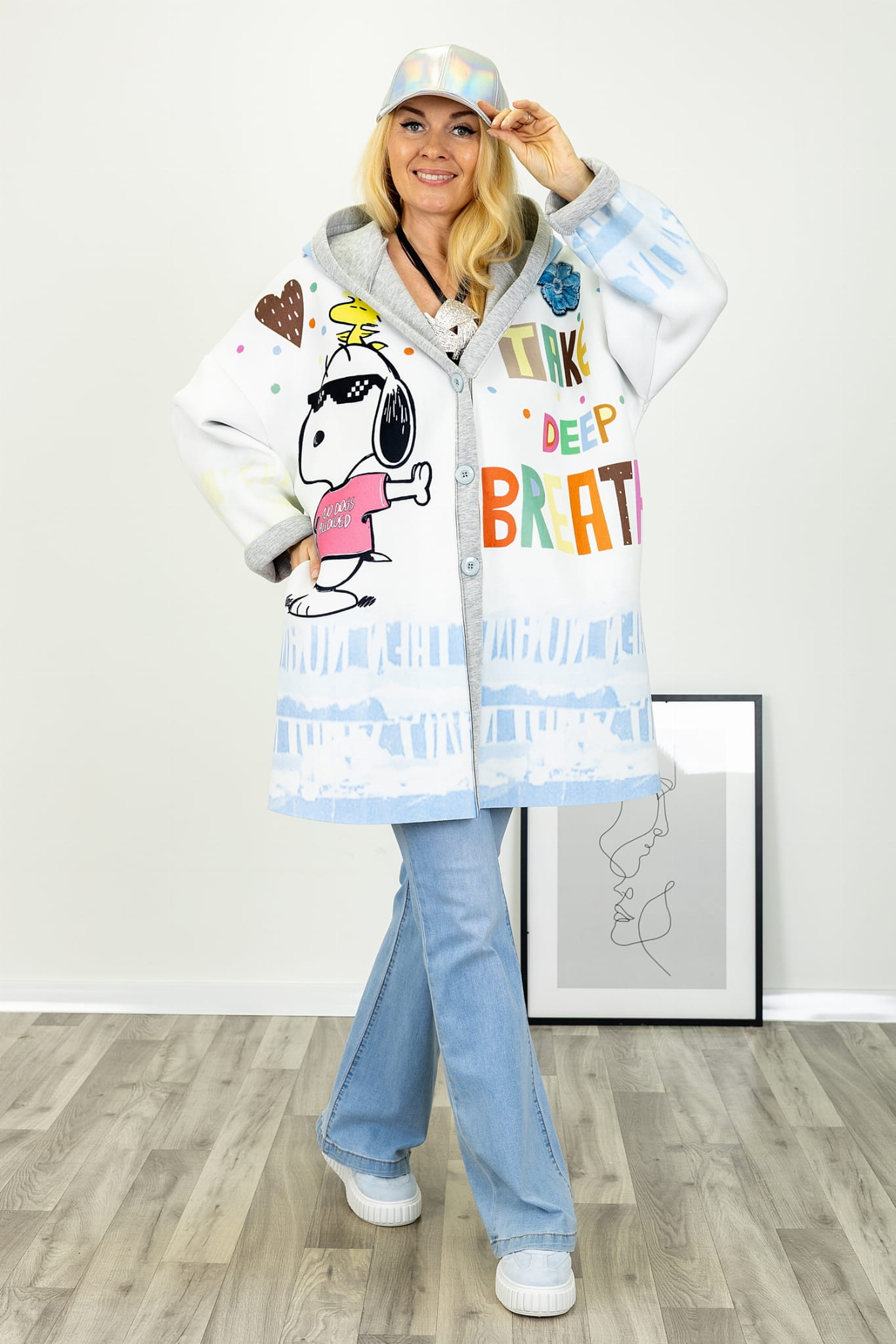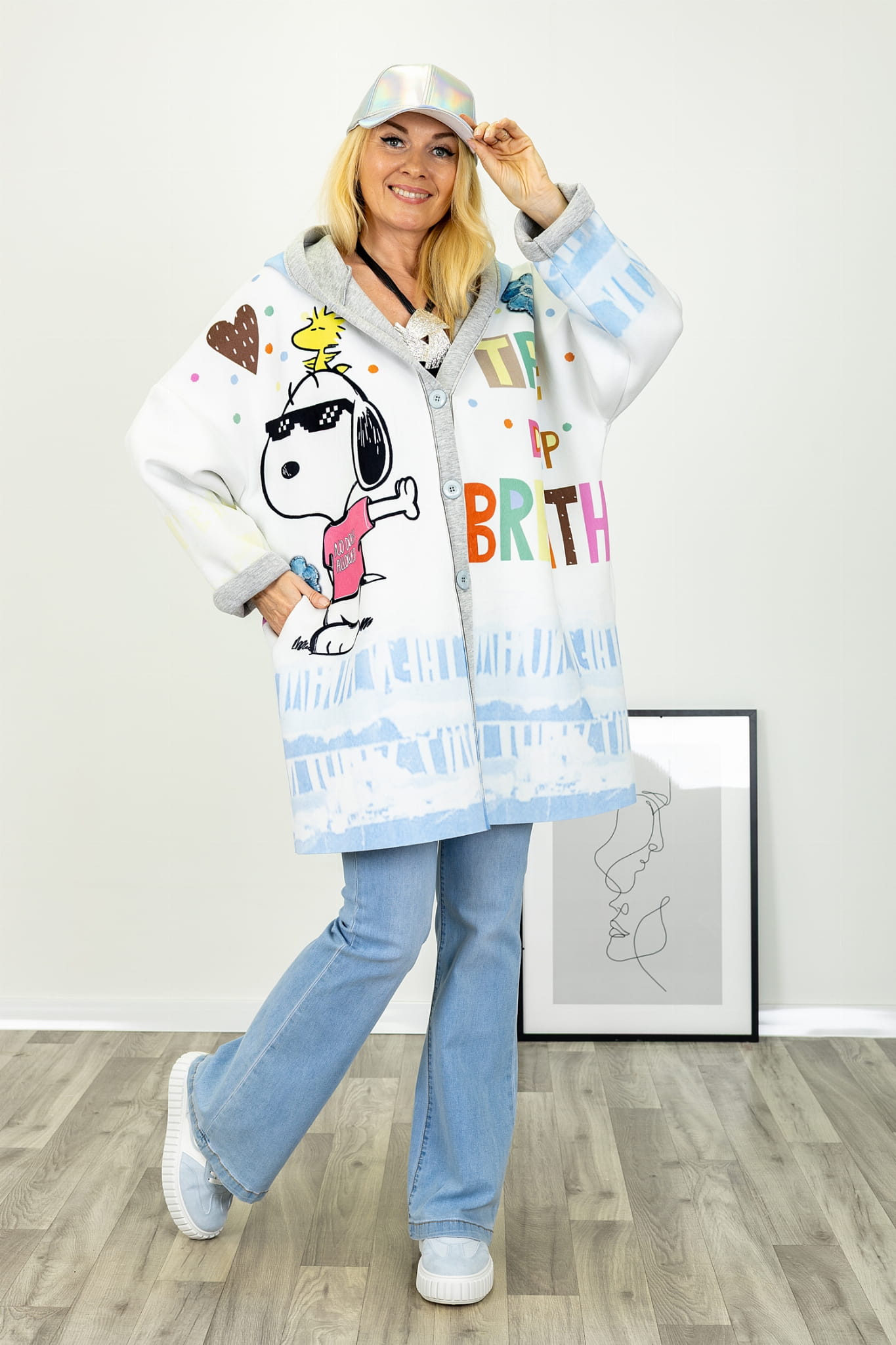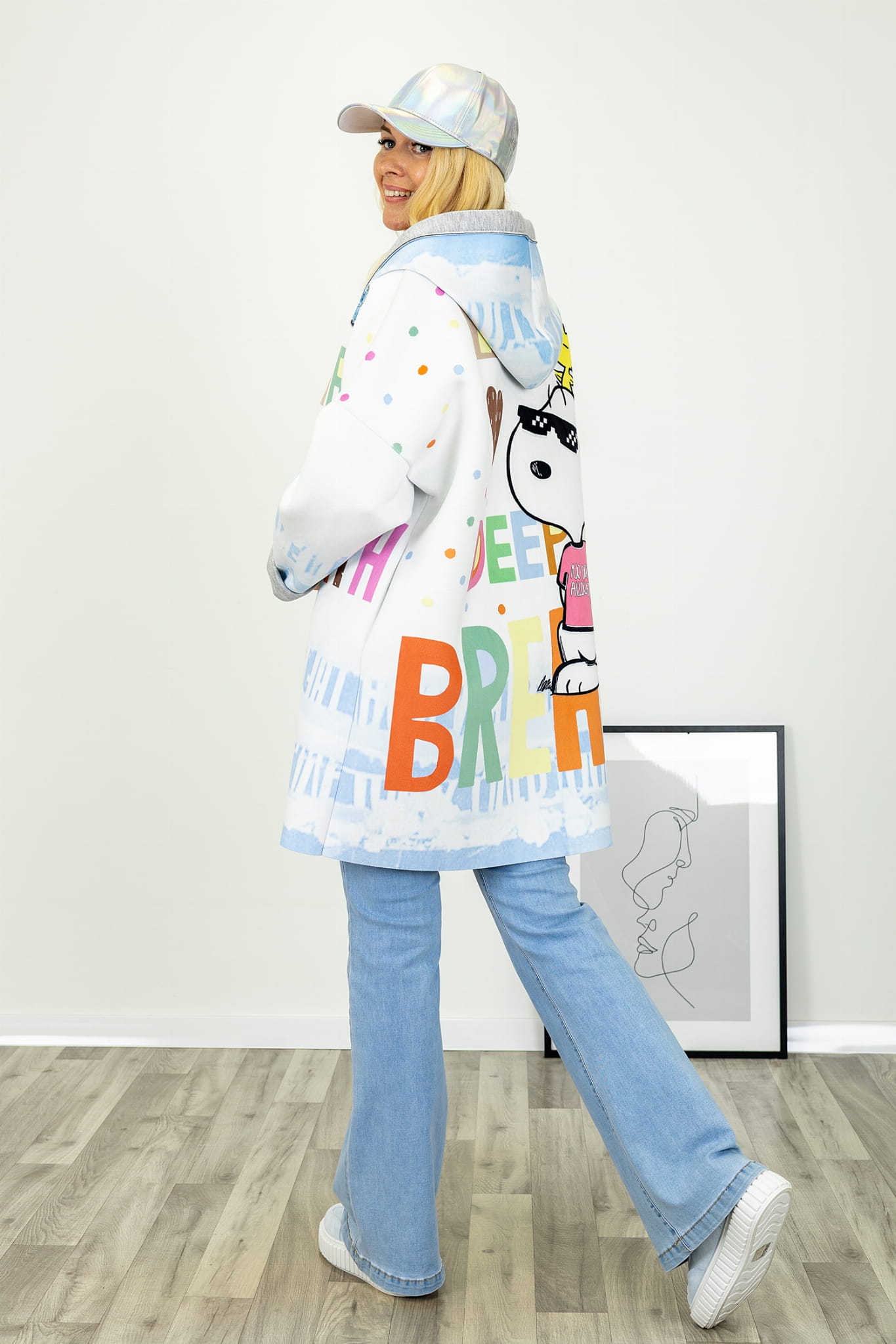 Kurteczka oversize z kapturem i kieszeniami kolorowy nadruk Tonara ecru piesek w okularach