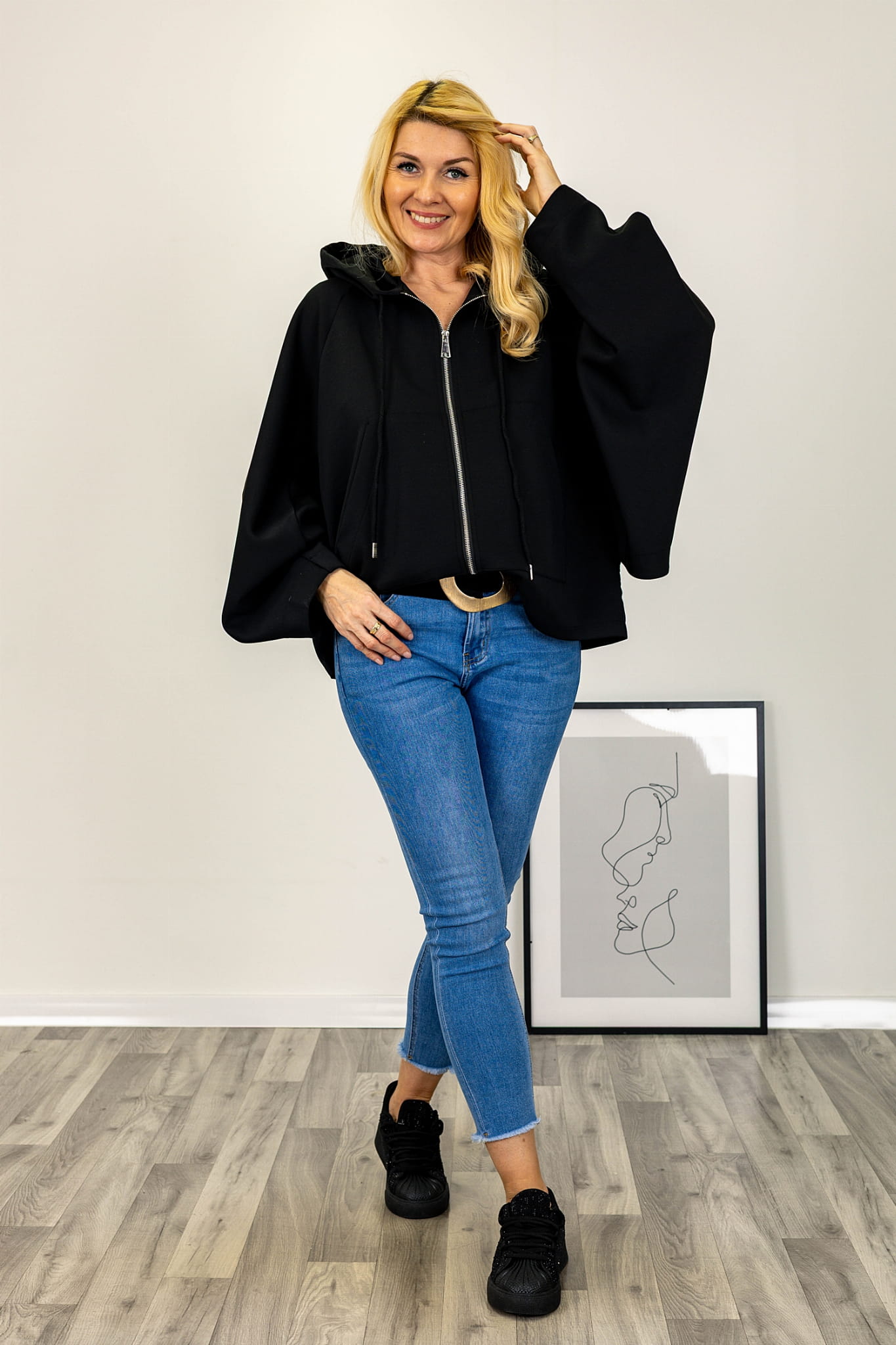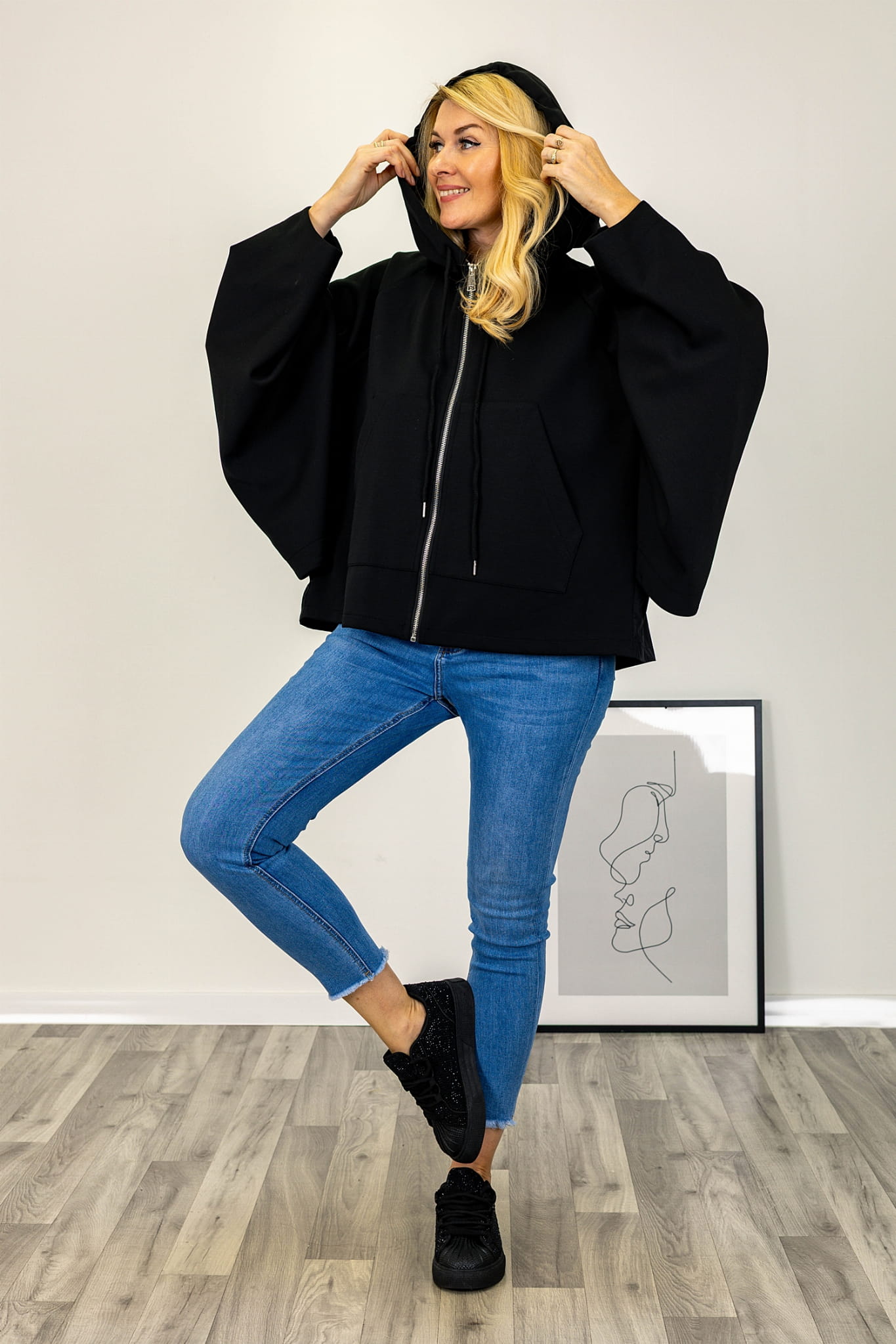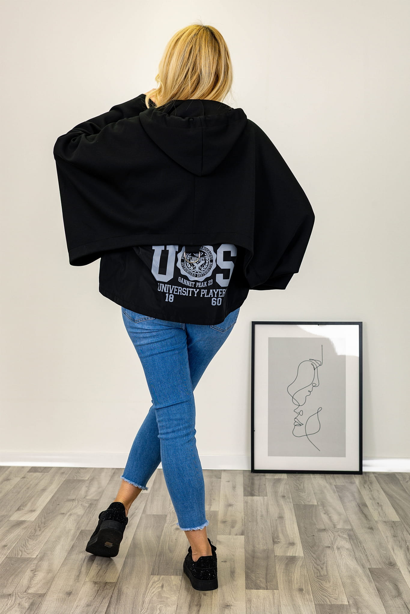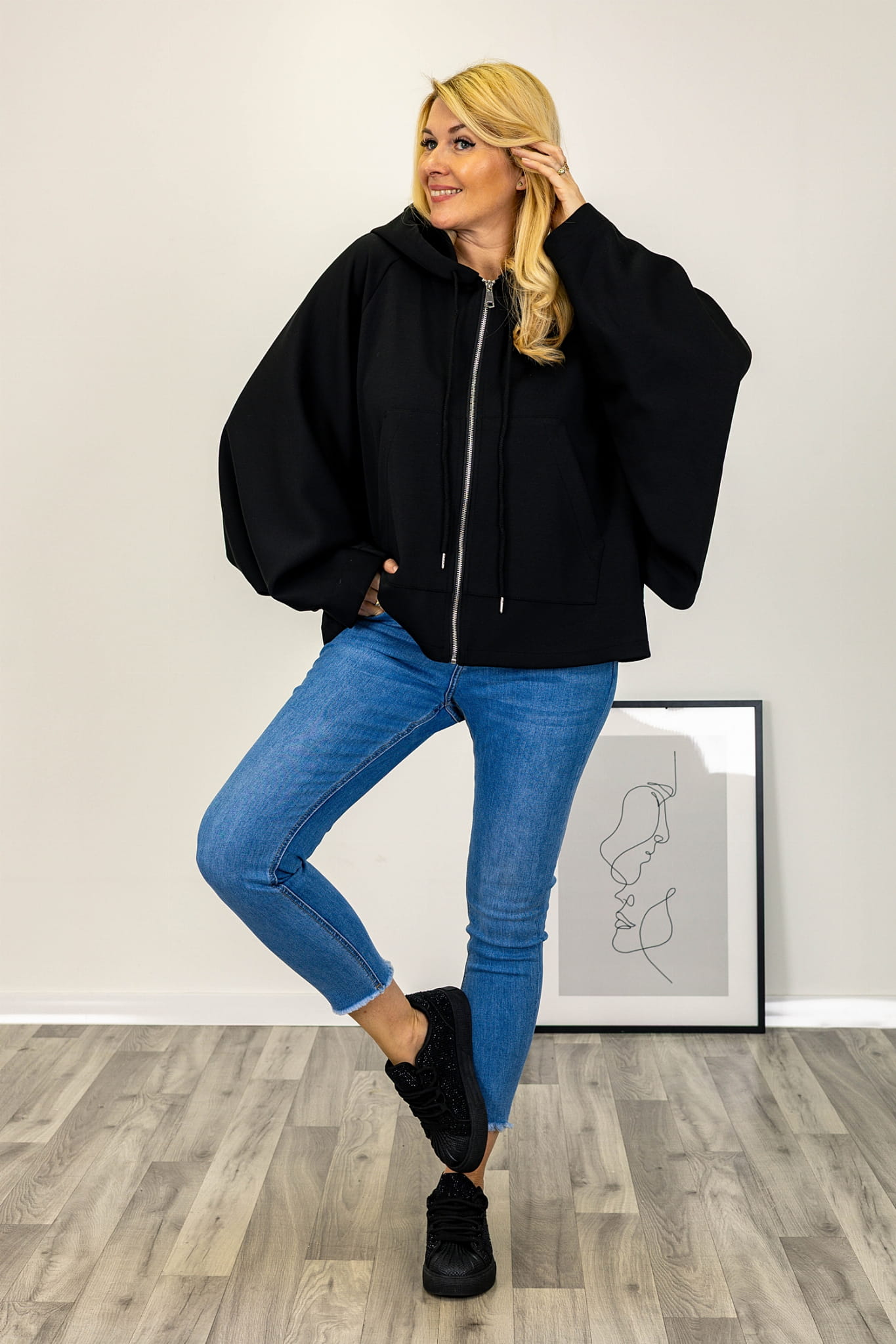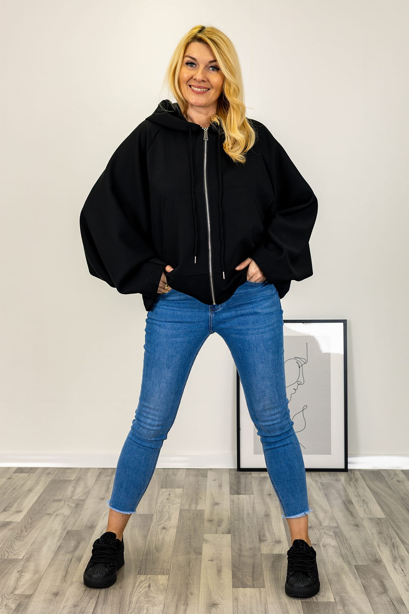 Asymetryczny fason z krótszym przodem i wydłużonym tyłem nadaje bluzie nowoczesną formę. Model zasuwany jest na suwak na całej długości przodu, co ułatwia użytkowanie. Kaptur z troczkami stanowi wyraźny element konstrukcyjny, a duże kieszenie umieszczone z przodu dodają całości praktycznego charakteru. Rękawy typu kimono są szerokie i swobodnie układają się na sylwetce, podkreślając luźny charakter modelu.