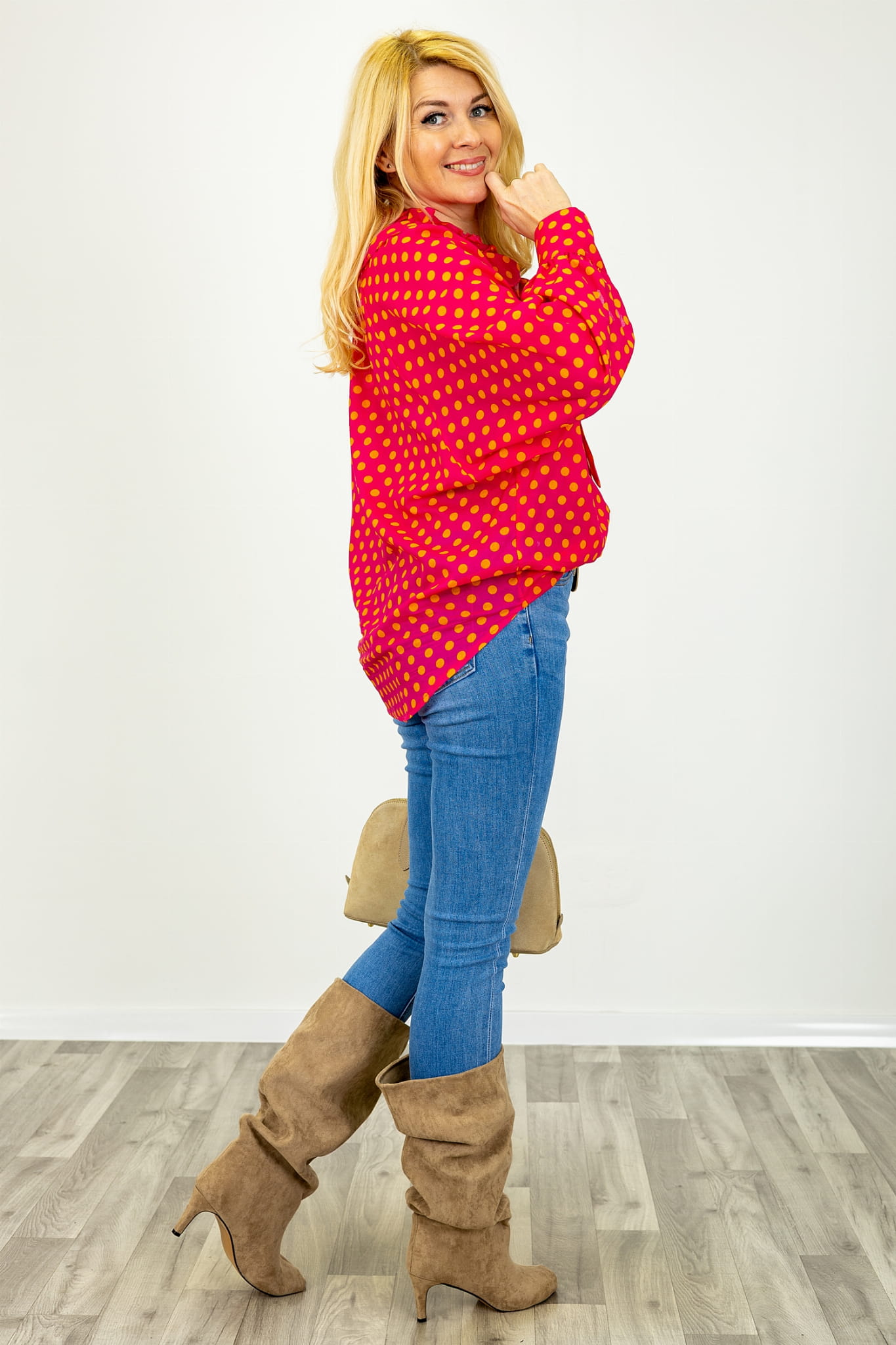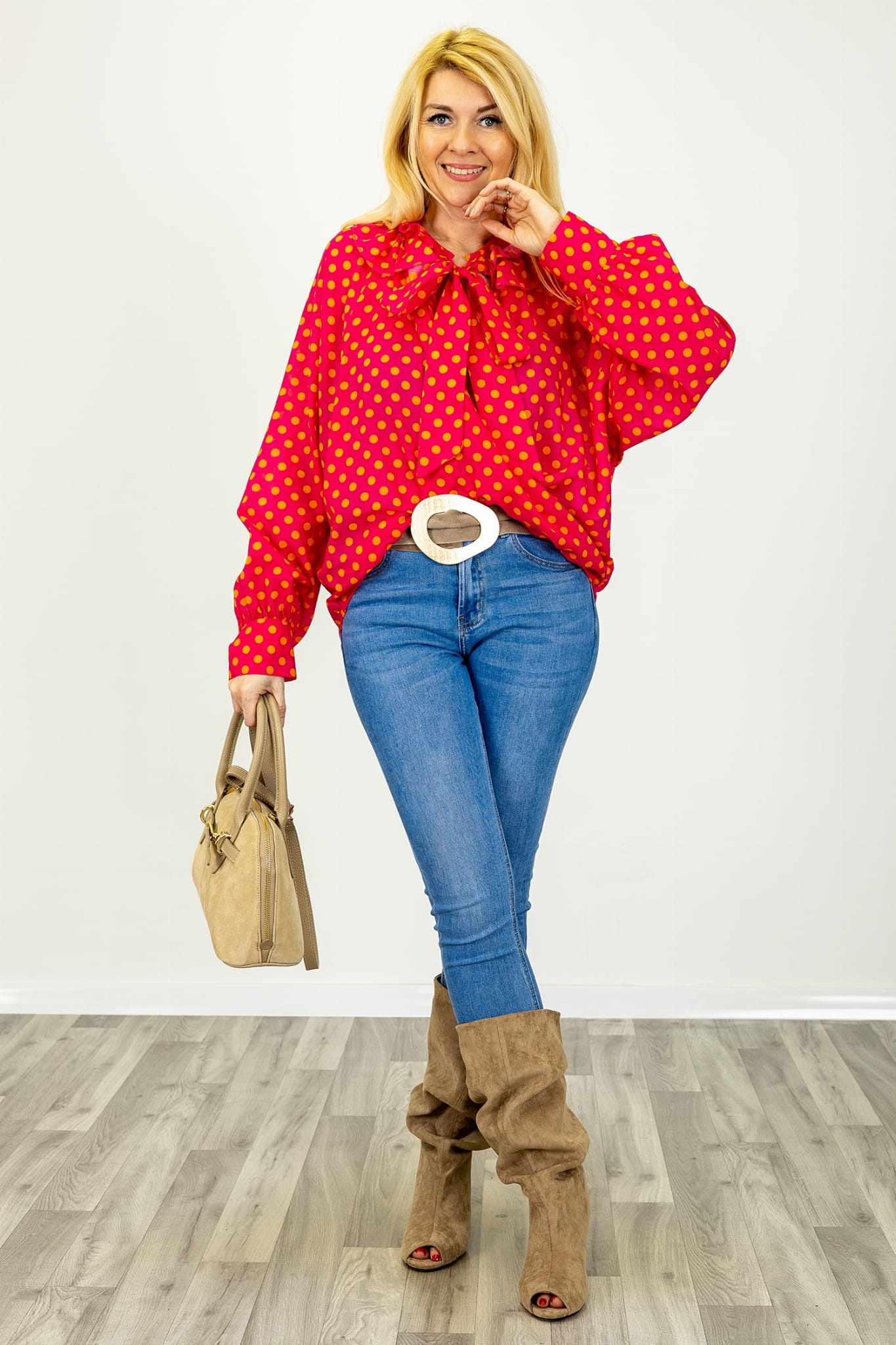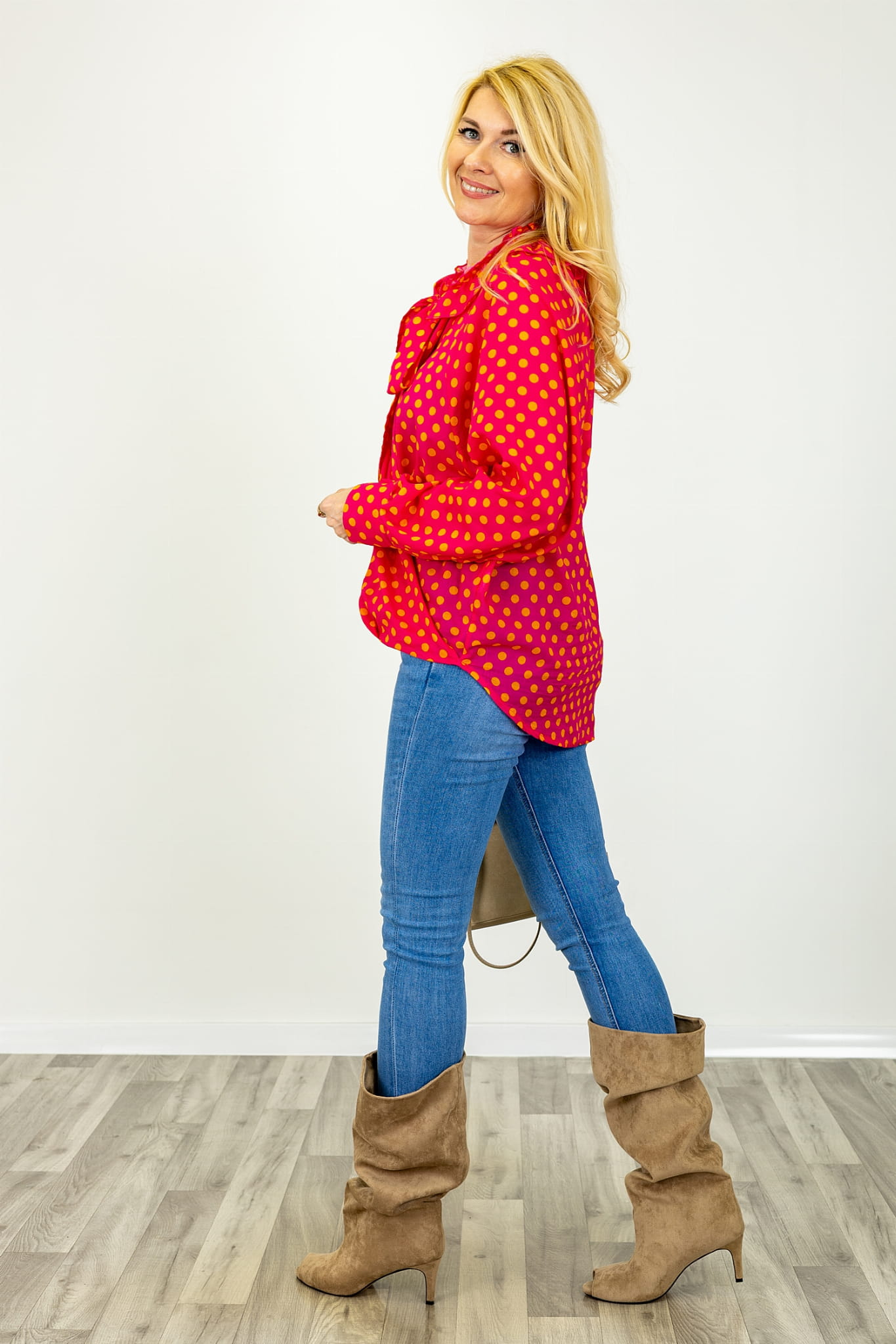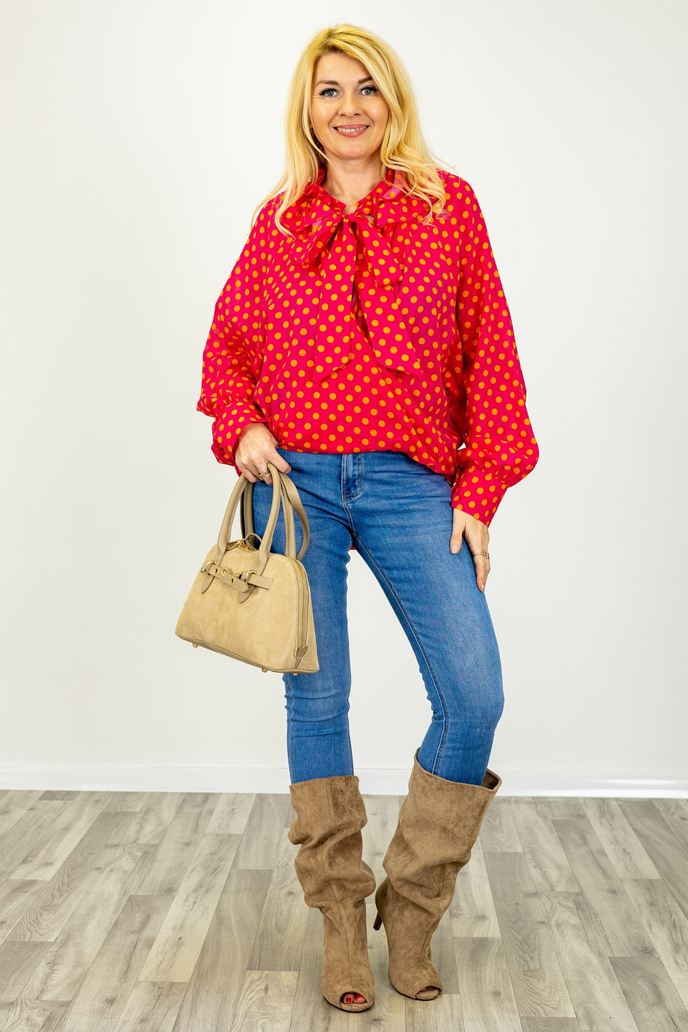 Bluzka asymetryczna w groszki z długim rękawem wiązany dekolt V z falbanką Predosa fuksja