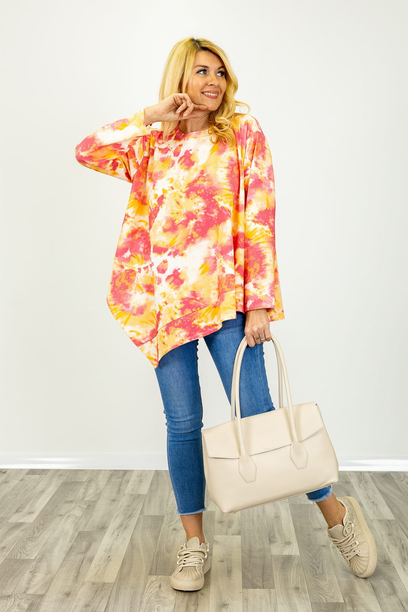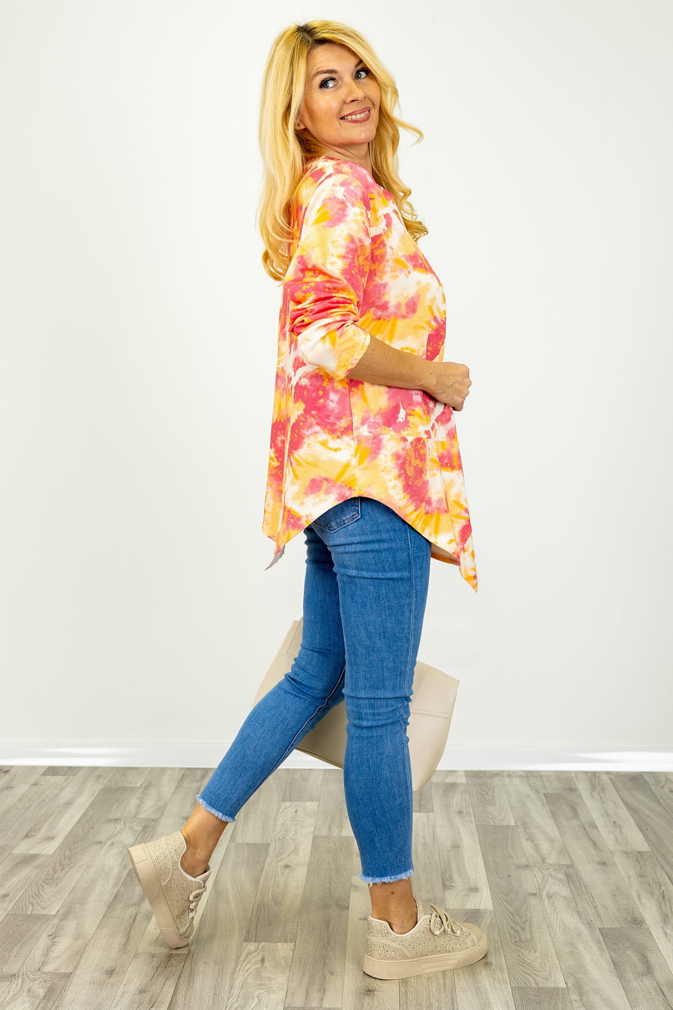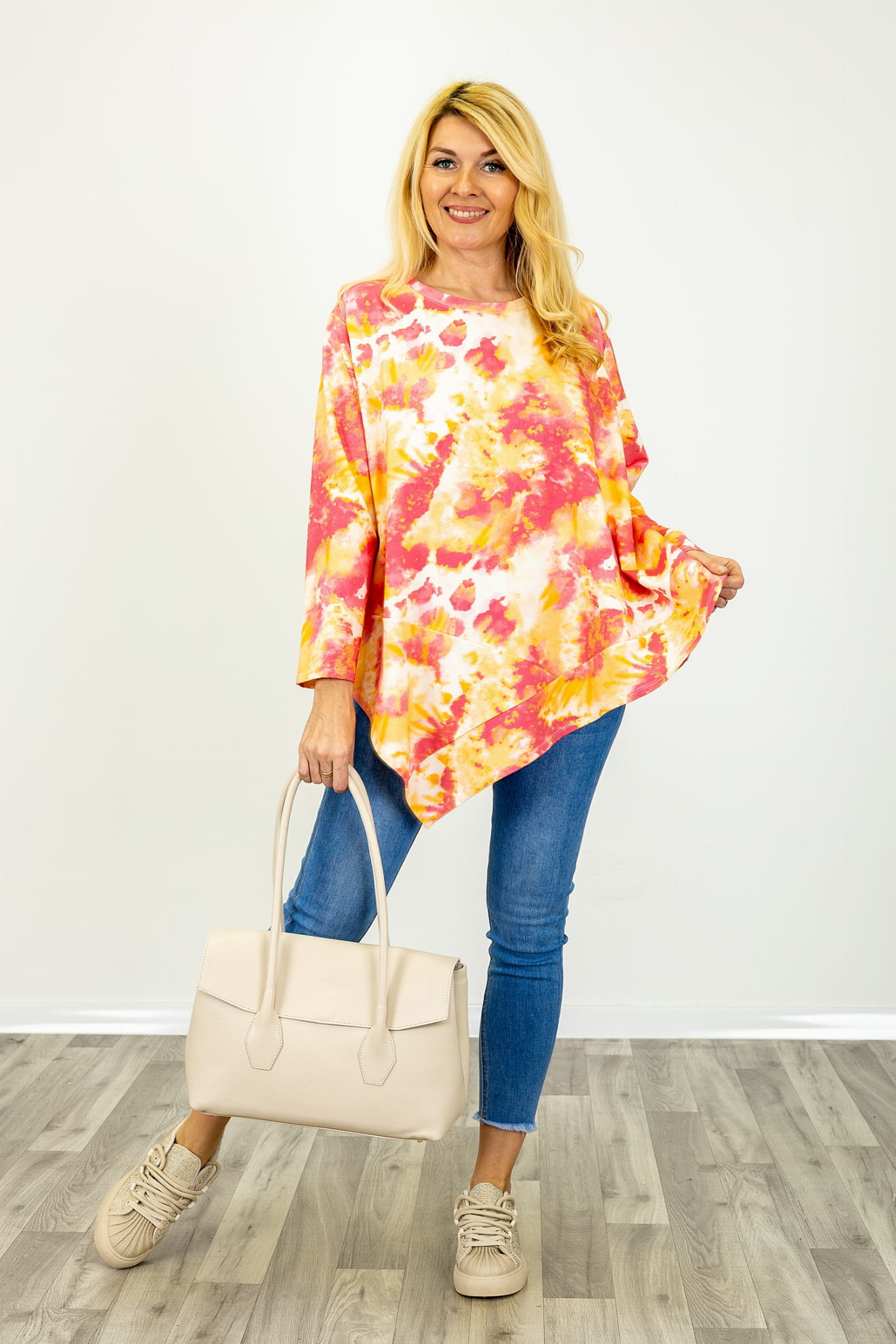 Bluzka została wykonana z dodatkiem elastanu i wykończona wzorem tie dye. Nadruk ten charakteryzuje się płynnymi przejściami tonalnymi oraz zróżnicowanym nasyceniem barw. Technika tie dye sprawia, że rozmieszczenie kolorów nie jest jednolite, a każdy element bluzki posiada indywidualny układ wzoru.