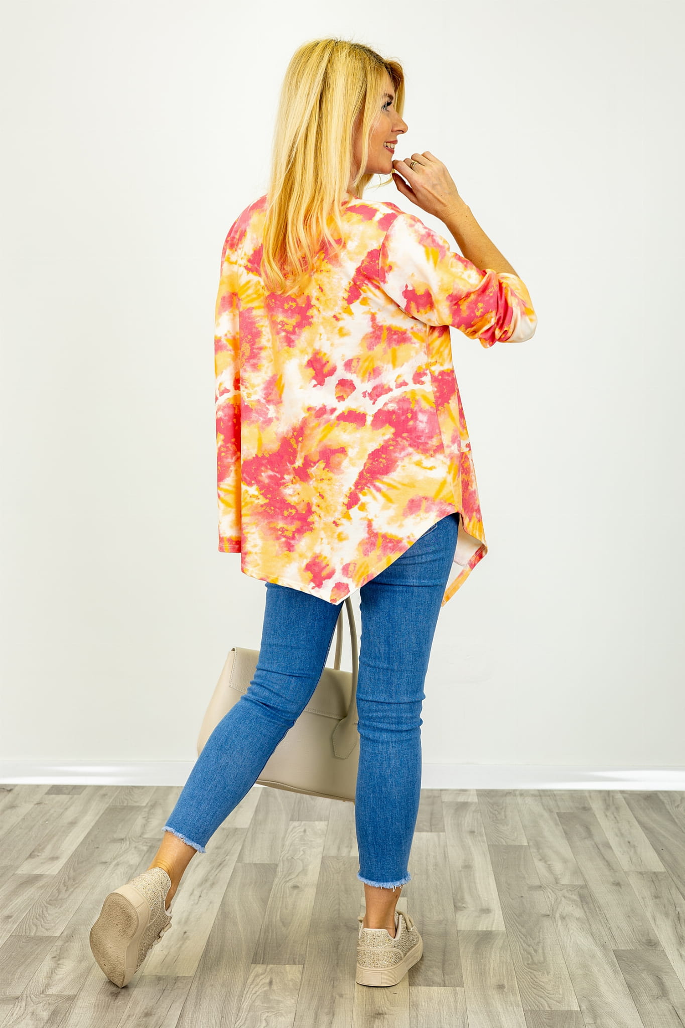 Bluzka asymetryczna z długim rękawem i nadrukiem tie dye Vallata koralowy z pomarańczowym