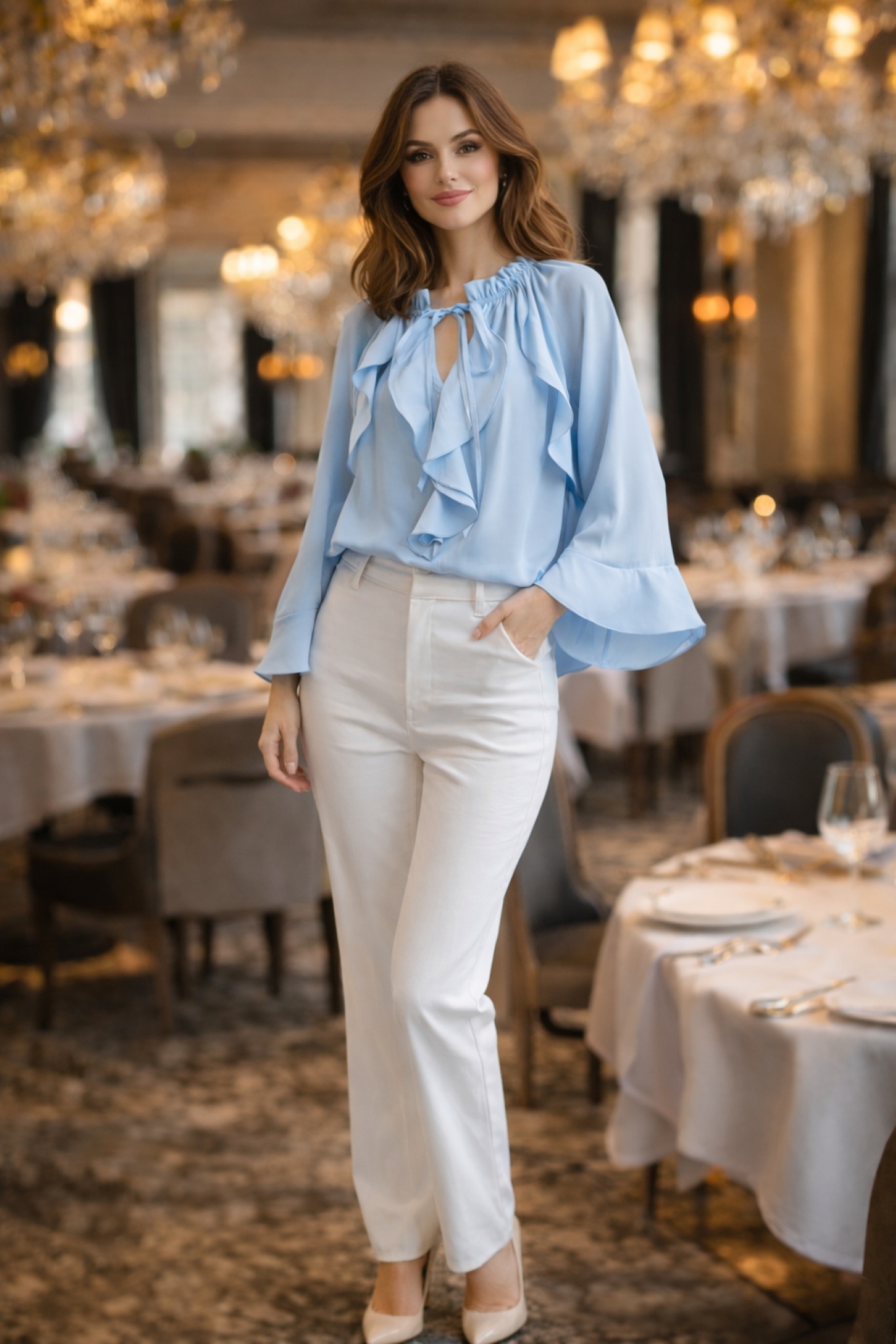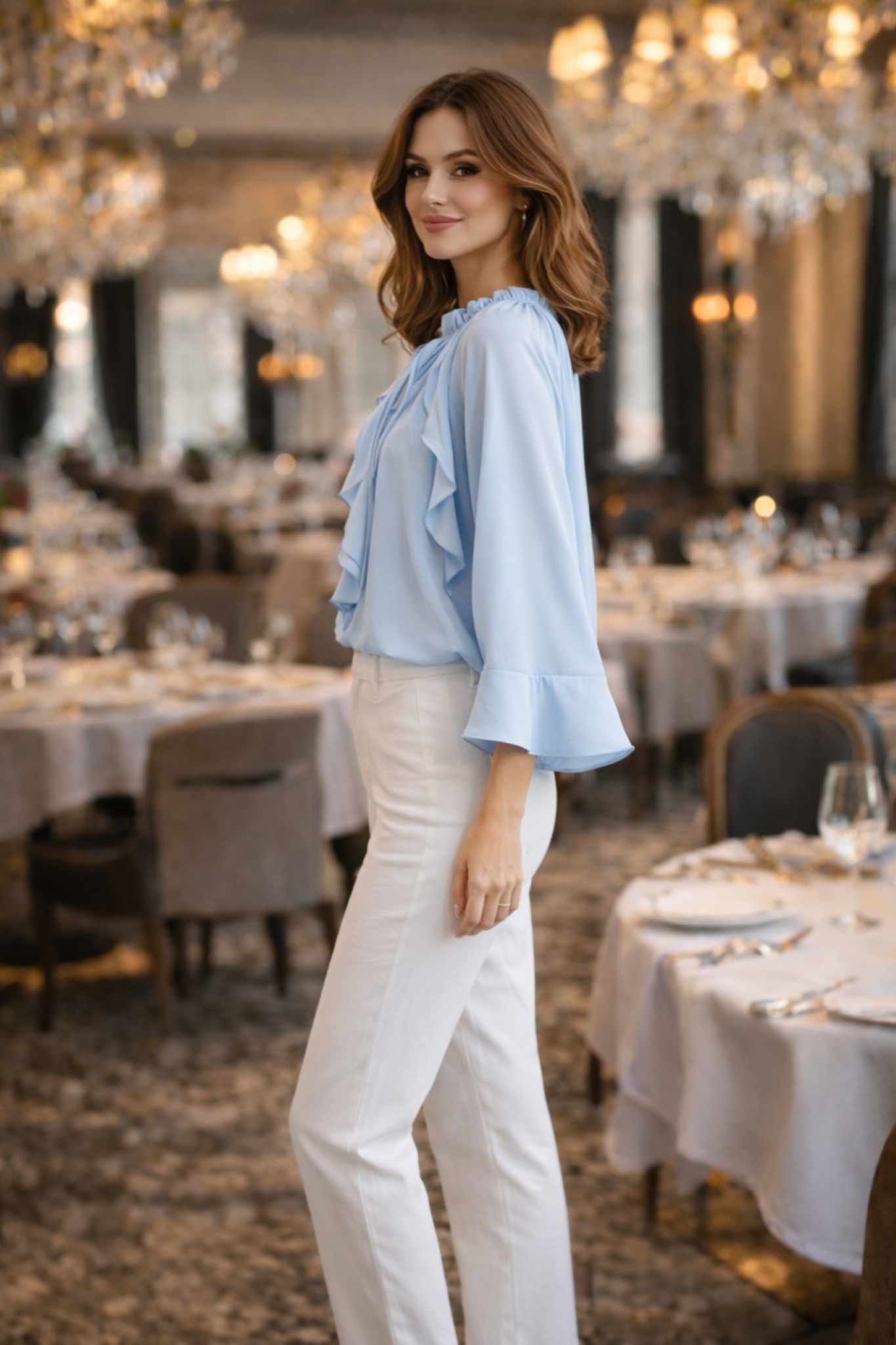 Wiązany dekolt w kształcie V subtelnie podkreśla szyję i ramiona, dlatego bluzka damska z dekoltem V świetnie sprawdza się zarówno w codziennych zestawach, jak i w bardziej eleganckich stylizacjach. To detal, który dodaje całości kobiecego, lekkiego charakteru bez przesadnej formalności.
