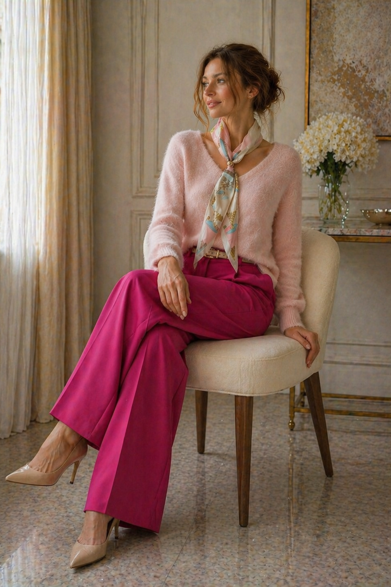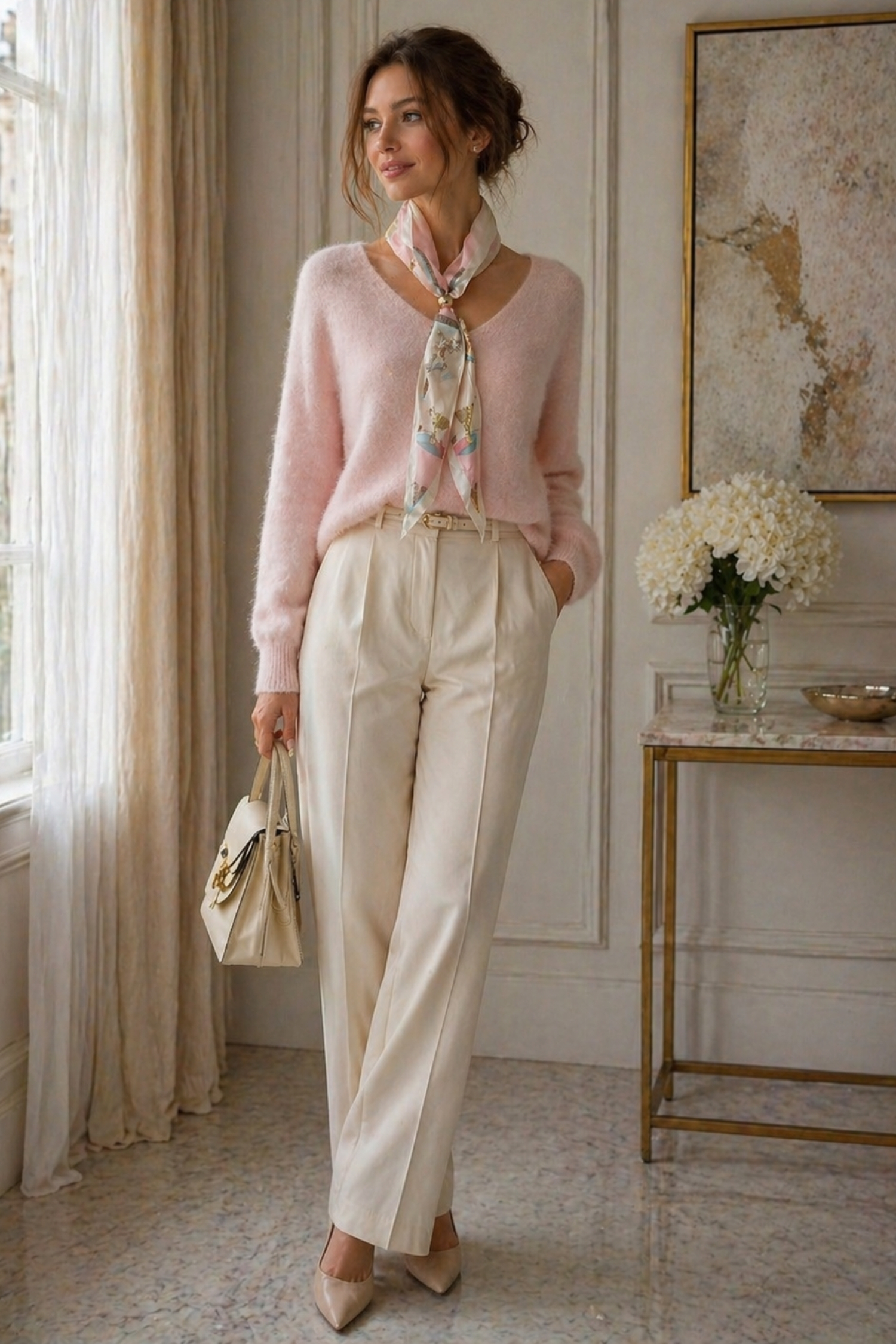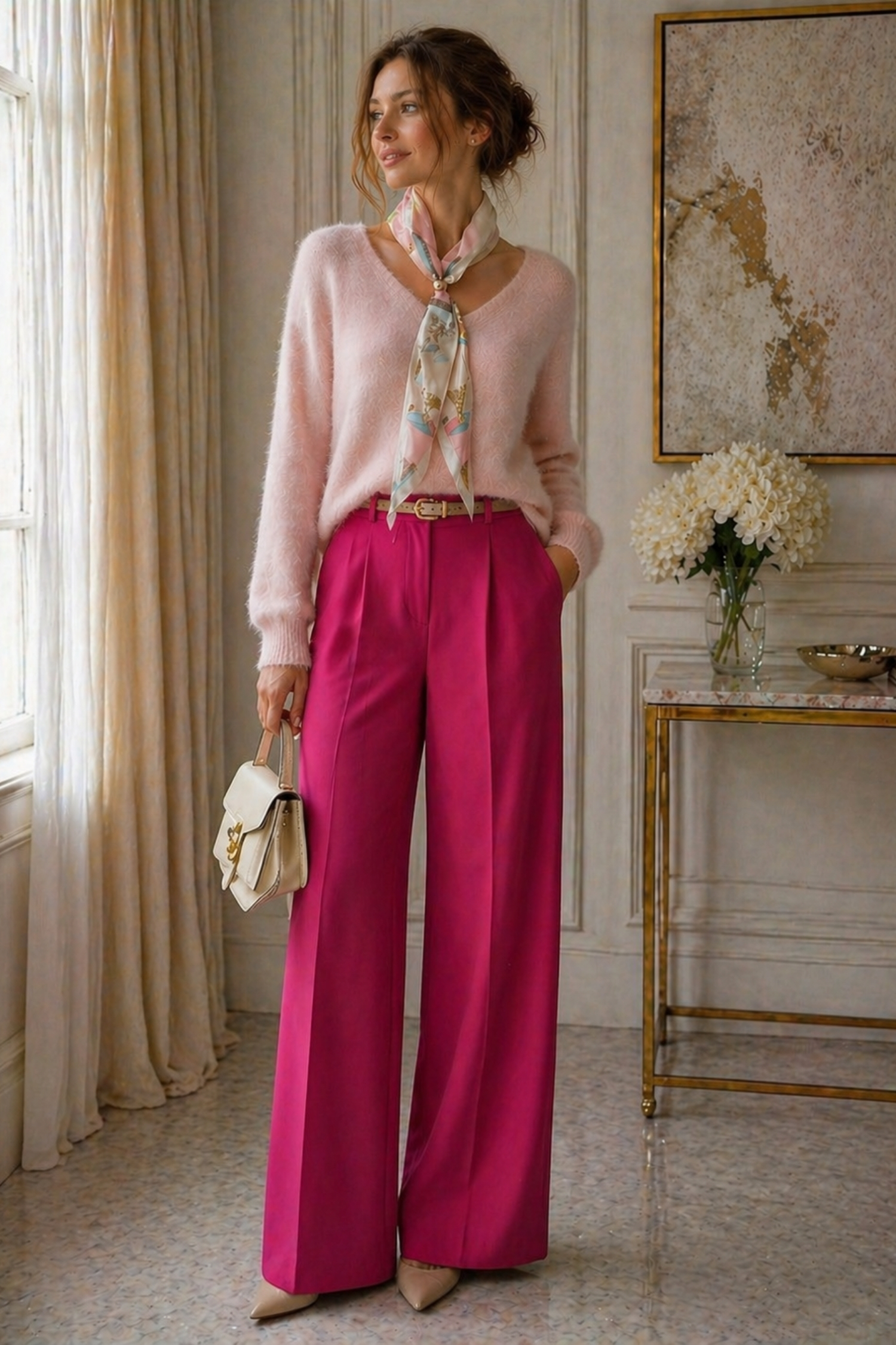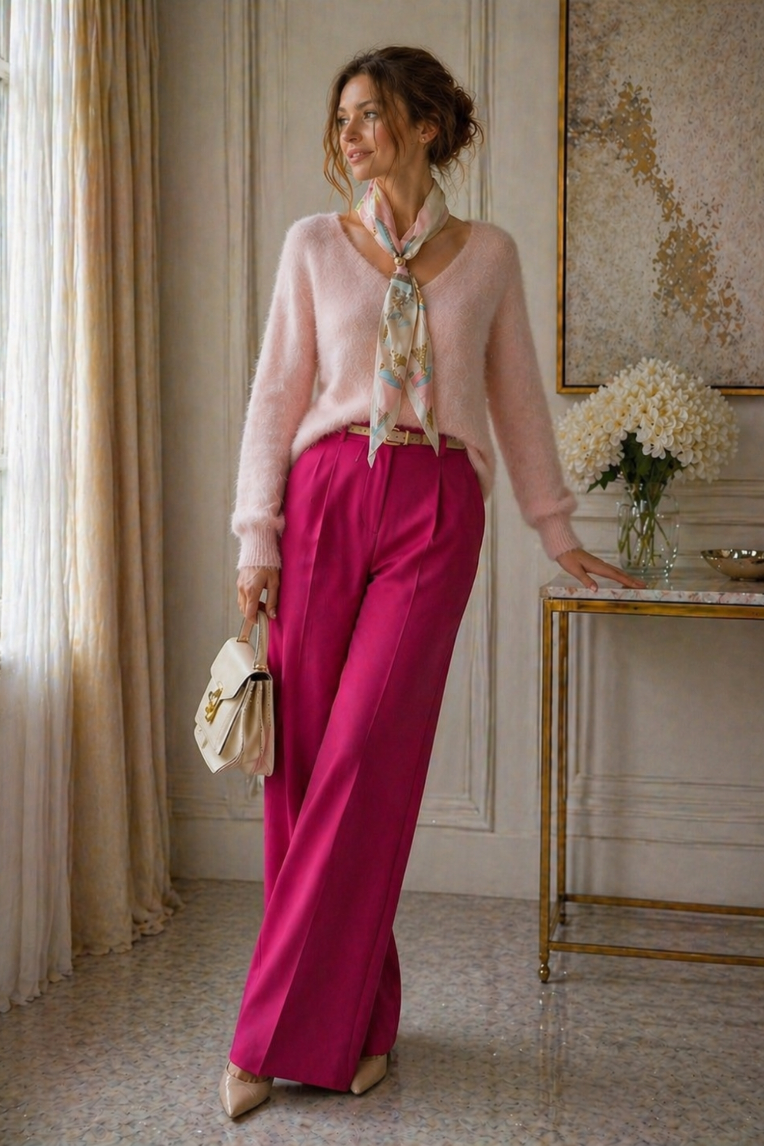 • bluzka pudrowo różowa z apaszką i dekoltem V optycznie wydłuża szyję i wysmukla górną część sylwetki