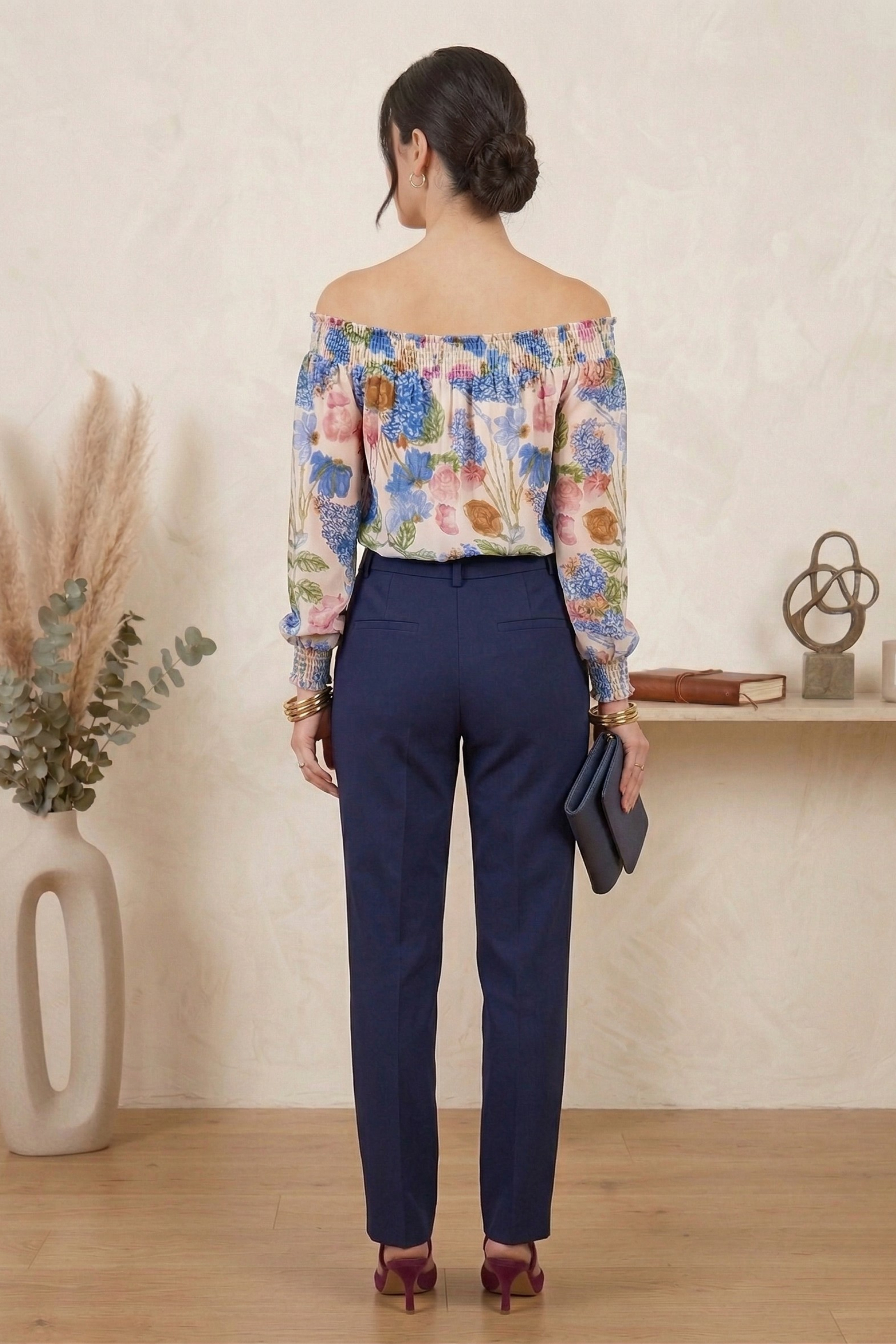 Bluzka hiszpanka beżowo niebieska w kwiaty, która podkreśla kobiecość i dodaje lekkości każdej stylizacji.