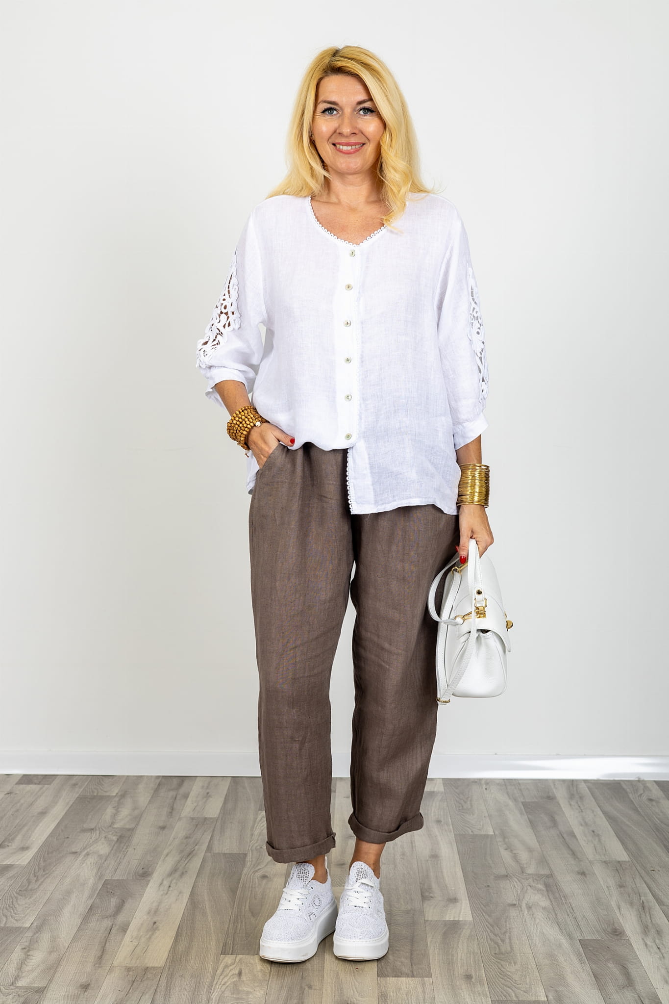 Bluzka lniana oversize damska asymetryczna zapinana na guziki z ozdobnym ażurem na rękawach Rubiana biała