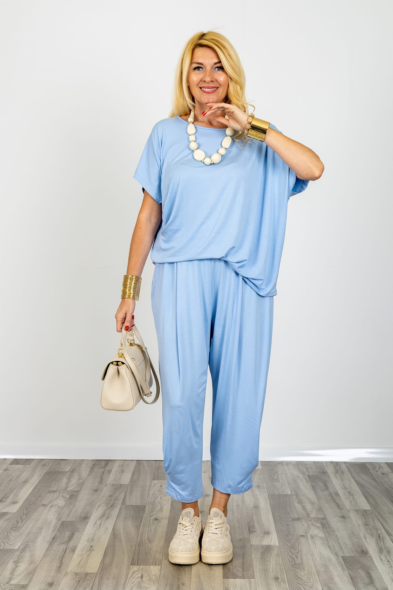 Bluzka mega oversize z krótkim rękawem okrągłym dekoltem przeszyciami i marszczeniami na boku Smerillo błękitna