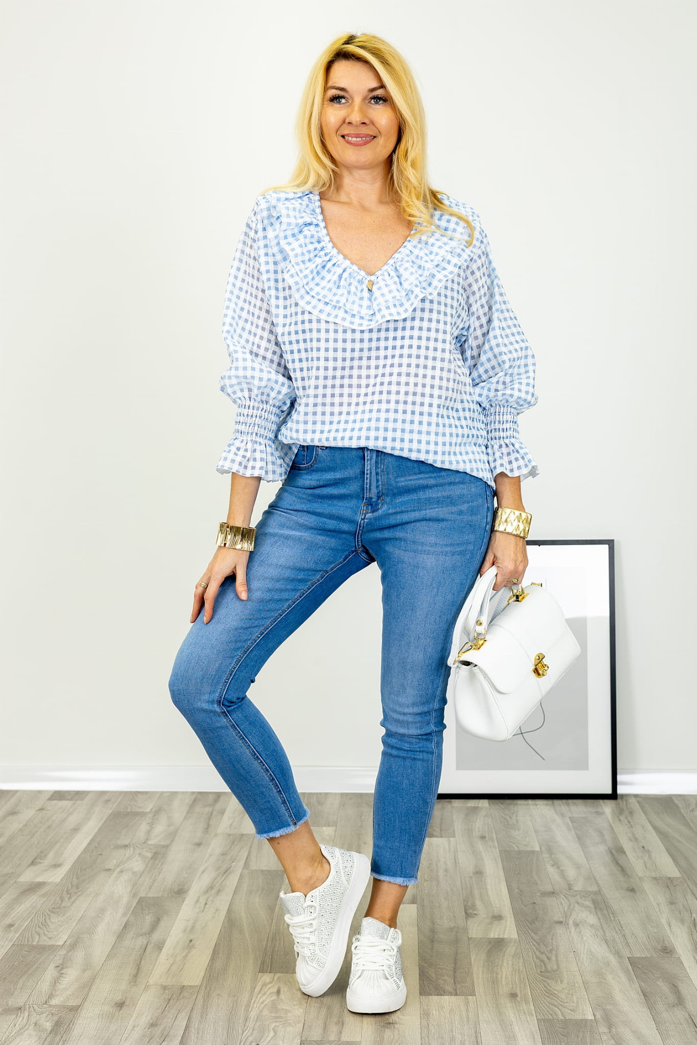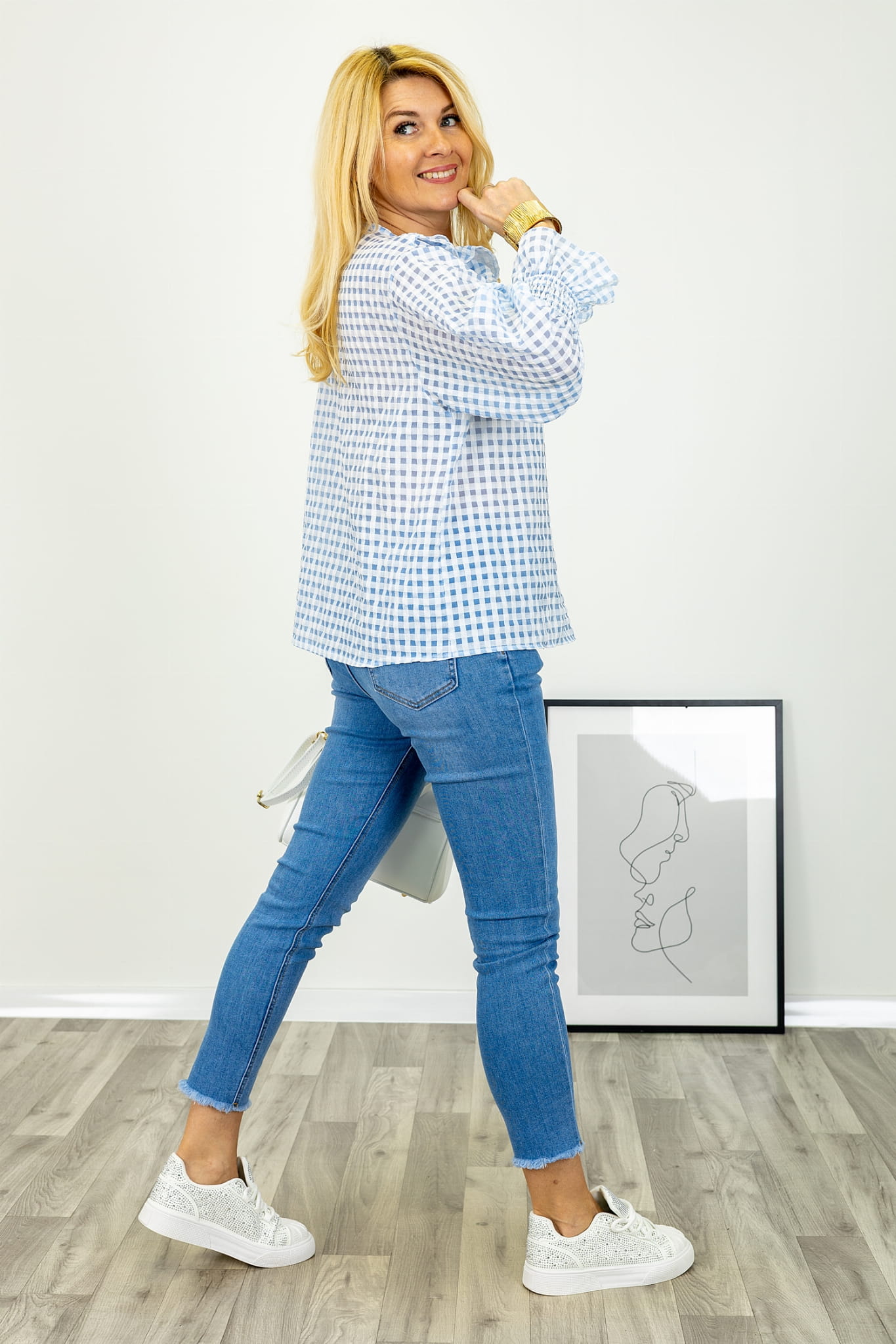 Bluzka w kratkę z falbanką przy dekolcie i rękawach zakończonych marszczeniem Summonte błękitna w białą kratkę