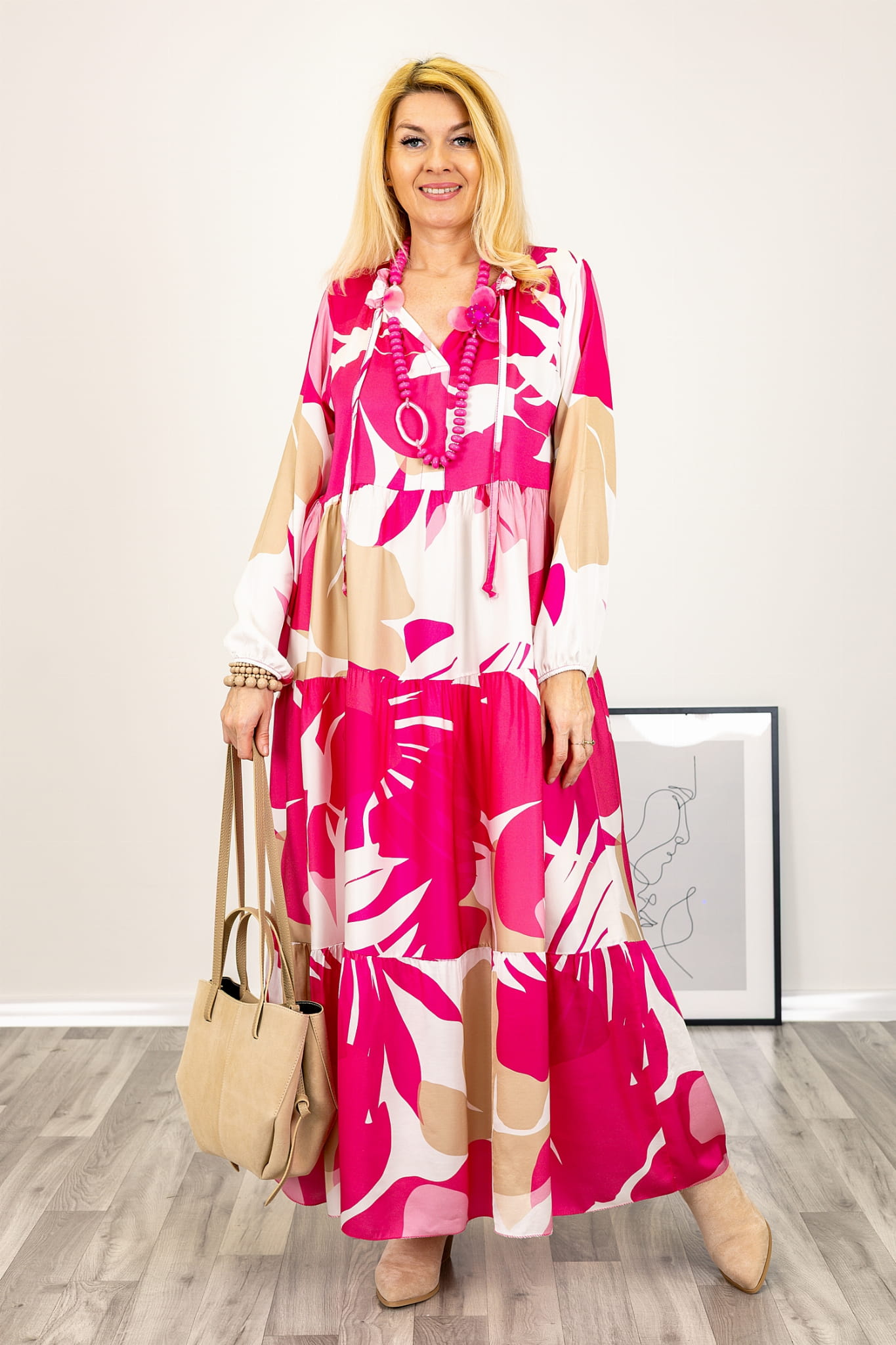 Jedwabna wzorzysta sukienka Sanremoa maxi fuksja