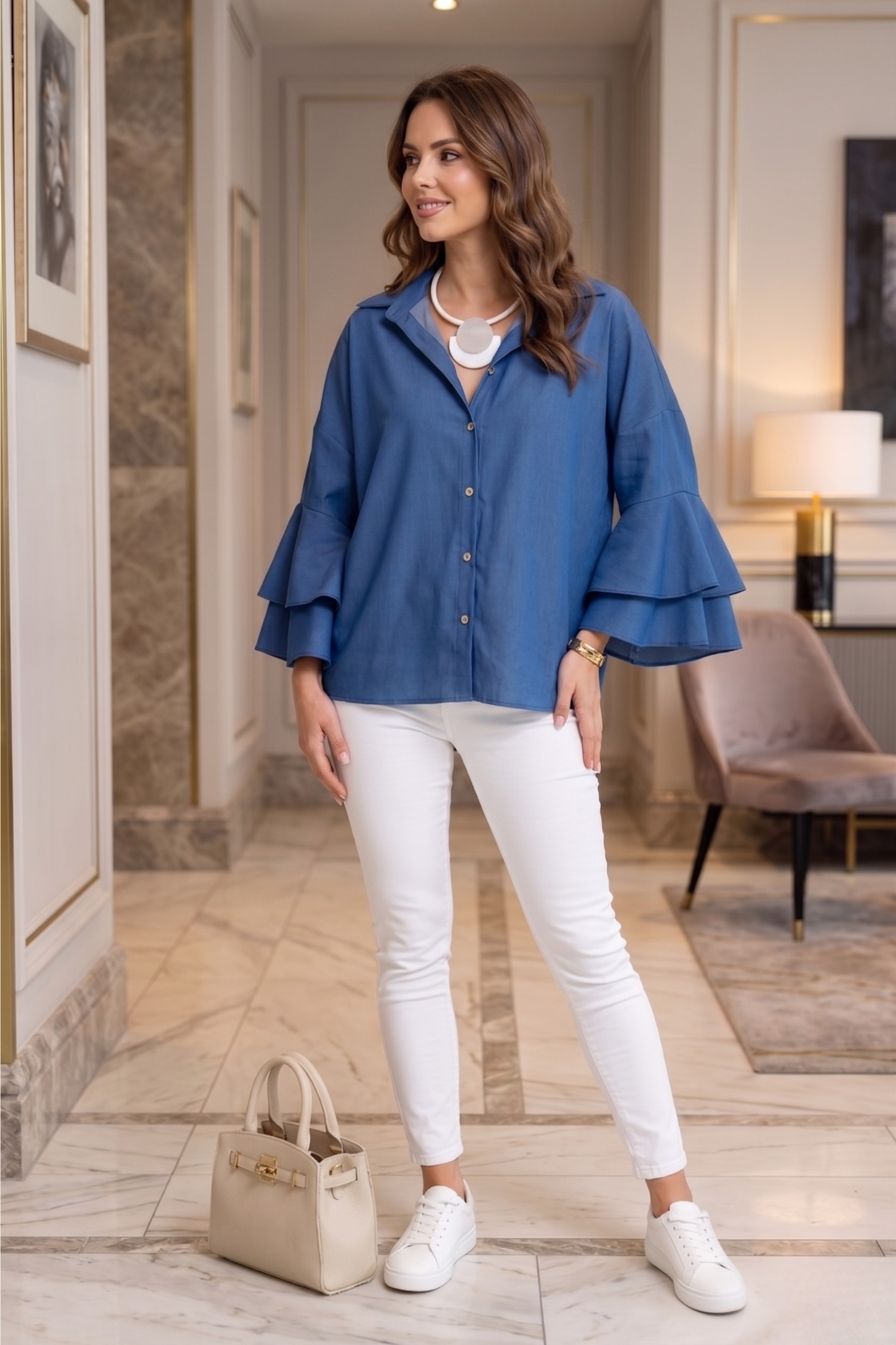 Koszula oversize z falbanami rękawy zyskuje bardziej wyrazisty charakter dzięki objętości i ruchowi materiału. To detal, który przyciąga uwagę i sprawia, że całość wygląda ciekawiej niż klasyczna forma.