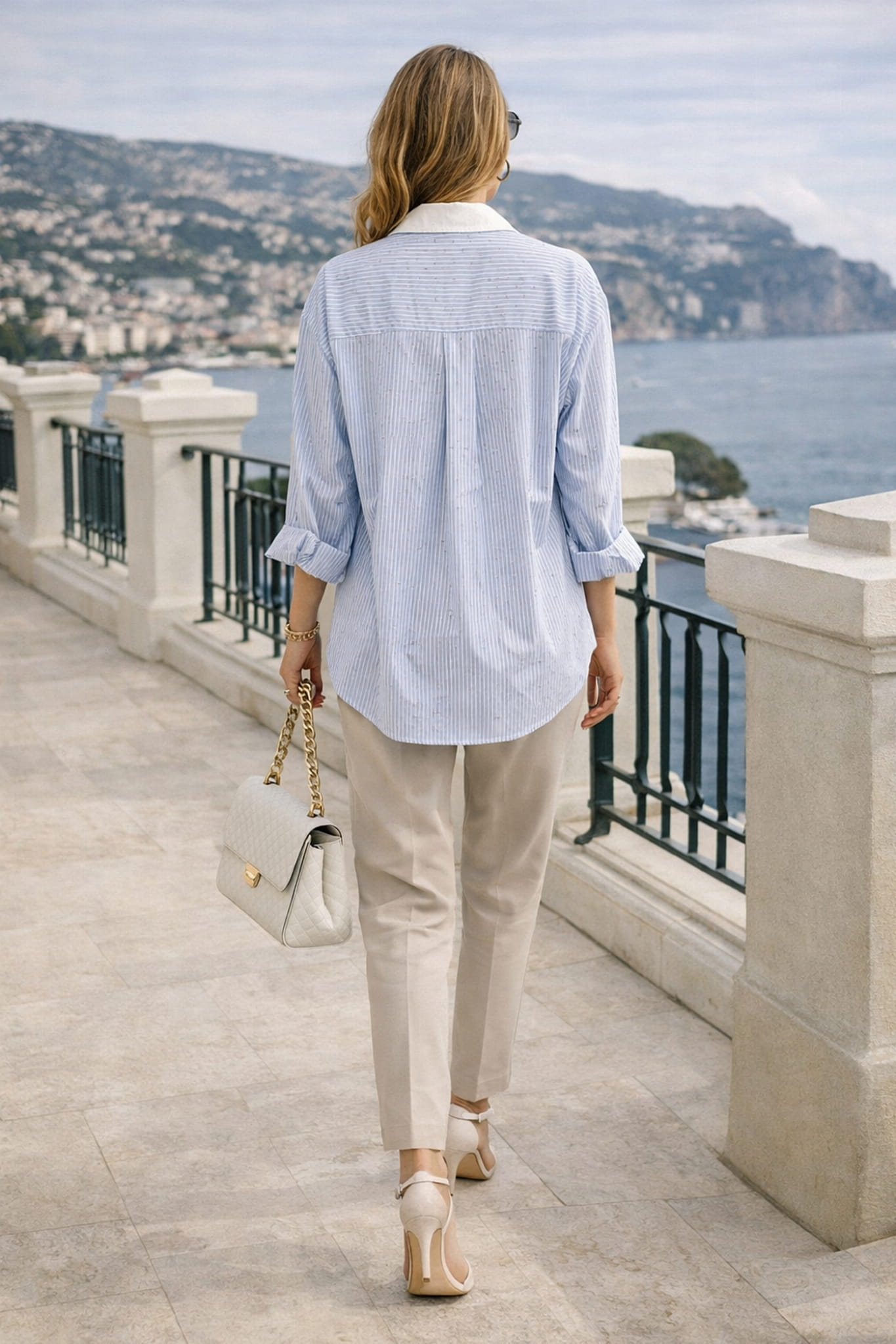 Koszula damska w paski z długim rękawem dżetami elegancka zapinana na guziki z klasycznym kołnierzem i zaokrąglonym dołem Fieradiprimiero błękitna