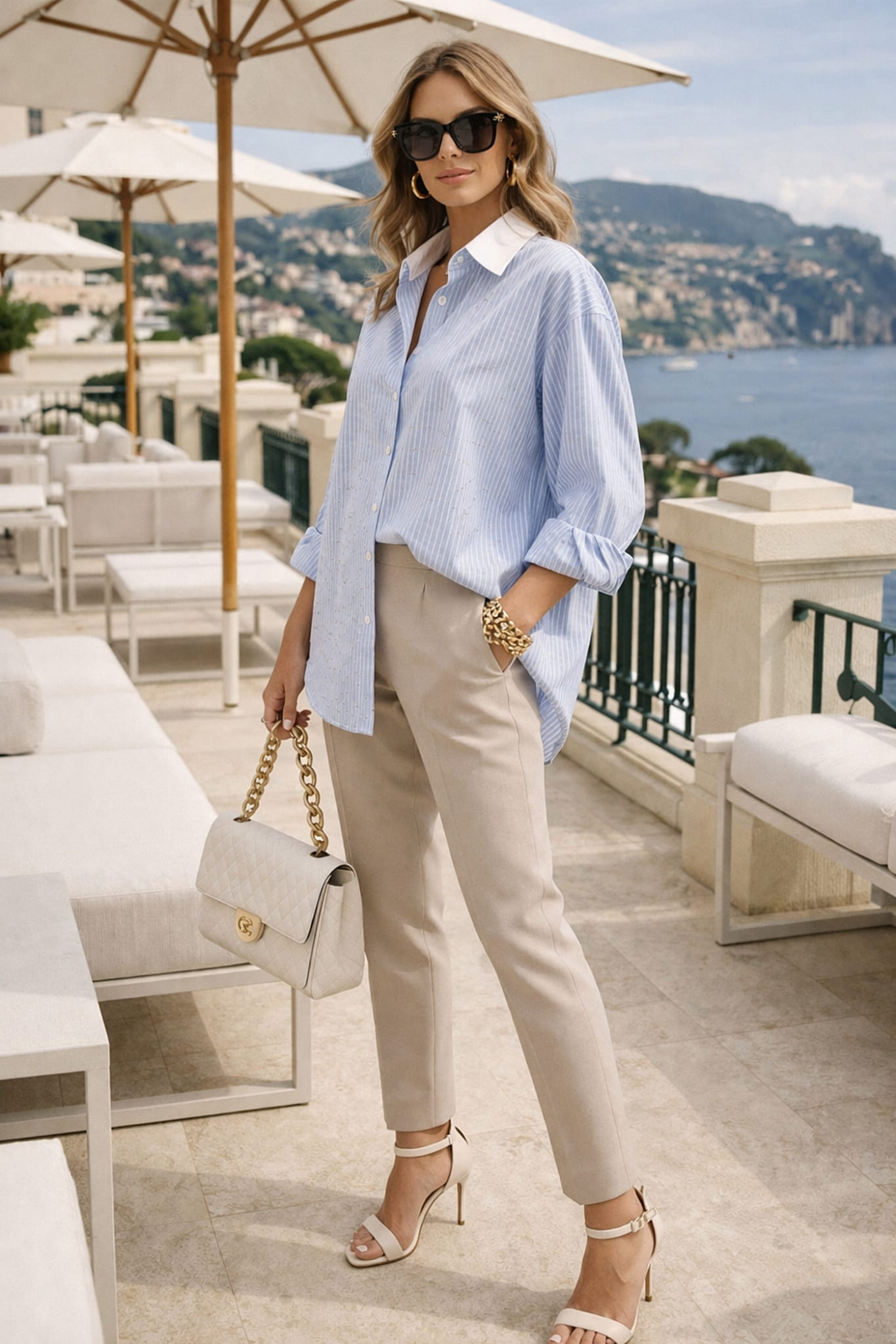 Przyjemna w dotyku tkanina sprawia, że to również lekka koszula damska na co dzień, która zapewnia przewiewność i swobodę. Jasny błękit wprowadza świeżość, dzięki czemu całość wygląda nowocześnie i kobieco.
