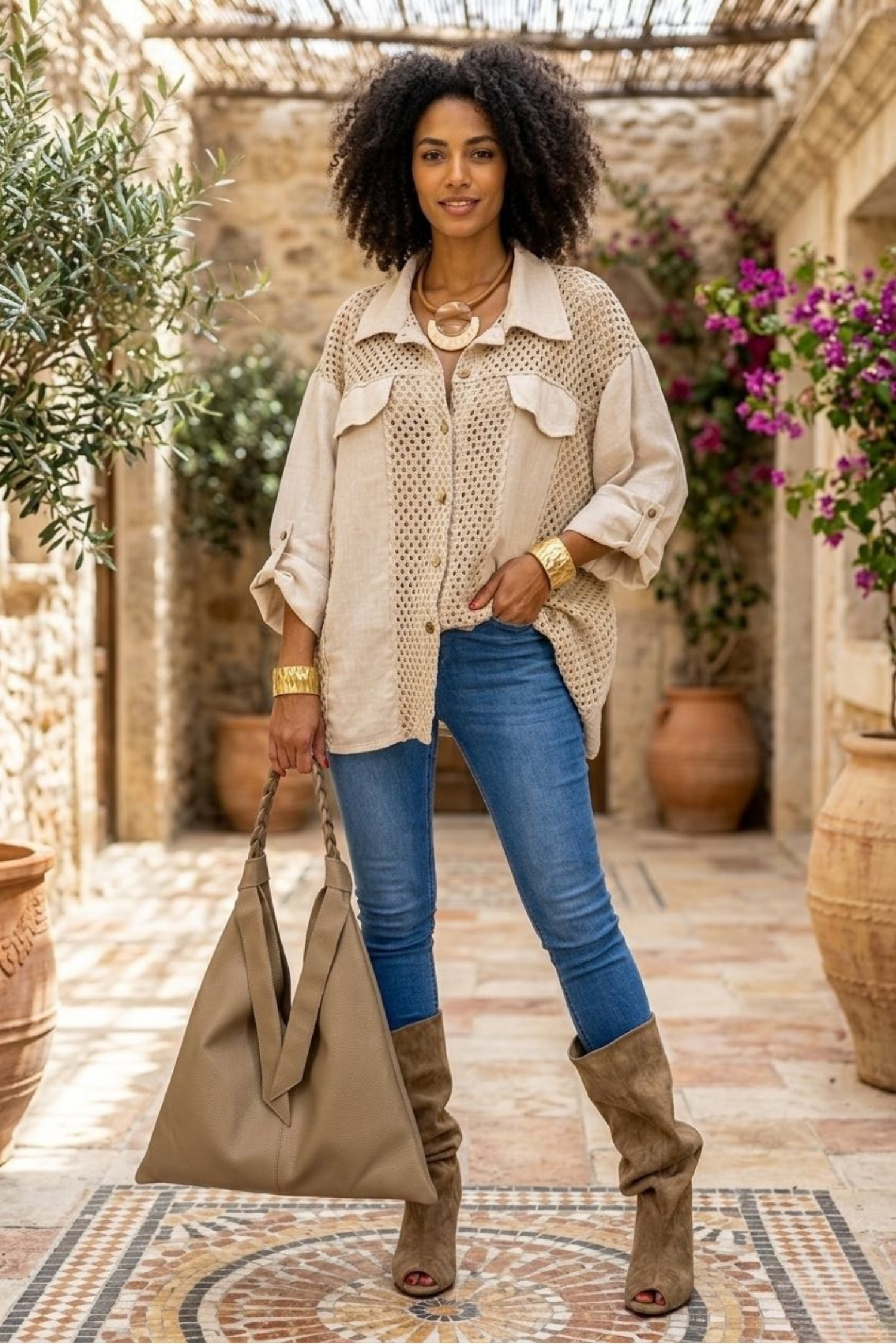 Koszula lniana damska beżowa oversize z ażurowymi panelami to rozwiązanie dla kobiet, które chcą zapewnić sobie przewiewność i komfort noszenia, jednocześnie zachowując estetyczny efekt stylizacji.