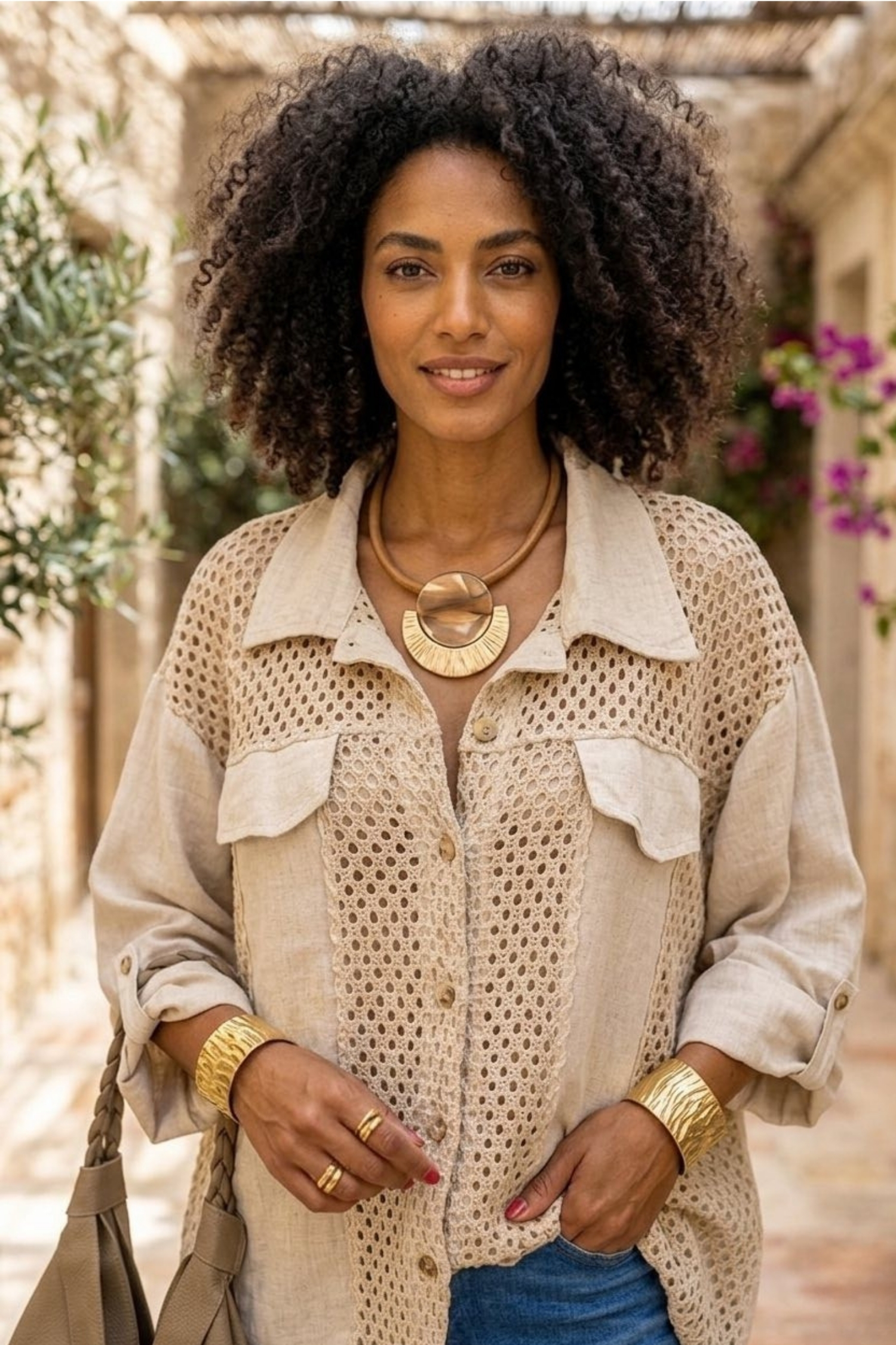 Koszula lniana damska beżowa narzutka oversize ażurowa z kołnierzykiem i patkami Bagheria
