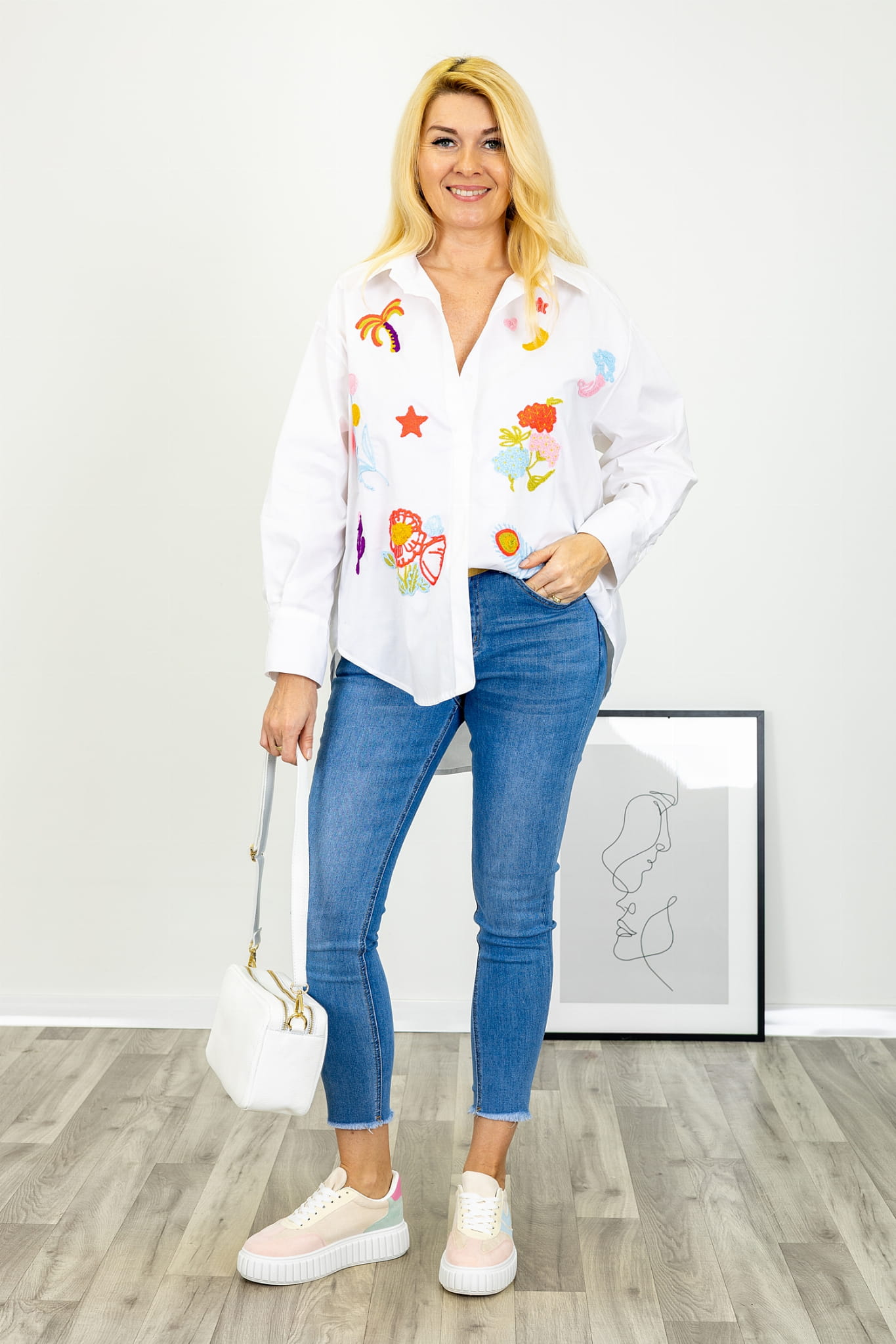 Na białej tkaninie wyraźnie widoczny jest kolorowy, wyszywany, abstrakcyjny wzór, który stanowi najbardziej charakterystyczny element koszuli. Dekoracyjny motyw przyciąga uwagę i nadaje całości wyrazisty akcent, odróżniając ten model od klasycznych, gładkich koszul.
