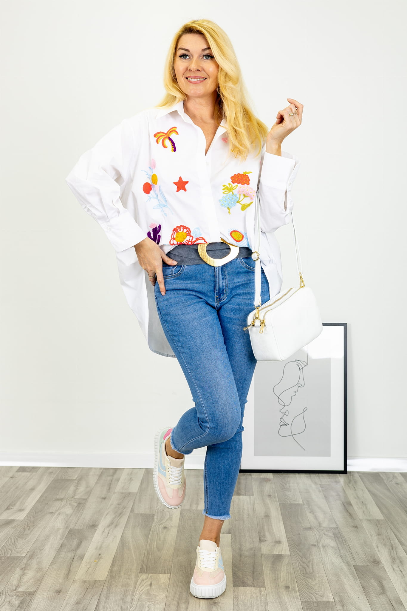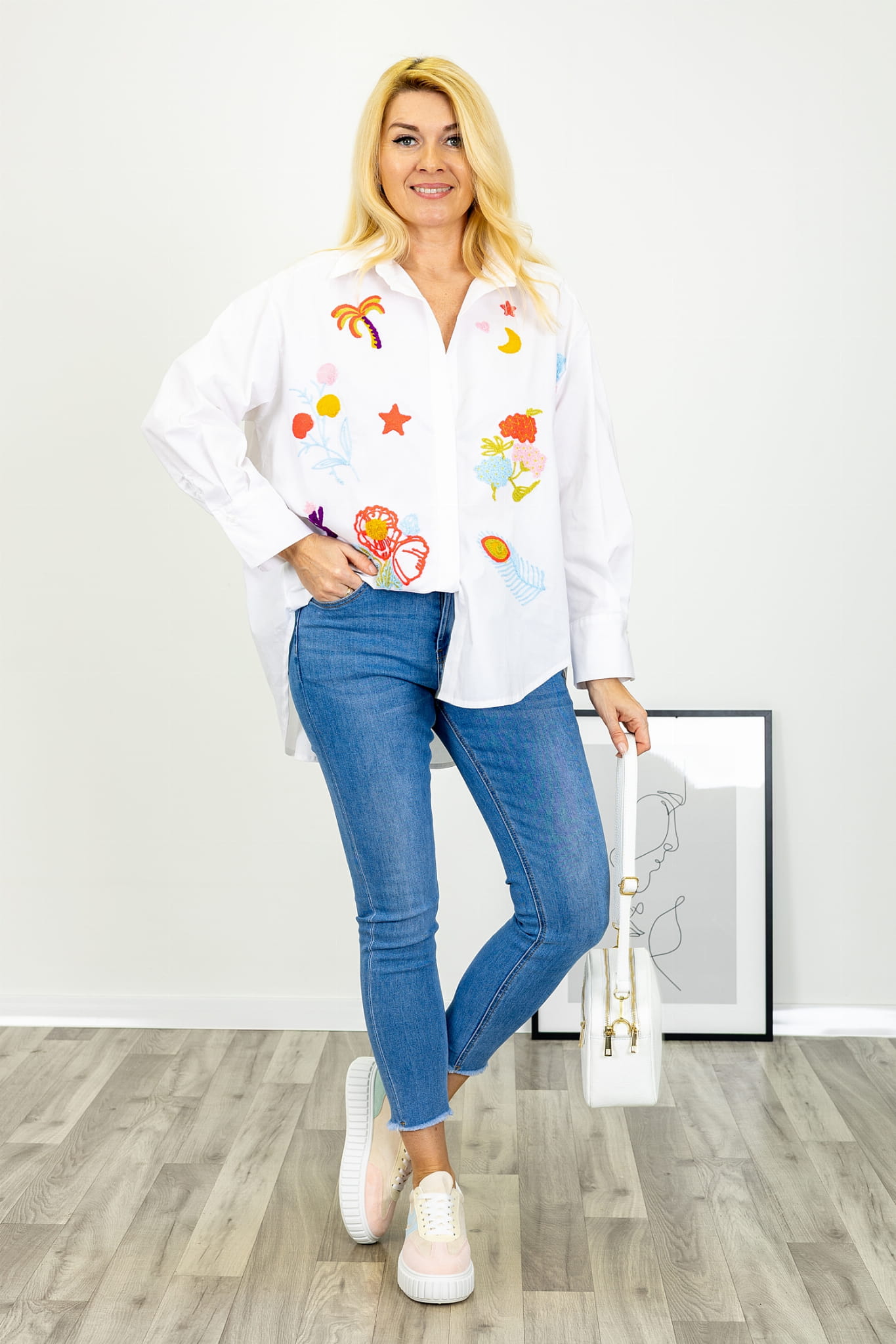 Koszula asymetryczna na guziki z klasycznym kołnierzykiem i wyszywanym abstrakcyjnym kolorowym wzorem Cittadicastello biała