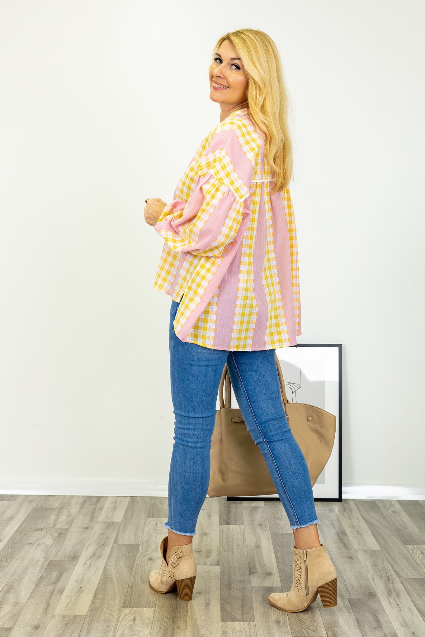 Koszula oversize asymetryczna z bufiastymi rękawami obszycie koronką połączenie pasków i kraty rozcięcia po bokach Cervasca różowo żółta