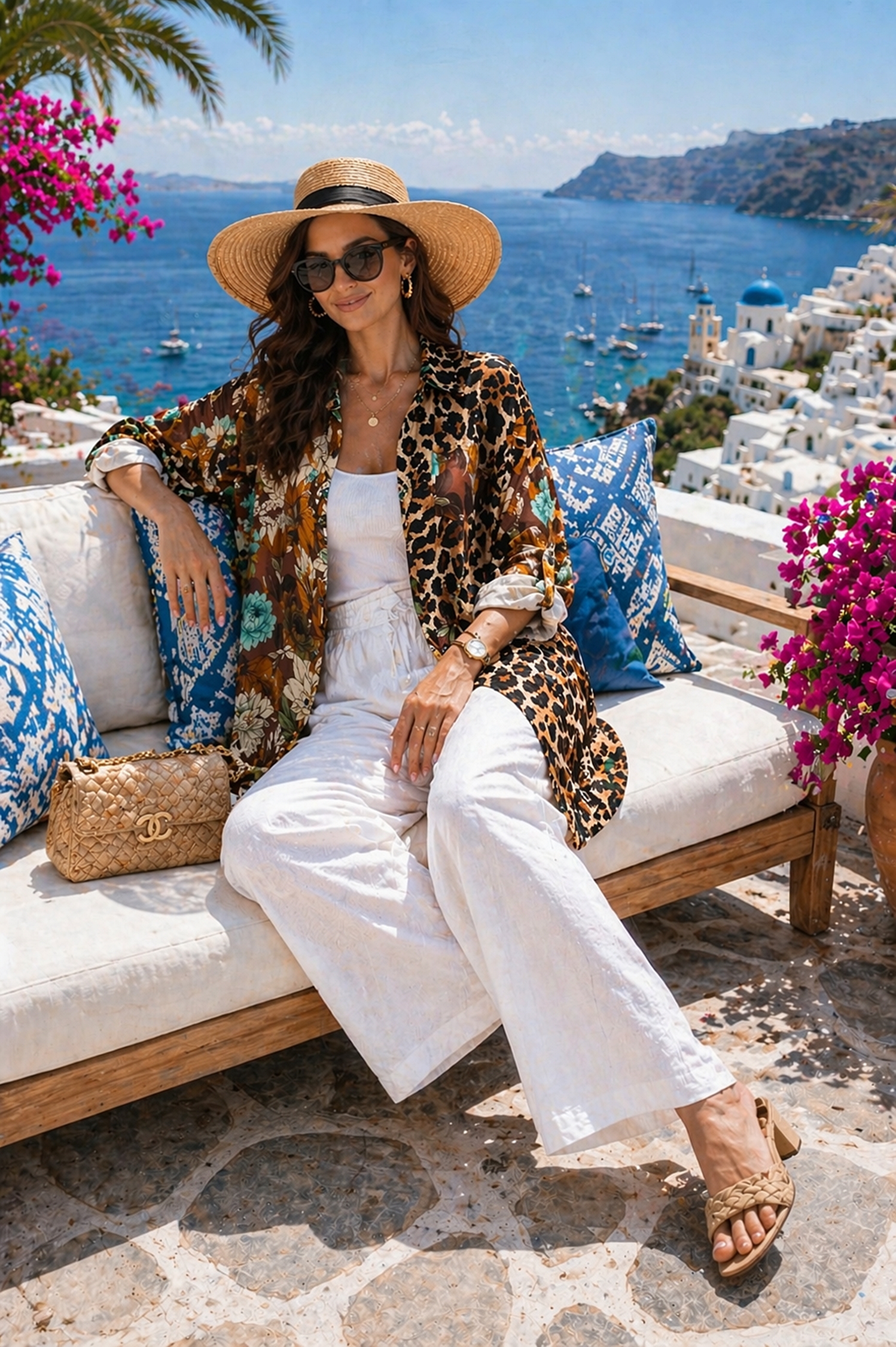 Koszula w panterkę i kwiaty styl oraz koszula damska modny print przyciąga uwagę i sprawia, że stylizacja wygląda wyraziście bez dodatkowych elementów.