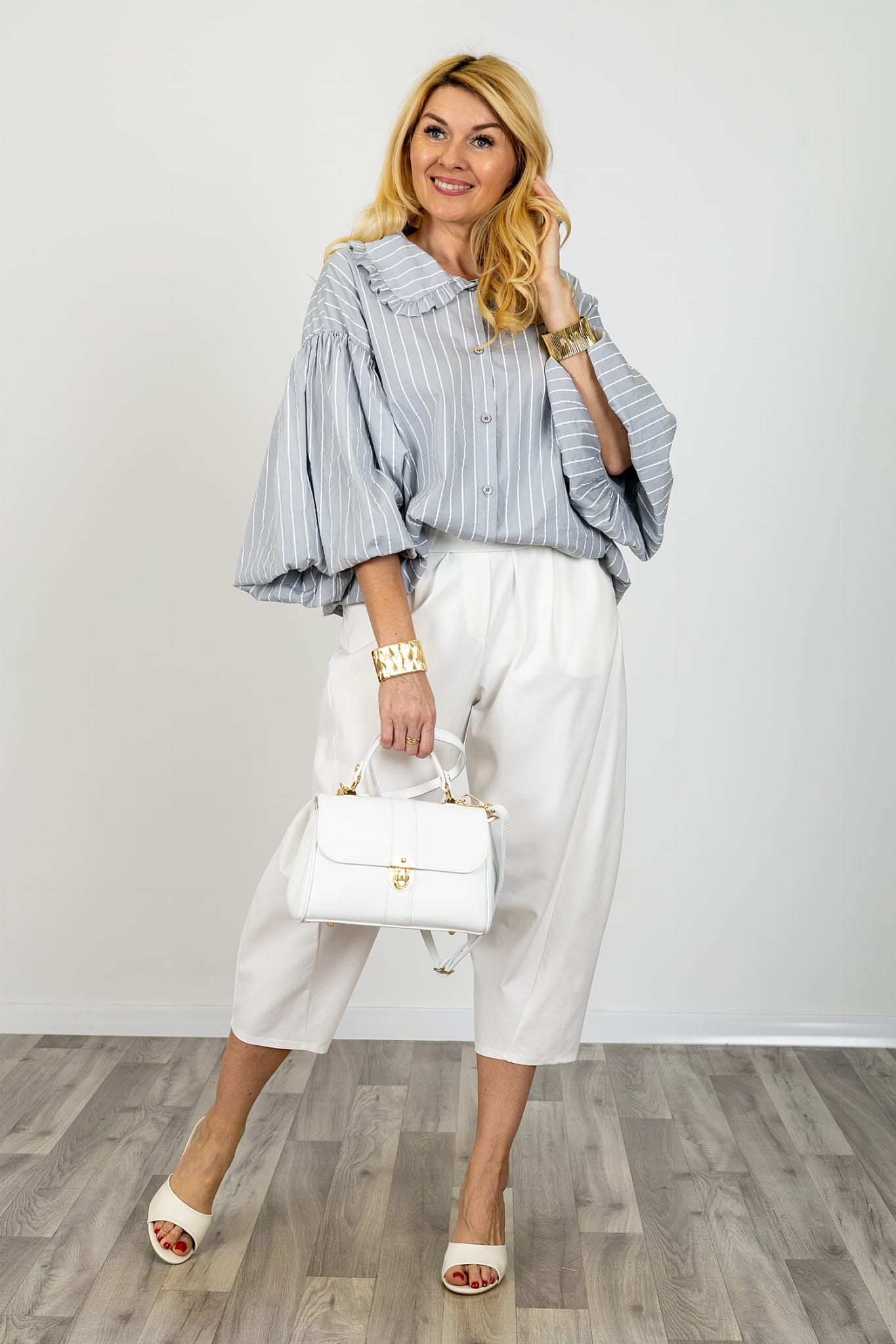 Koszula w paski oversize z falbanką przy kołnierzyku zapinana na guziki z bufiastymi rękawami Acquapendente szara