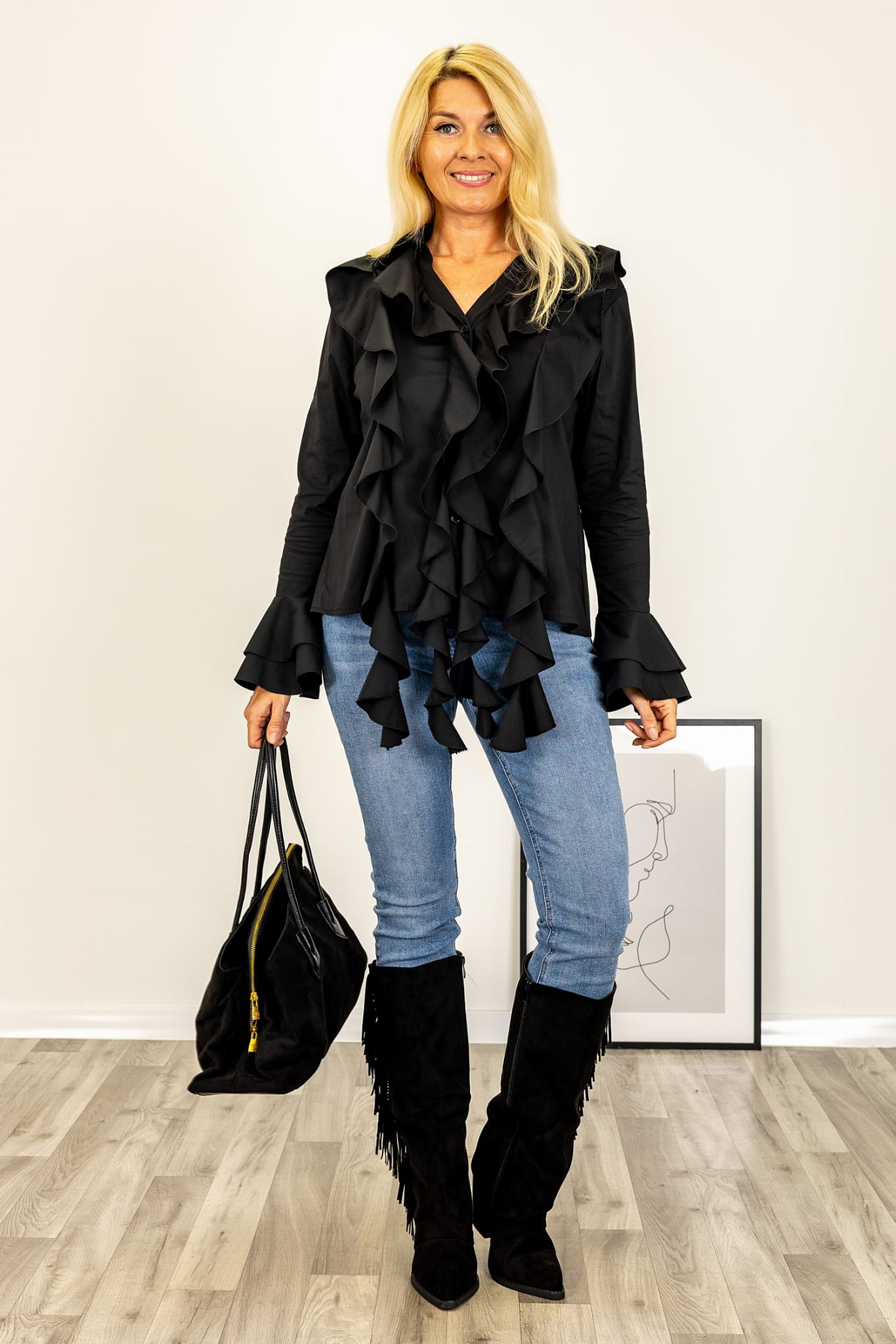 Charakterystycznym elementem koszuli są efektowne falbany – biegnące wzdłuż zapięcia i na zakończeniach rękawów – które nadają stylizacji lekkości i kobiecego wdzięku. Klasyczny kołnierzyk oraz dekolt w kształcie litery V pięknie eksponują szyję i subtelnie wydłużają górne partie sylwetki. Długi rękaw z falbankowym wykończeniem tworzy elegancką linię, idealną zarówno do stylizacji dziennych, jak i wieczorowych.