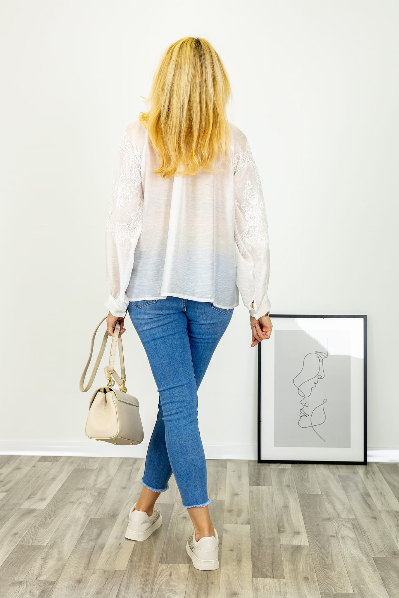 Koszula Grugliasco to elegancka włoska propozycja, w której dekoracyjna forma łączy się z delikatnością materiału i dopracowanymi detalami. Model wyróżnia się koronkowymi wstawkami o kwiatowym wzorze, umieszczonym na przodzie oraz rękawach, które nadają całości subtelnego, kobiecego charakteru. Transparentne elementy koronki tworzą wyraźny kontrast z gładką tkaniną, podkreślając estetykę projektu.