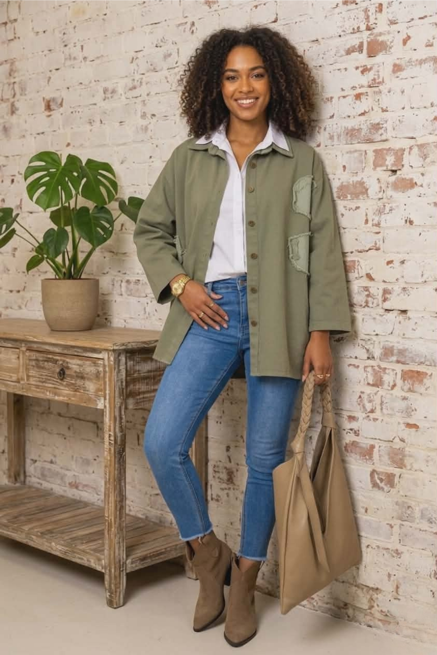Kurtka jeansowa damska narzutka oversize w odcieniu khaki to świadomie zaprojektowana forma, która łączy funkcjonalność z wyrazistym detalem. Luźna konstrukcja zapewnia swobodne układanie się materiału na sylwetce, co pozwala optycznie zrównoważyć proporcje i zakryć okolice brzucha oraz bioder bez efektu obciążenia. Zapięcie na guziki oraz klasyczny kołnierz wprowadzają uporządkowaną linię, dzięki czemu całość zachowuje spójność i może być stylizowana na różne sposoby. Naszywane aplikacje kwiatowe z celowo strzępionym wykończeniem budują trójwymiarową strukturę i nadają kurtce unikatowy, artystyczny charakter. To dopracowana kurtka jeansowa damska, która sprawdza się w codziennym użytkowaniu w każdym sezonie, oferując równowagę między wygodą a wyrazistym stylem.