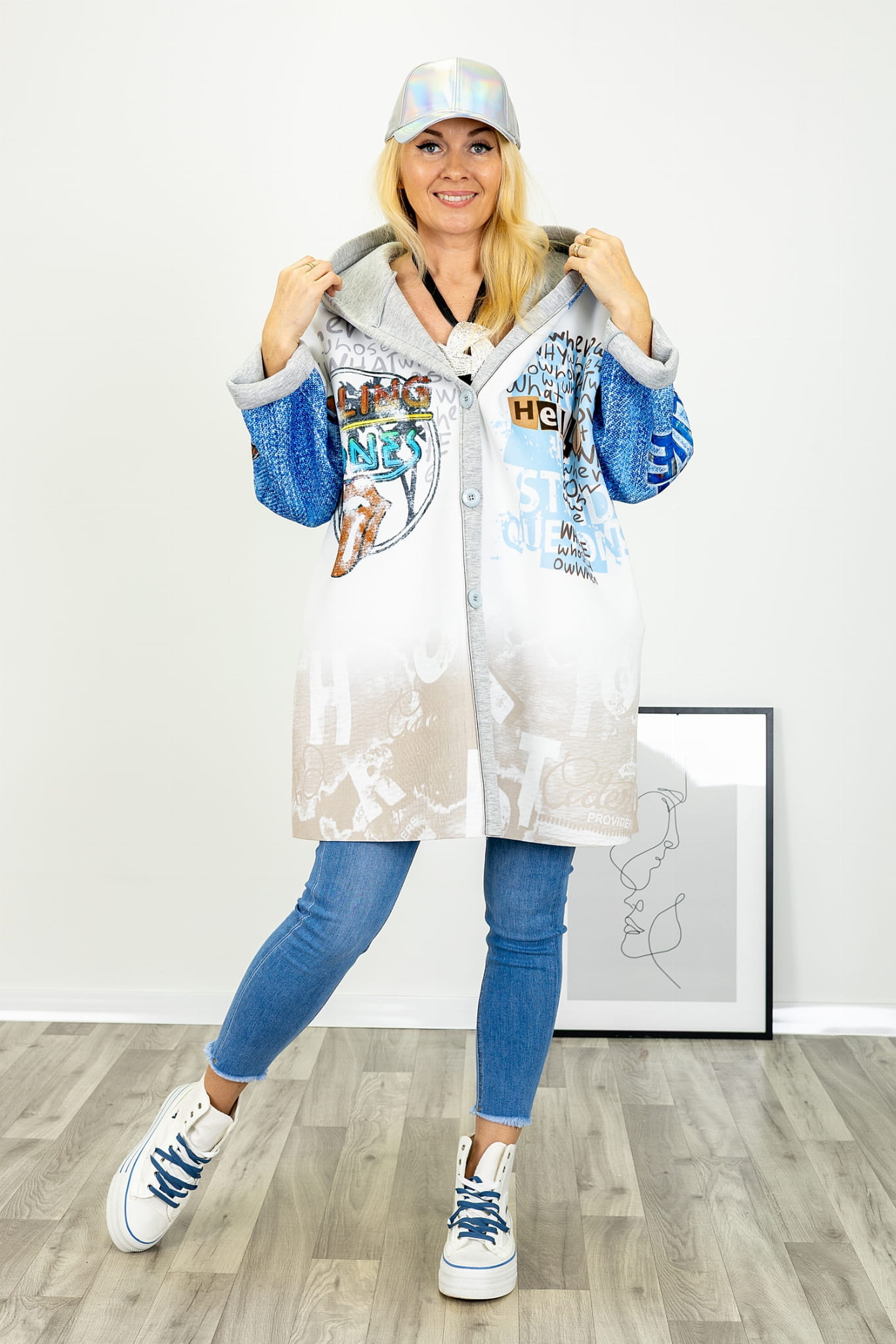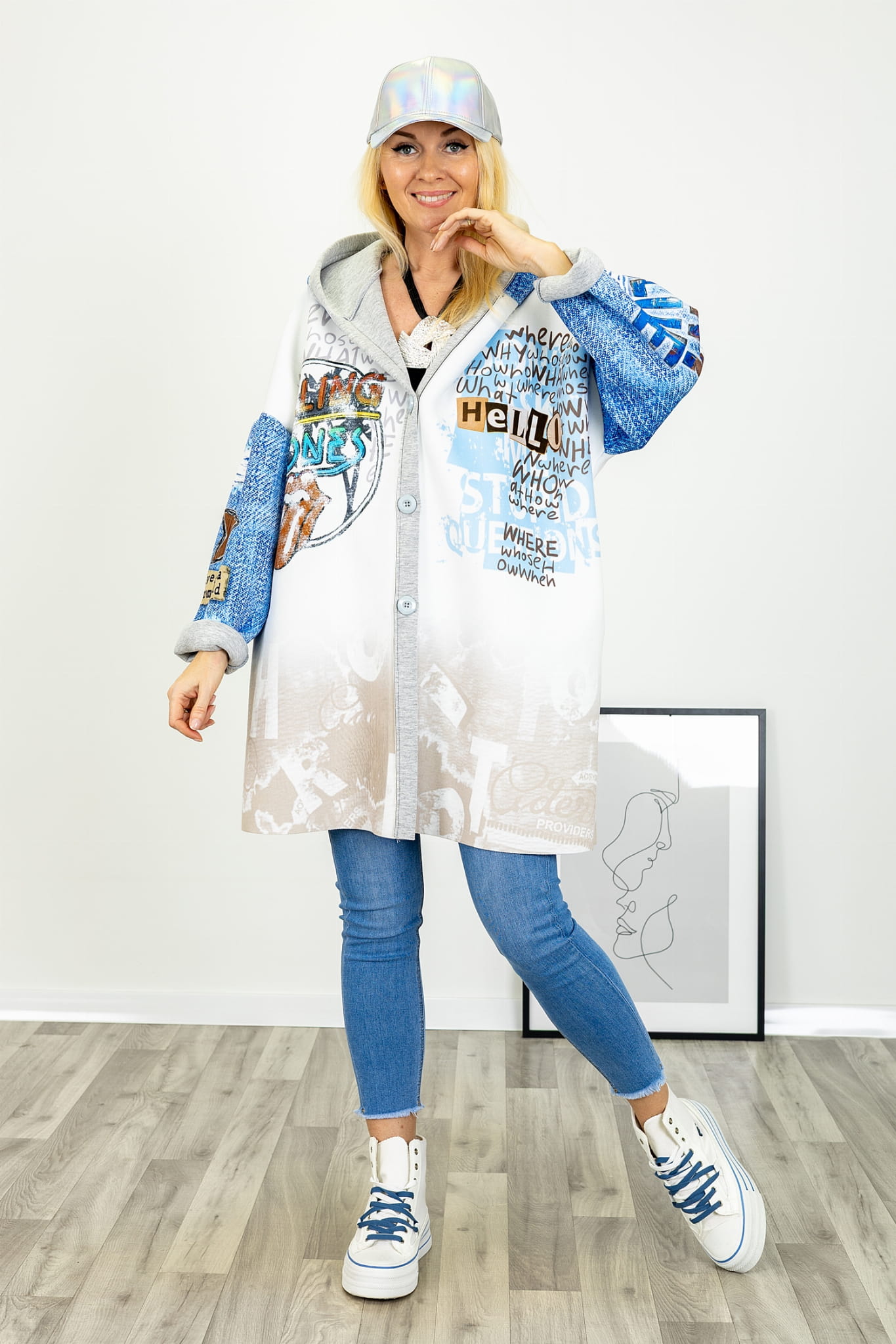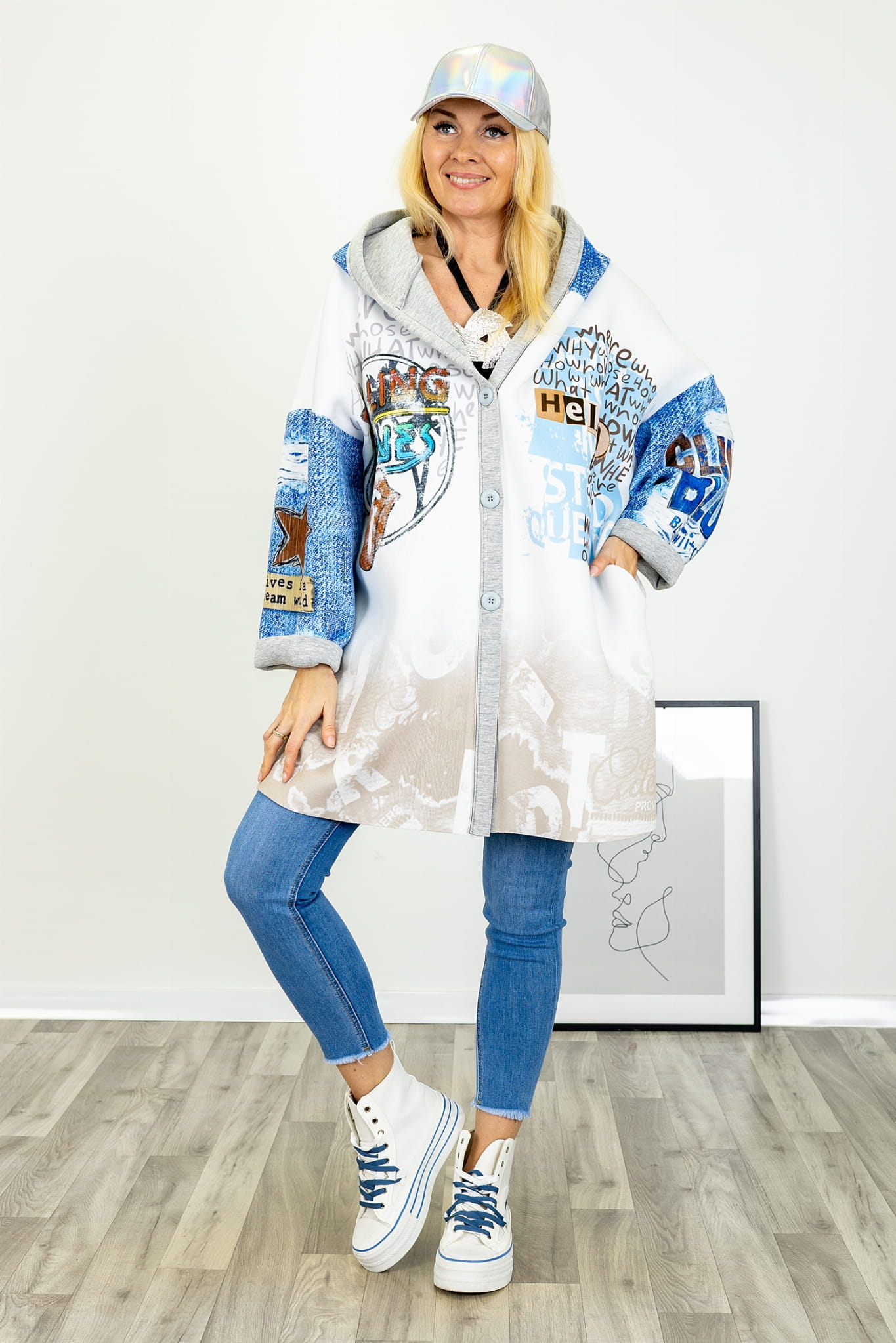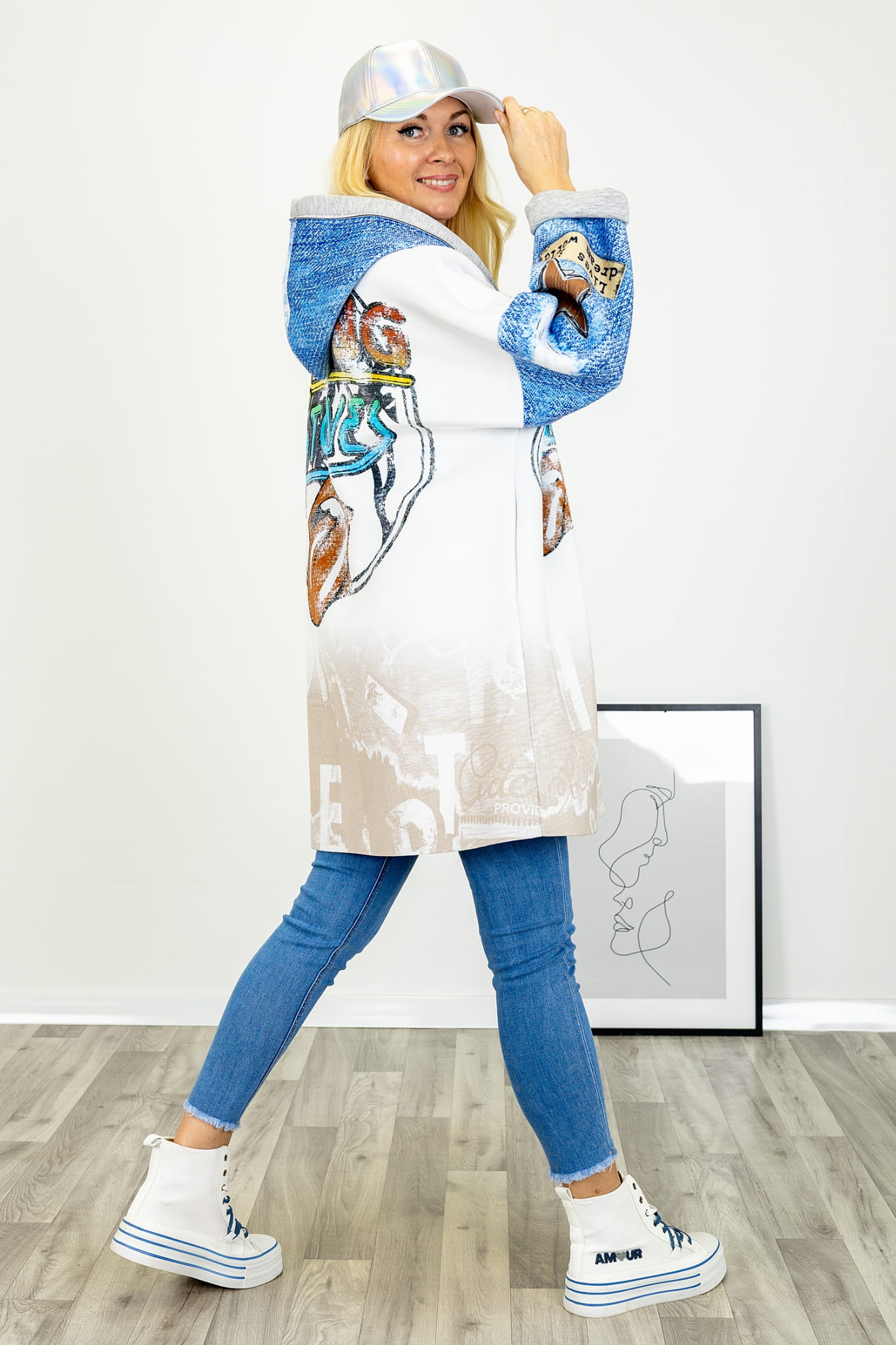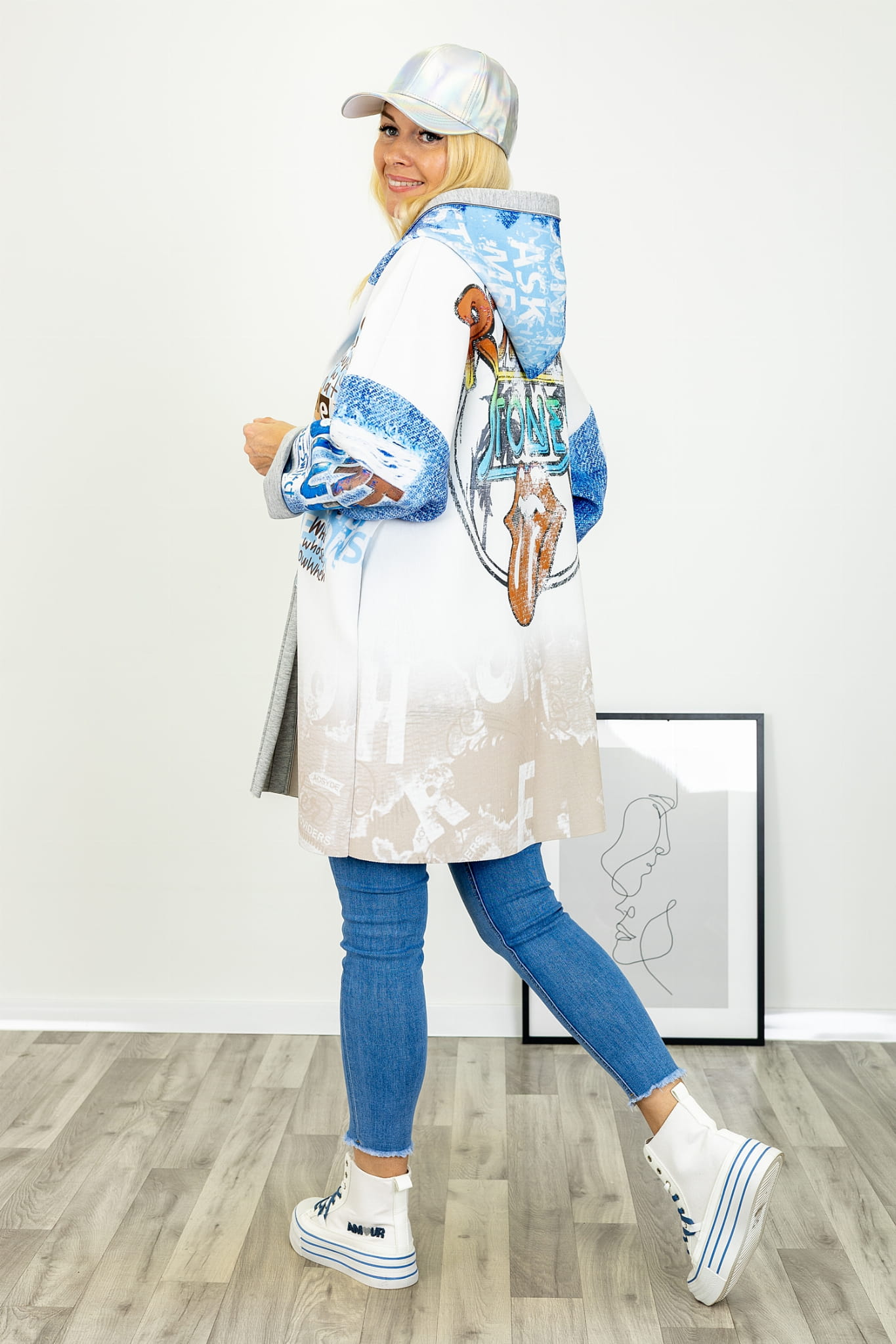 Na tle jasnej bazy uwagę przyciągają kolorowe nadruki. Graficzne akcenty rozmieszczone są w sposób przemyślany, dzięki czemu kurtka zyskuje indywidualny wyraz, nie tracąc spójności wizualnej. Nadruki nadają całości lekko artystycznego charakteru i stanowią mocny element stylistyczny modelu.