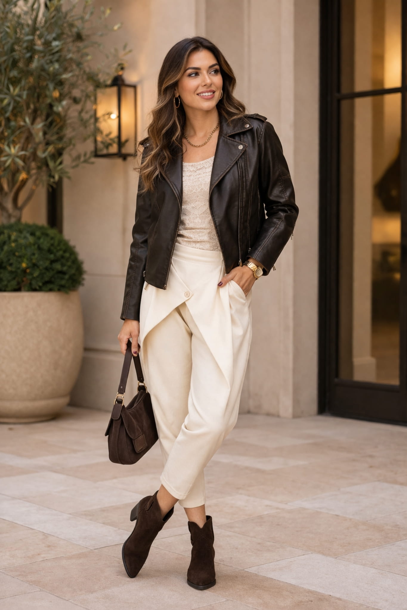 Kurtka ramoneska damska brązowa, która robi stylizację za Ciebie i dodaje charakteru w kilka sekund.