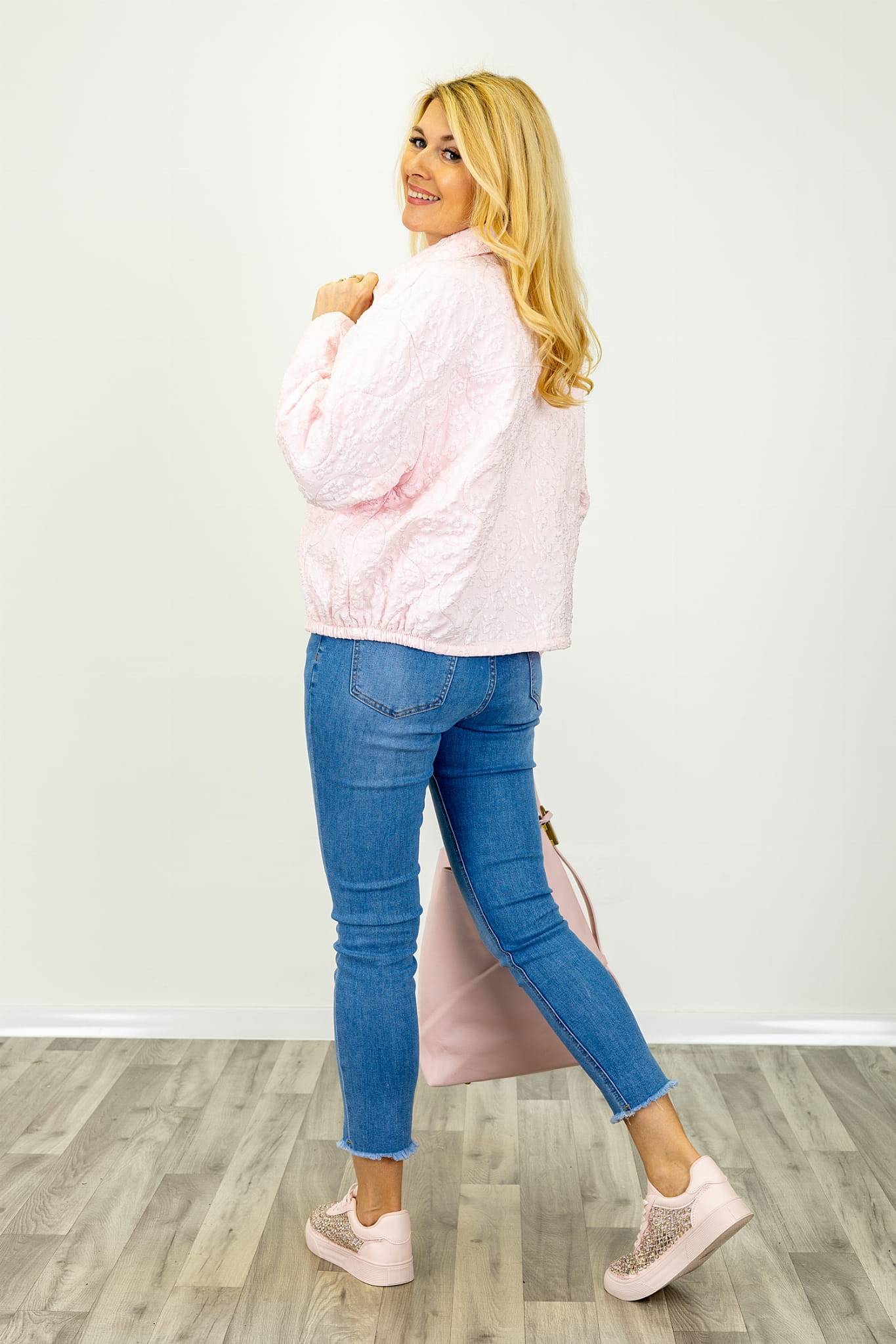 Kurtka zapinana na złote guziki z kieszeniami kołnierzem i kwiatowym wzorem Muccignano pudrowo różowa