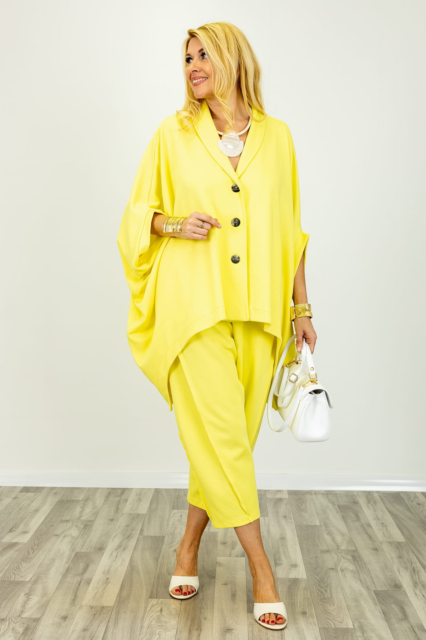 Narzutka żakiet oversizowa Montisola asymetryczna zapinana na guziki rękaw kimono żółta