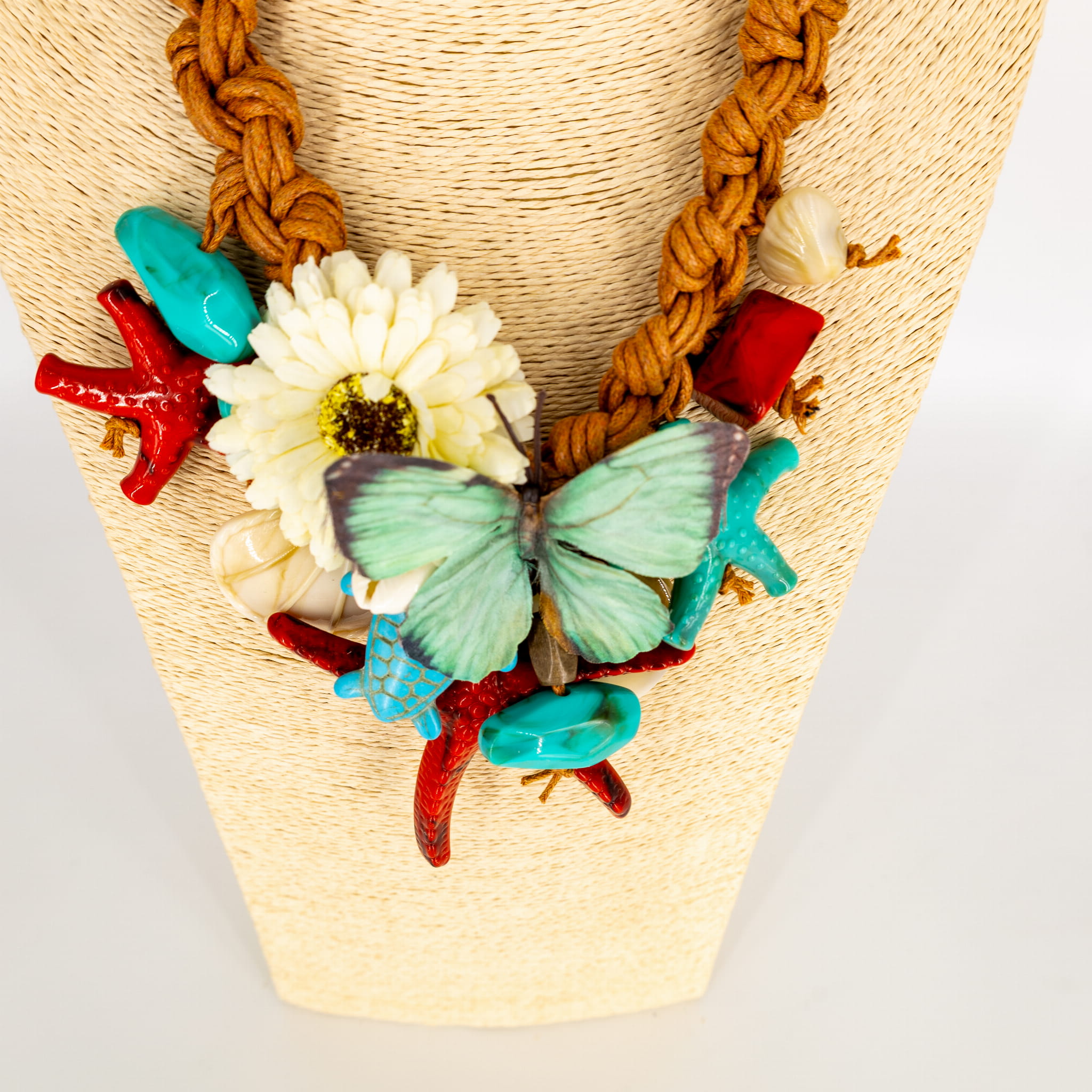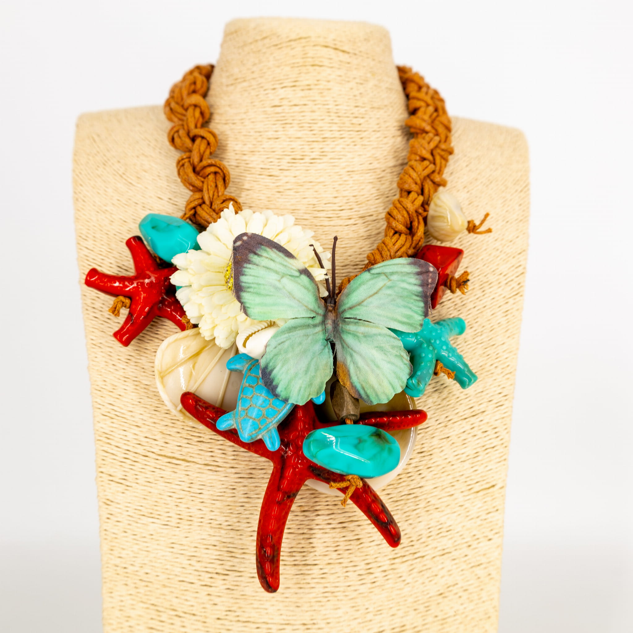 Naszyjnik z rozgwiazdami i muszelkami Spormaggiore na sznurku splecionym w warkocz boho brązowo-czerwono-turkusowy