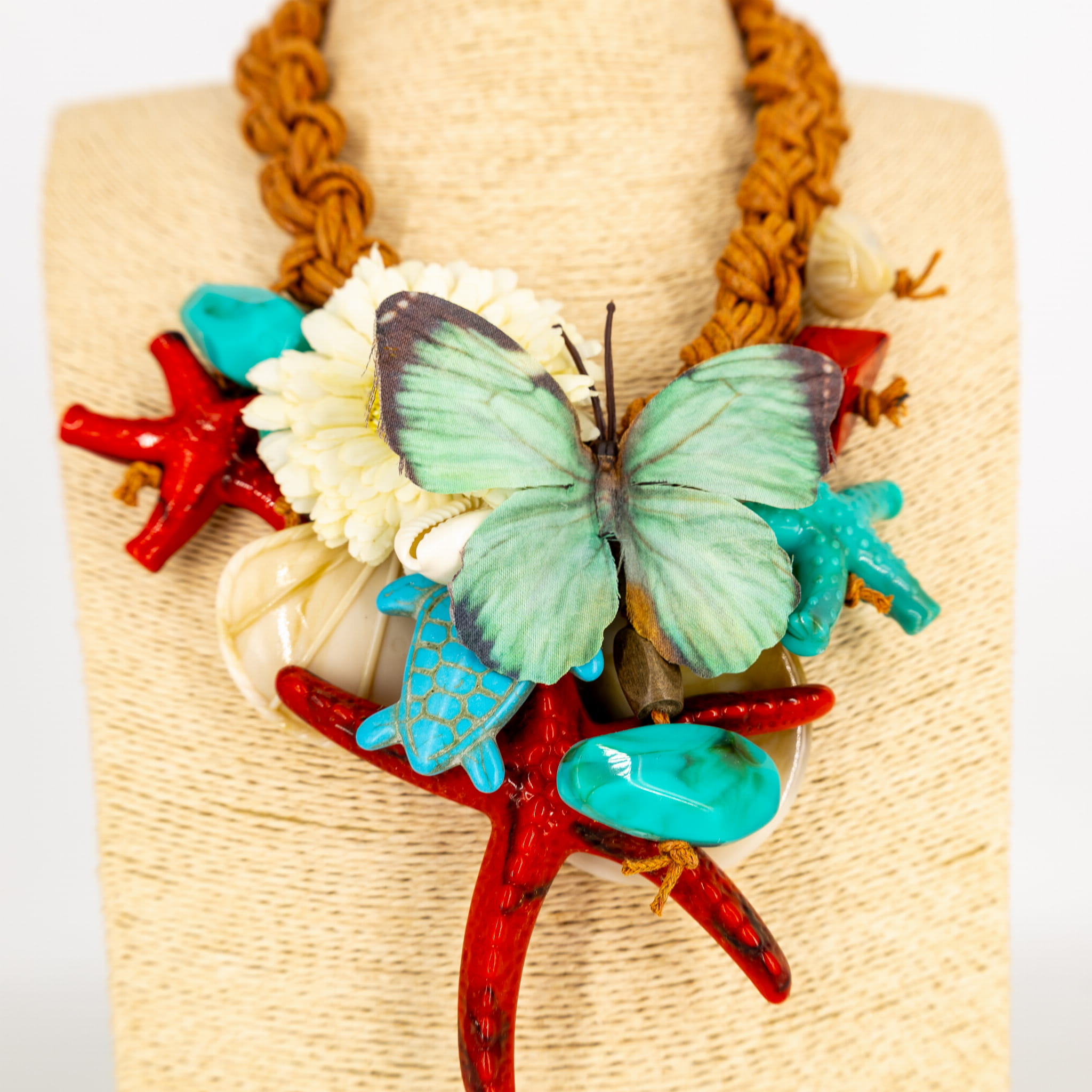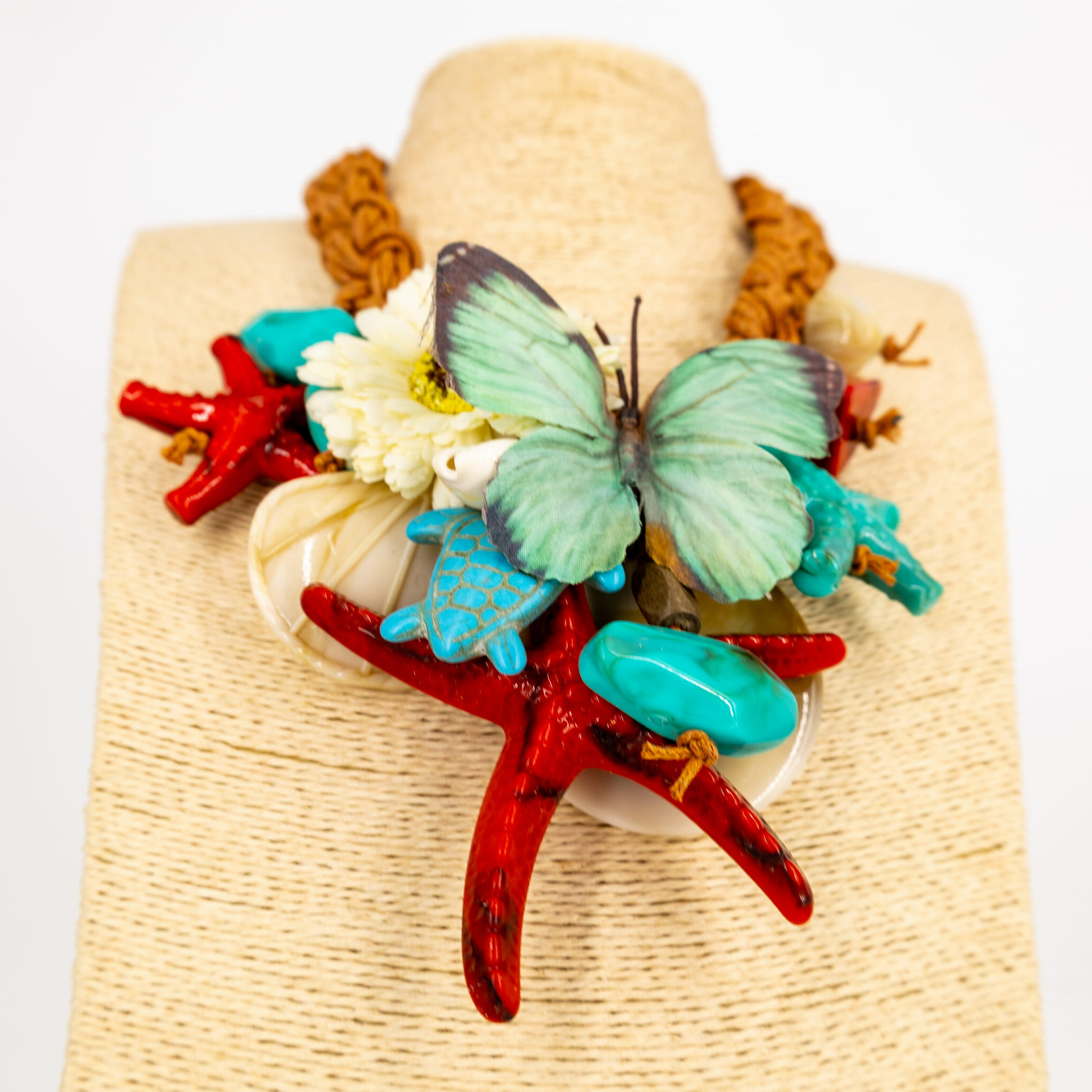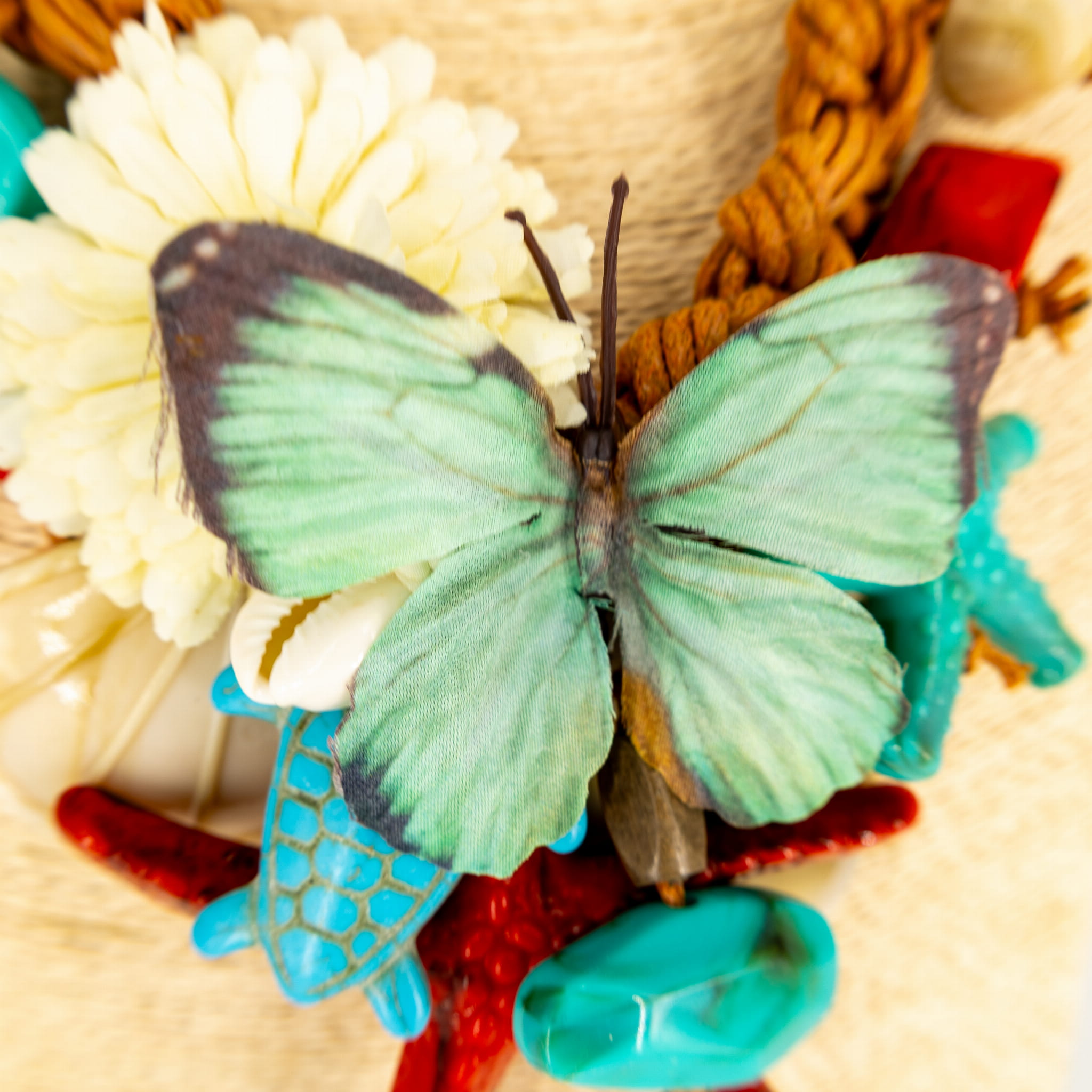 Centralną część tworzą dekoracyjne rozgwiazdy, muszelki oraz turkusowe elementy, uzupełnione realistycznym kwiatem i motylem. Zestawienie intensywnej czerwieni, turkusu i ciepłych beżów buduje kontrastową, ale spójną całość, inspirowaną stylem boho i motywami morskimi.