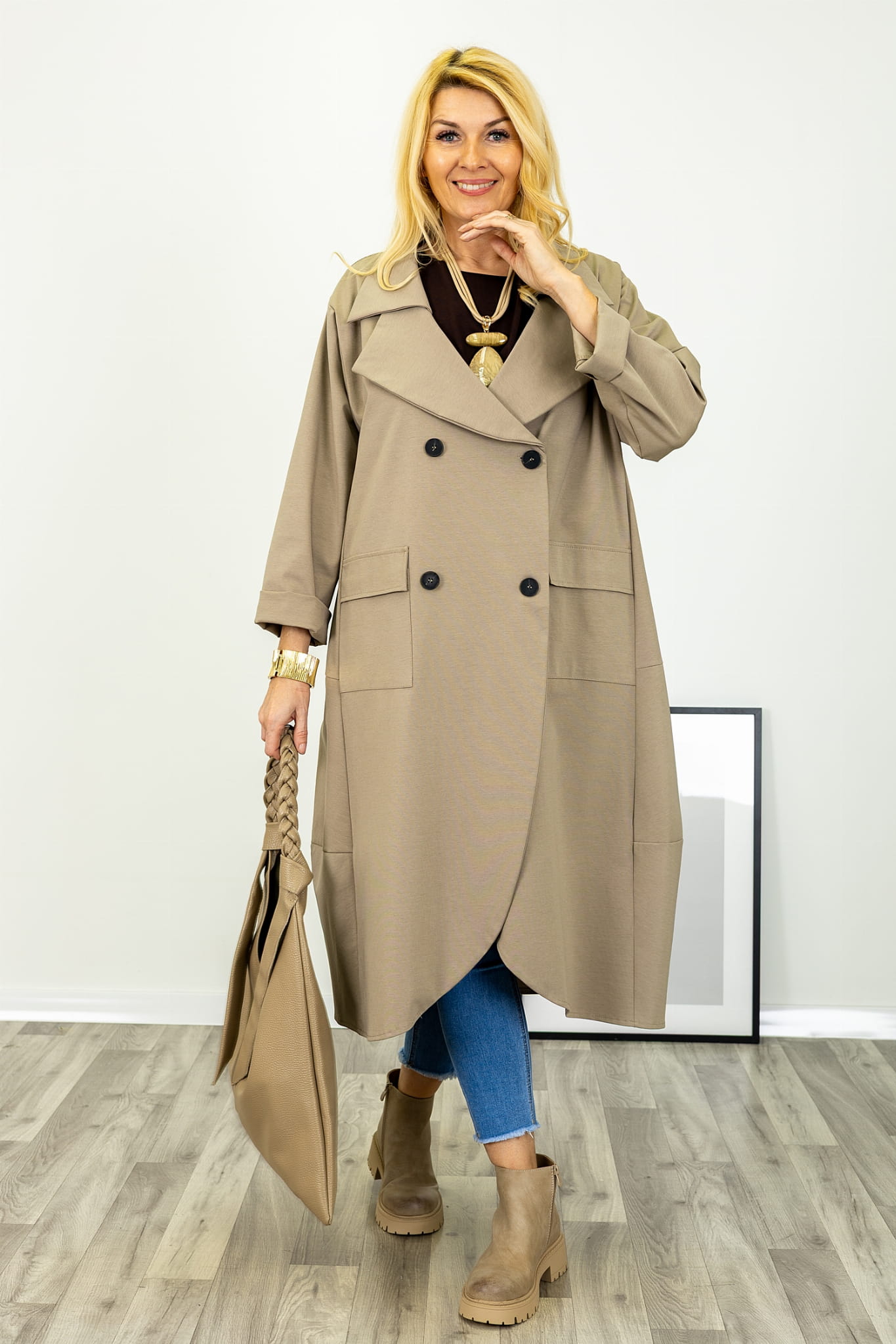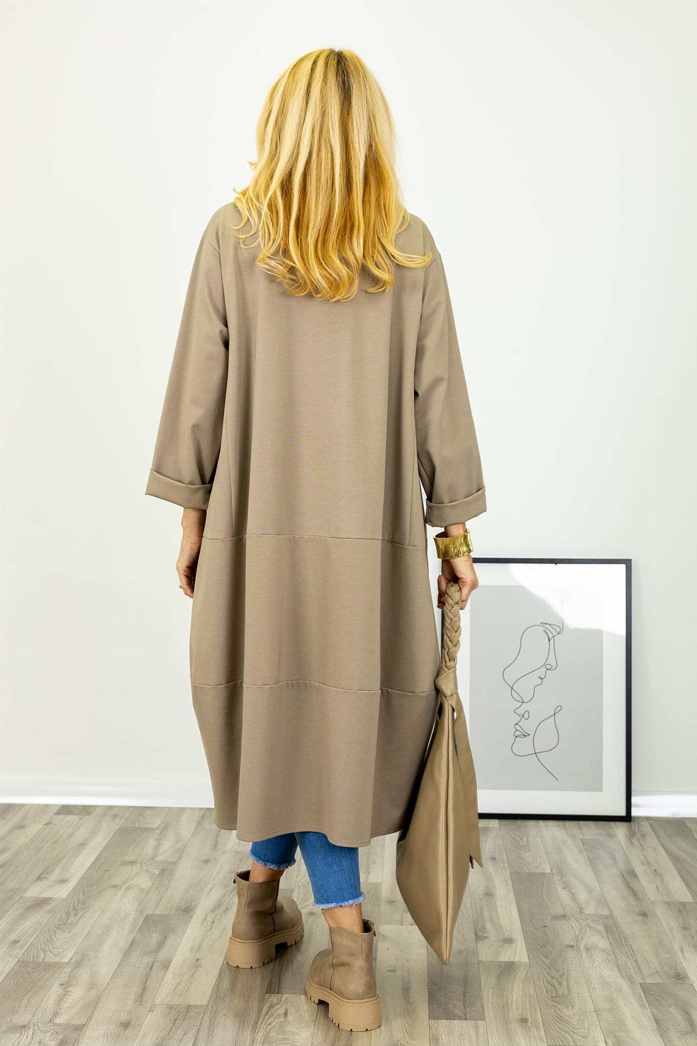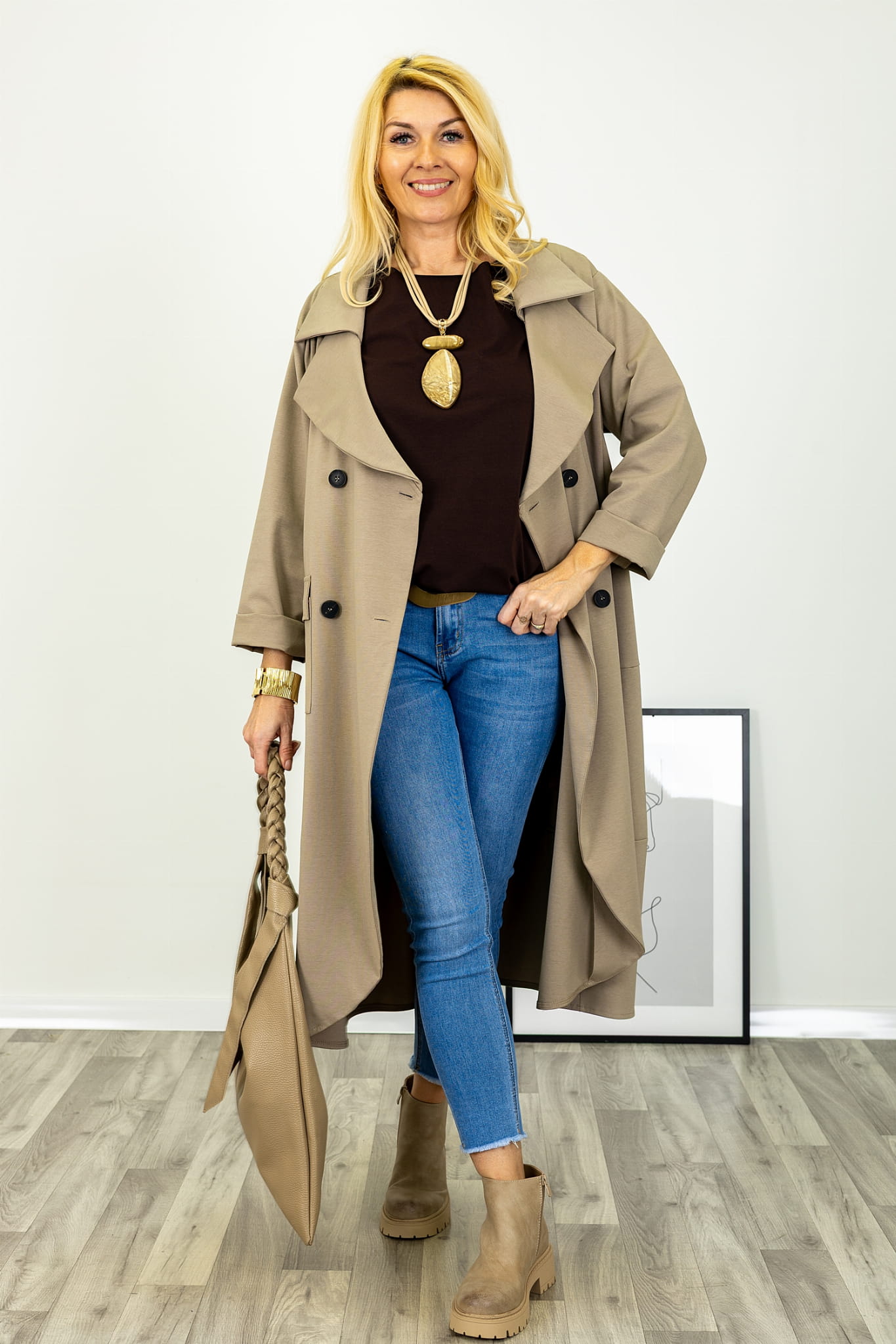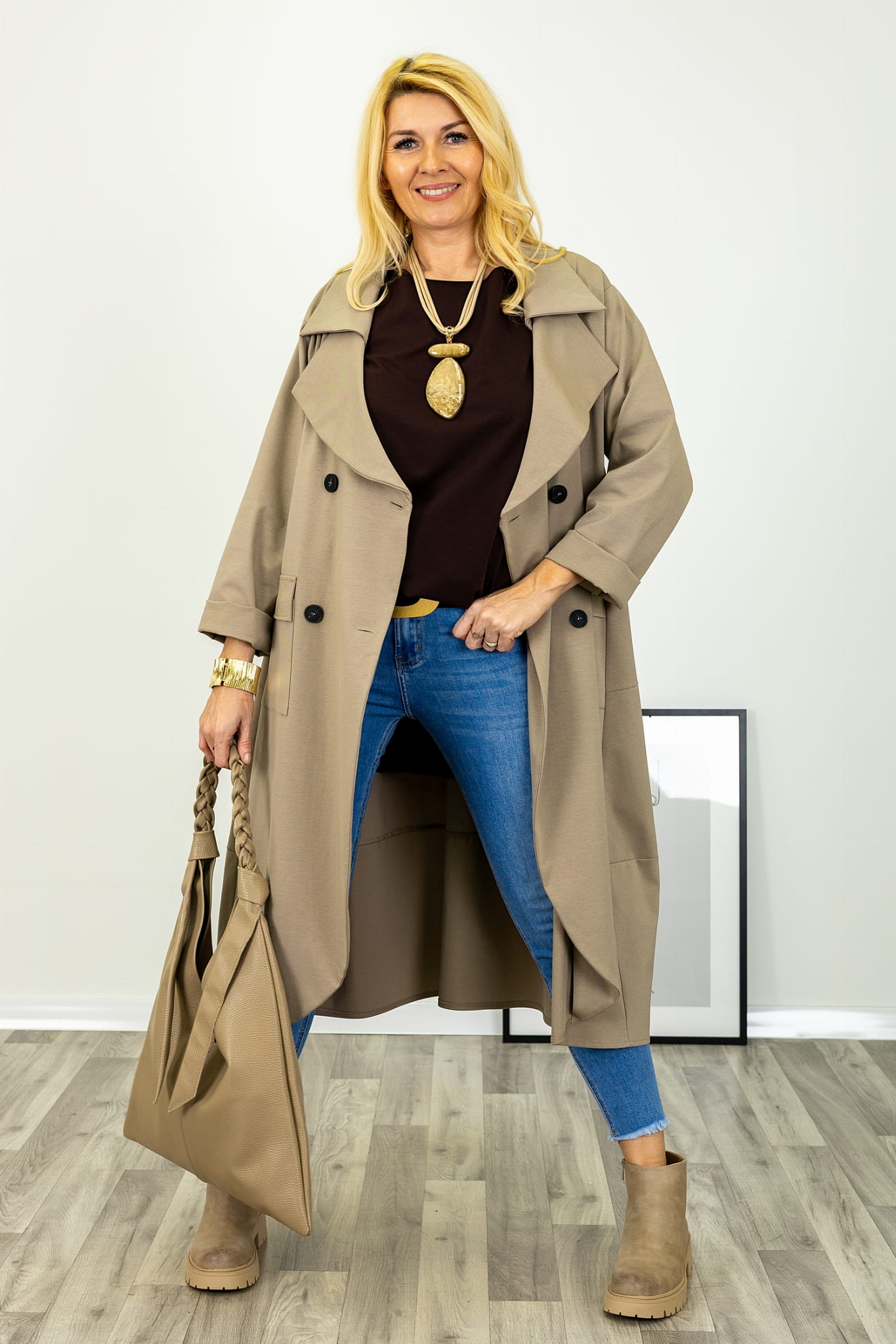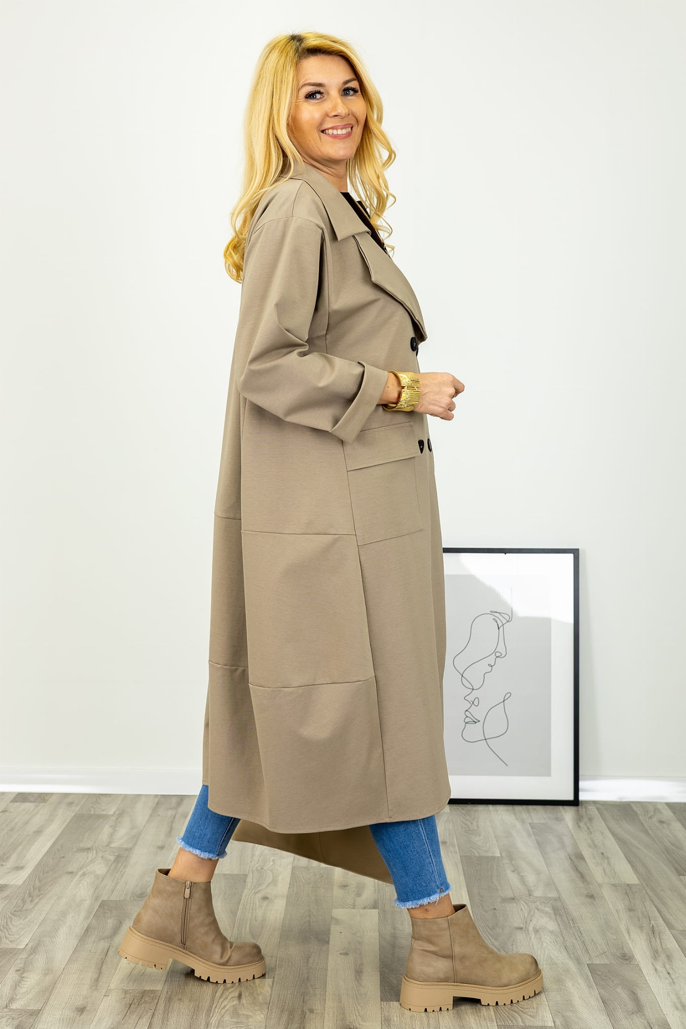 Płaszcz długi zapinany na dwurzędowe guziki z kołnierzem i przeszyciami z tyłu Verceia fango