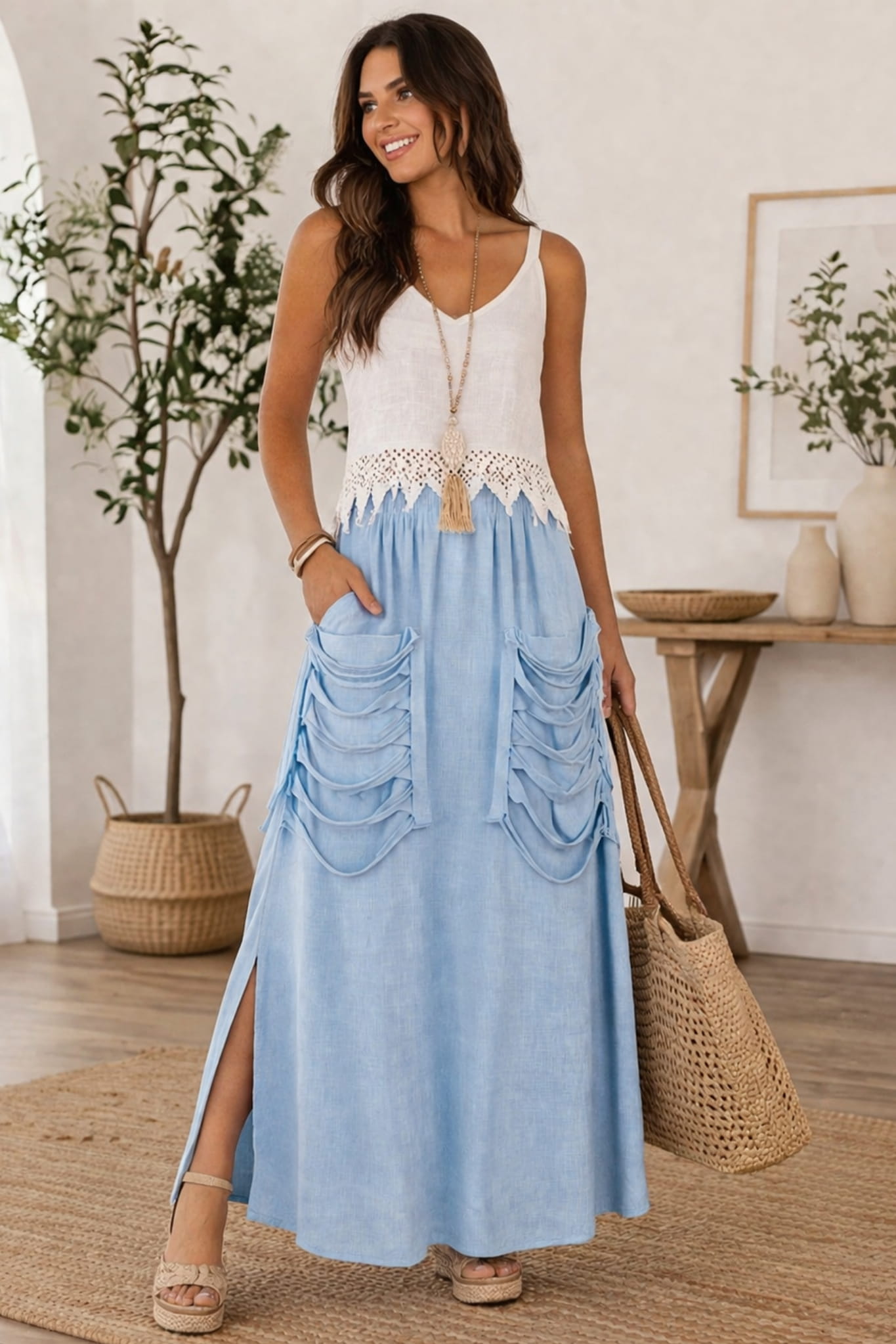 Spódnica lniana maxi na gumce z rozcięciem i ozdobnym wykończeniem kieszeniami Taisten błękitna