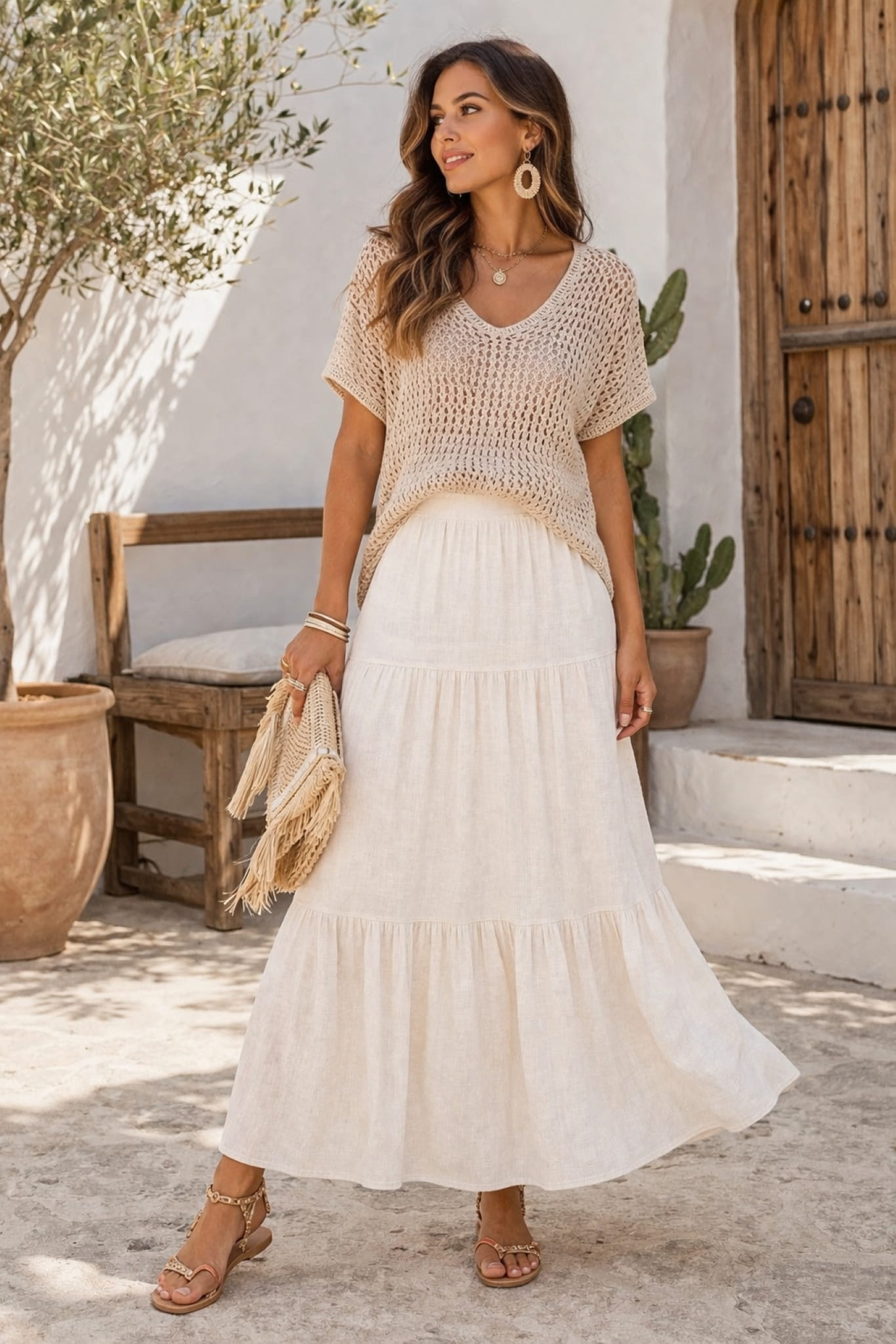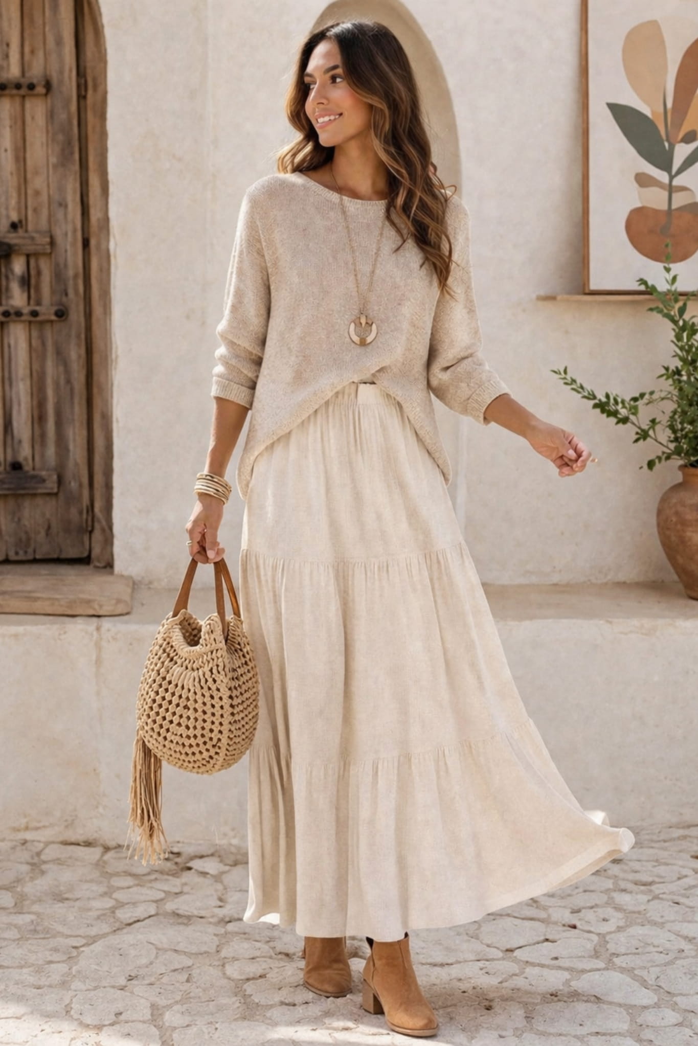 Spódnica maxi styl boho z falbanką i przeszyciami doskonale wpisuje się w estetykę naturalnej swobody i subtelnej formy. Jednocześnie lekka konstrukcja materiału nie obciąża sylwetki, dzięki czemu całość prezentuje się świeżo i kobieco.