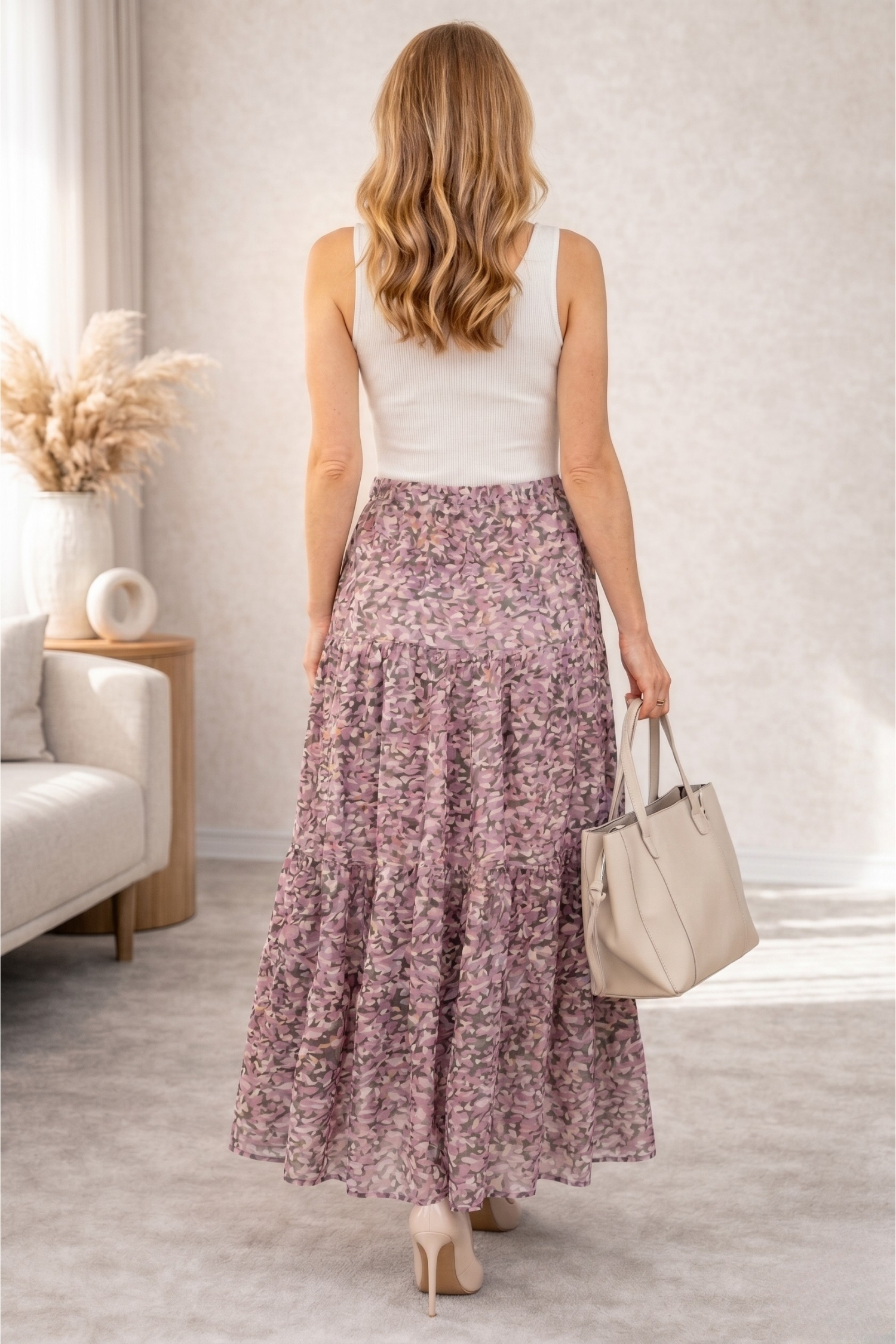 Jeśli szukasz spódnicy, która daje lekkość, swobodę i kobiecy efekt w ciepłe dni, ta spódnica maxi liliowa w print moro spełnia dokładnie te oczekiwania. Delikatny odcień liliowy, czyli subtelny jasny fiolet z nutą pastelowego różu, pięknie rozświetla stylizację i idealnie wpisuje się w wiosenno letni klimat.