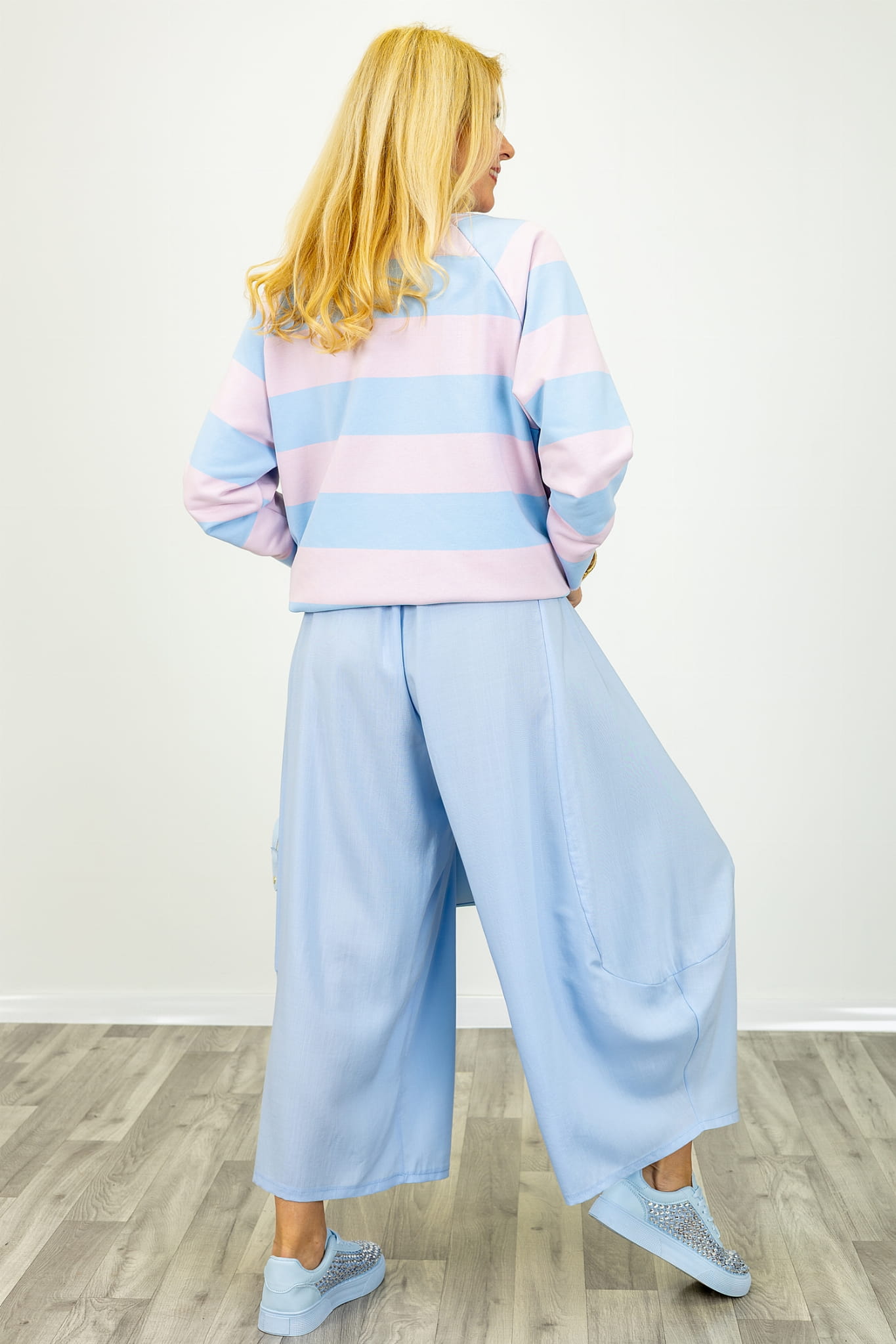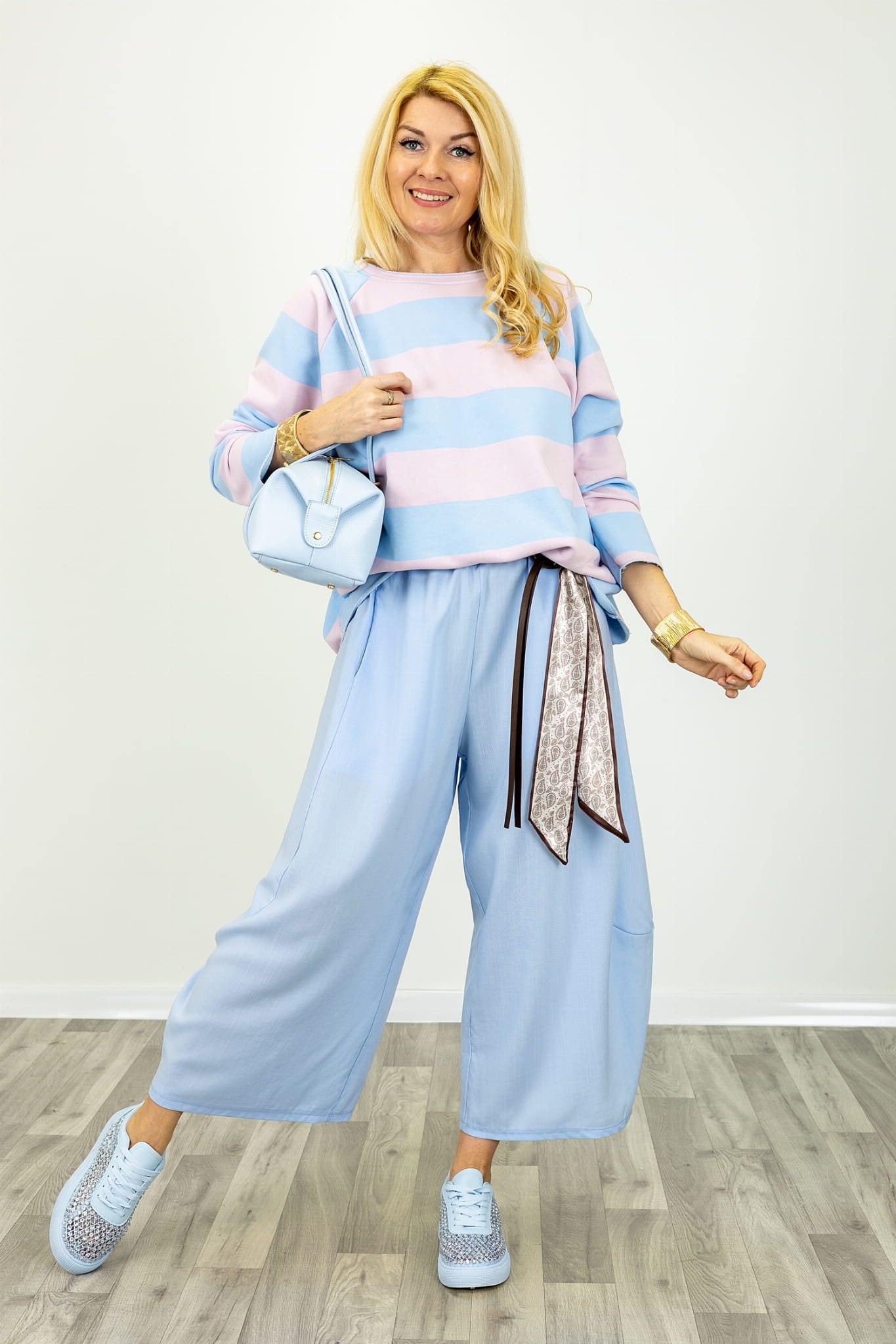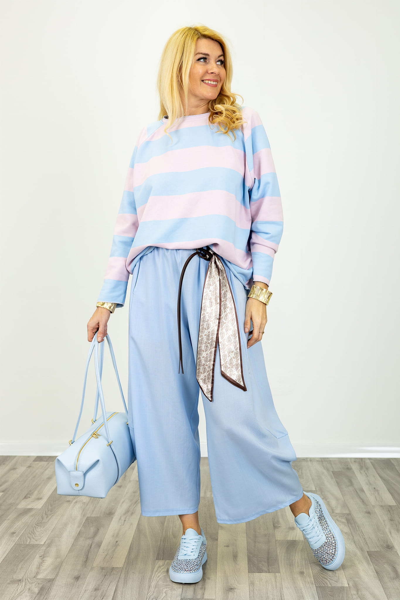 Spodnie balloon z wysokim stanem gumką w pasie i ozdobną apaszką Cervatto błękitne