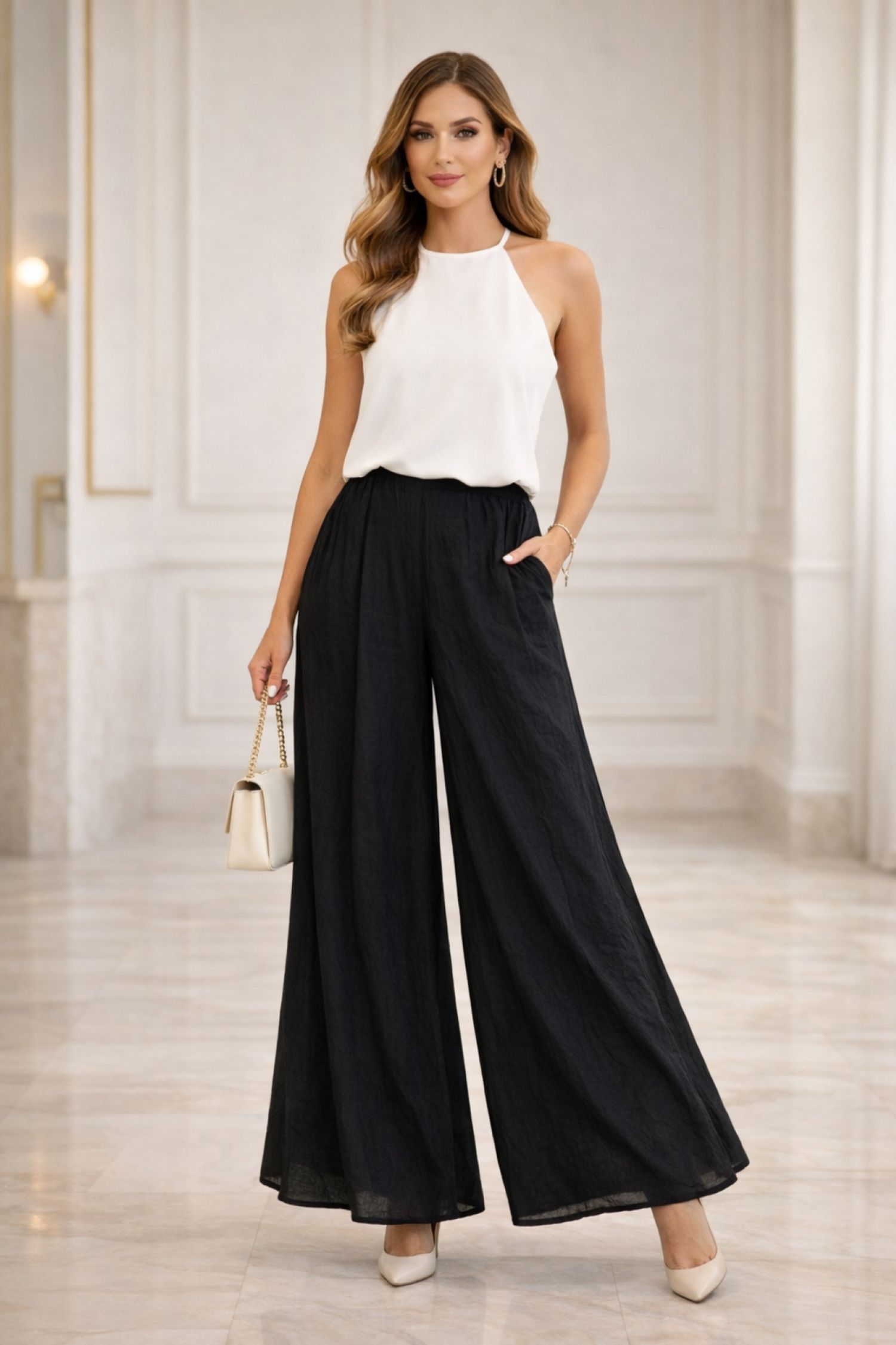 Jeśli szukasz spodni damskich palazzo z wysokim stanem na gumce, które nie opinają sylwetki i zapewniają komfort przez cały dzień, ten fason w czerni został zaprojektowany właśnie w tym kierunku, łącząc luźny krój z funkcjonalnymi detalami.