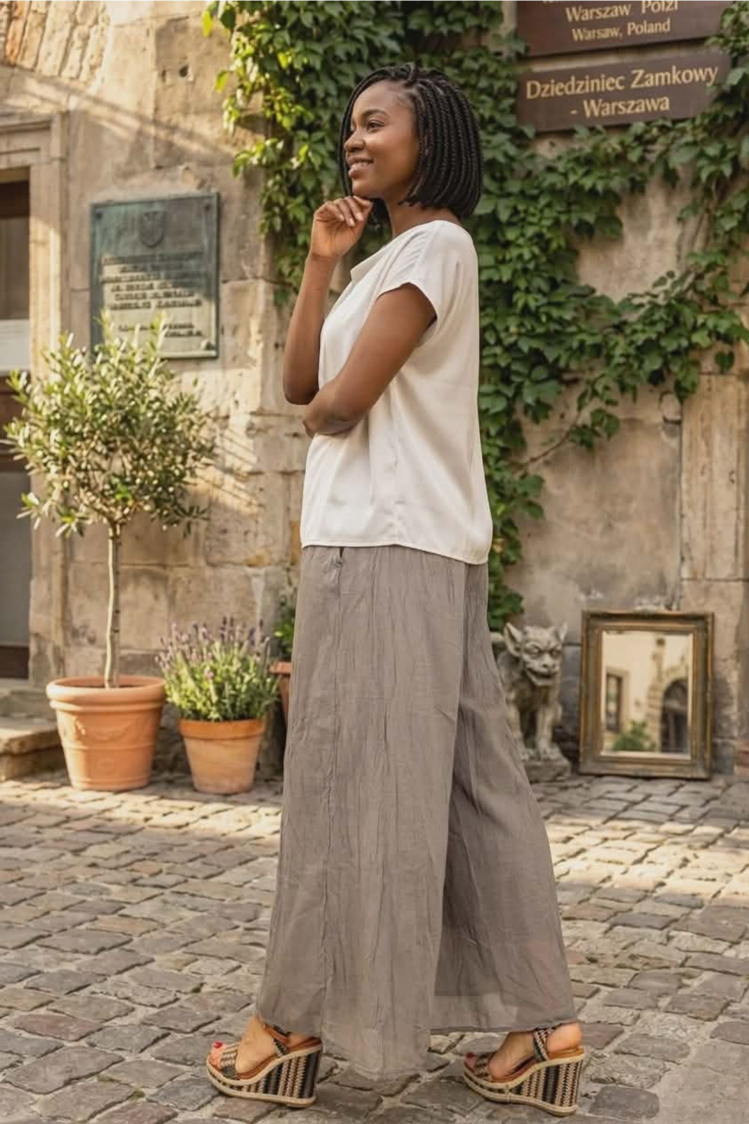 Spodnie damskie palazzo bawełniane gniecione z wysokim stanem na gumce z kieszeniami i podszewką Baucina fango