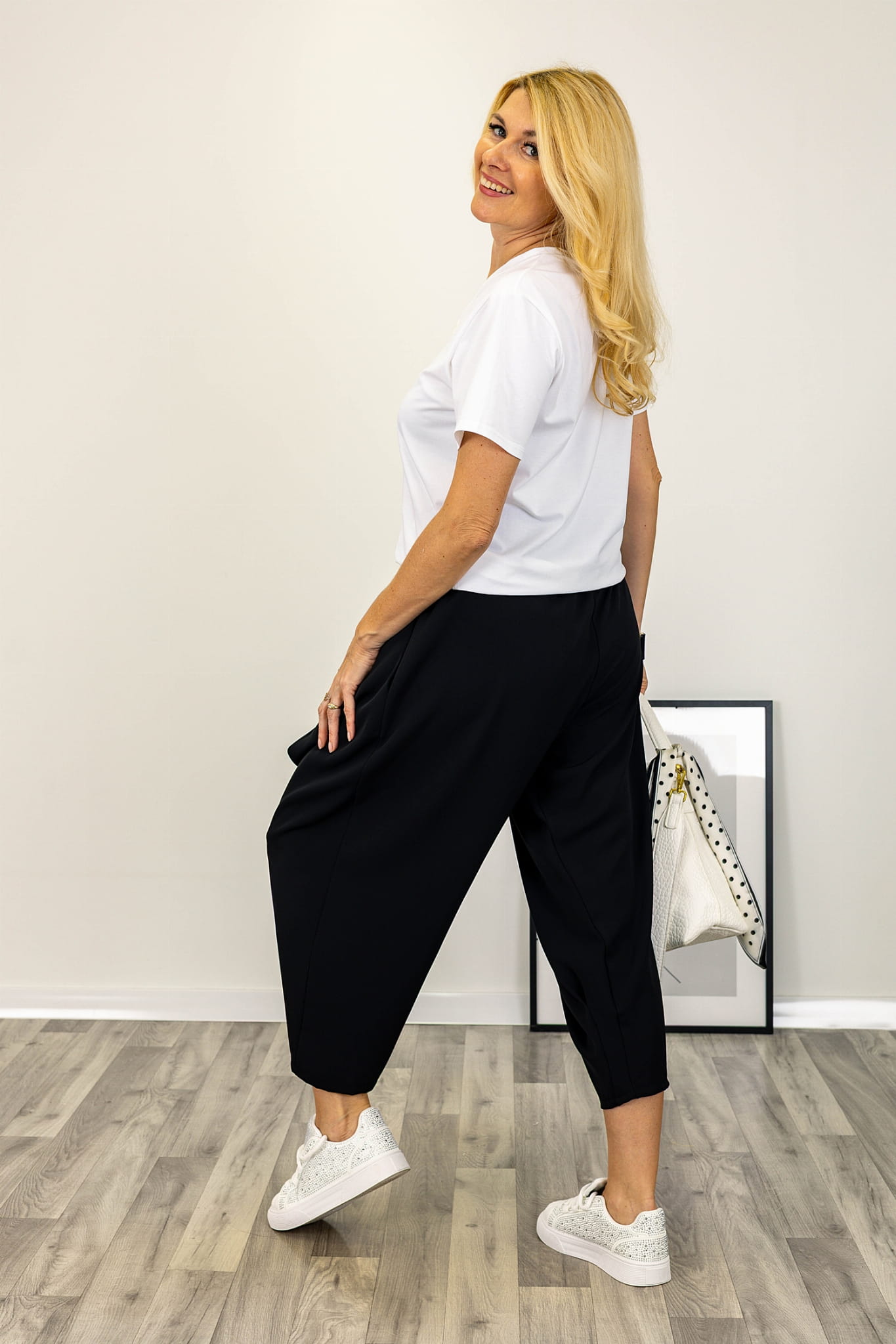 Model zaprojektowany z myślą o codziennej wygodzie, ale w bardziej dopracowanej, miejskiej odsłonie. Skrócona długość nogawek eksponuje okolice kostki i nadaje całości lekkości, a boczne kieszenie zwiększają funkcjonalność bez zaburzania estetyki. Materiał jest miękki, przyjemny w dotyku i dobrze układa się w ruchu, dzięki czemu spodnie prezentują się naturalnie i swobodnie.