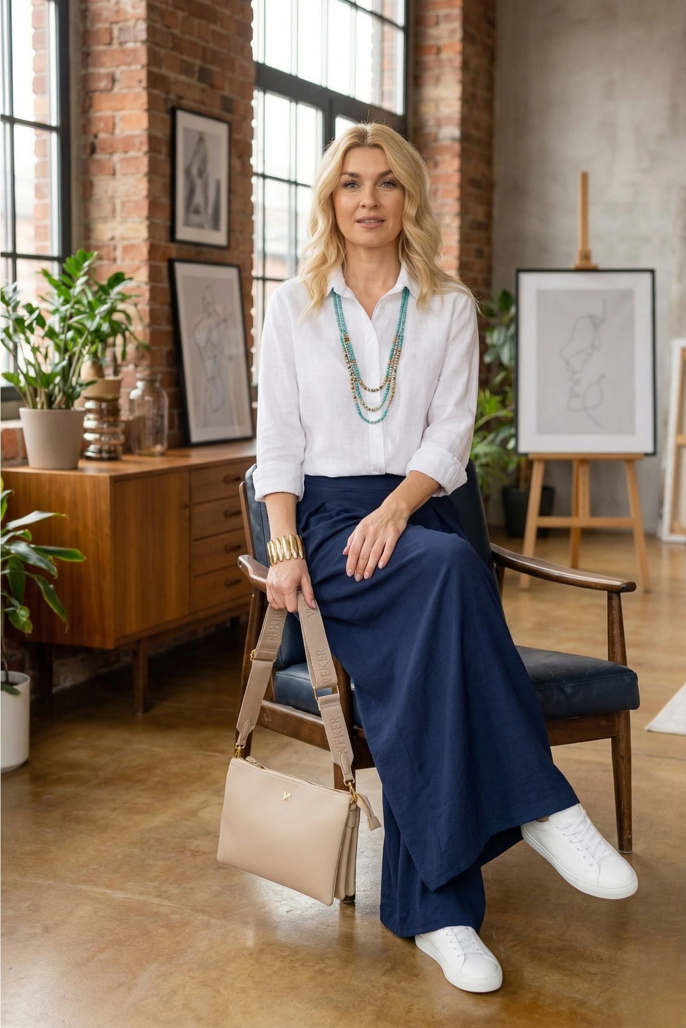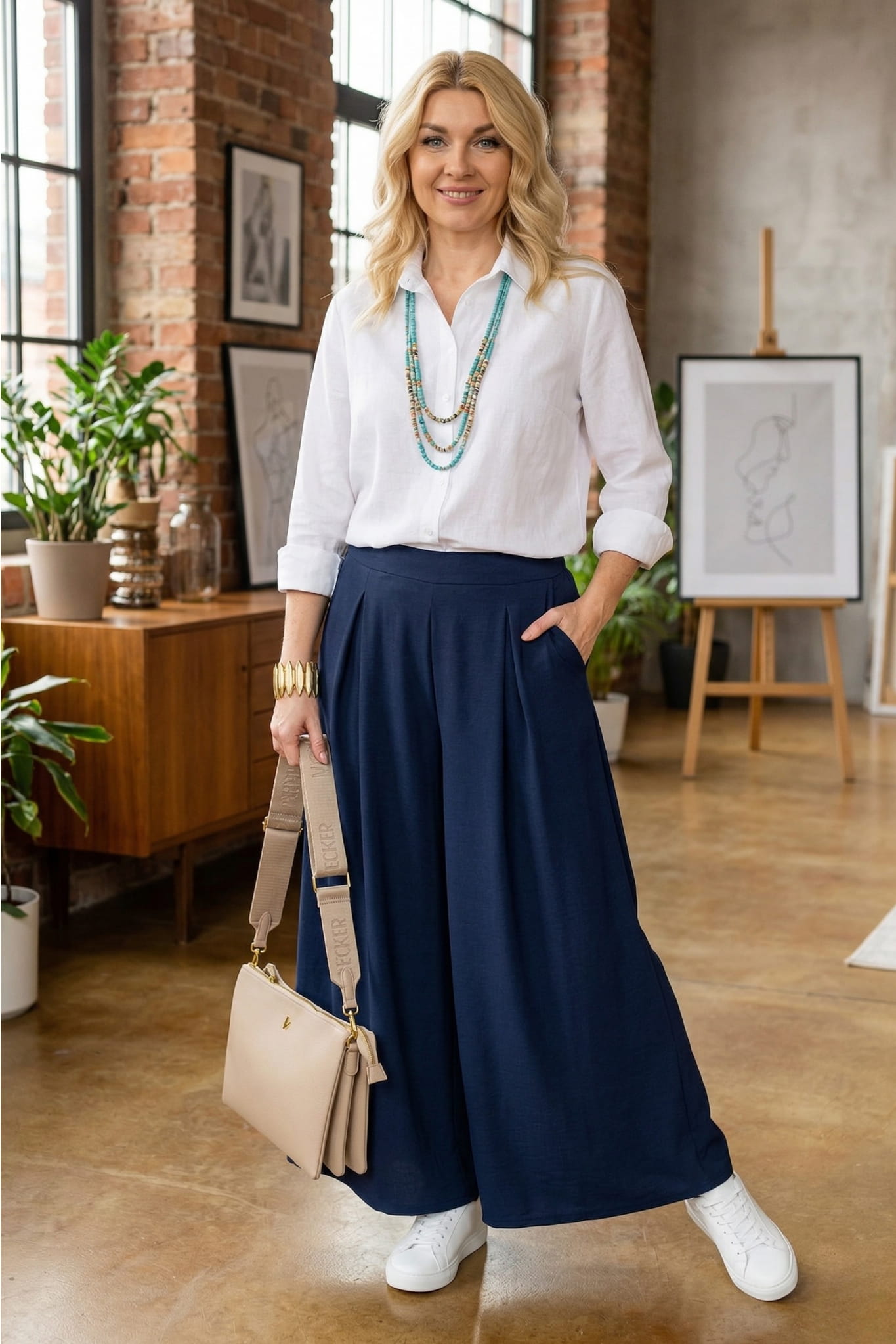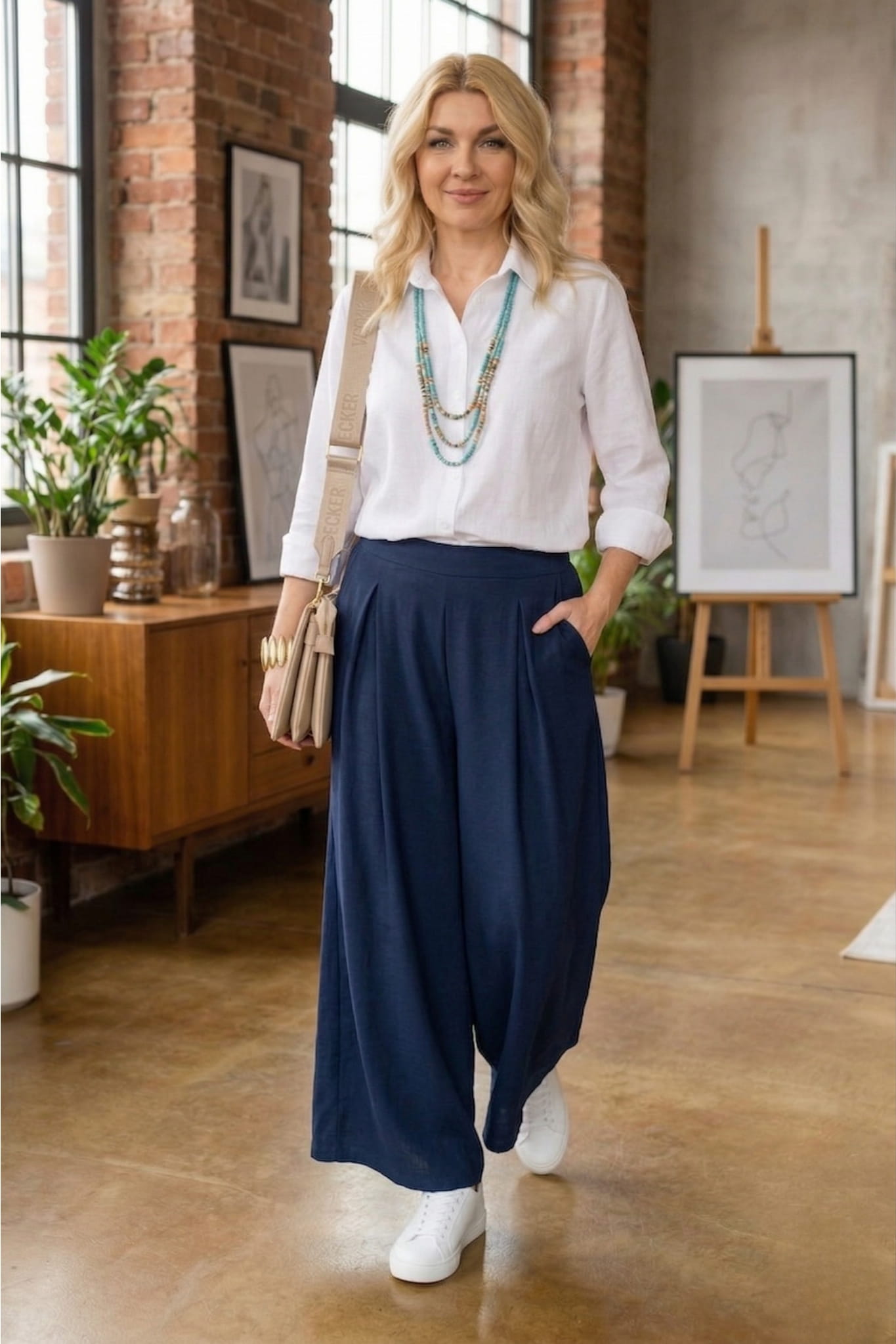 Spodnie palazzo granatowe to propozycja, która łączy lekkość wiosennego stylu z wyrazistym, dopracowanym charakterem. Szerokie nogawki pięknie pracują przy ruchu i nadają sylwetce lekkości, dzięki czemu spodnie damskie palazzo wyglądają swobodnie, ale nadal stylowo. Wysoki stan podkreśla talię i optycznie wydłuża proporcje, co sprawia, że całość prezentuje się harmonijnie i kobieco. Granatowy kolor dodaje głębi i elegancji, a jednocześnie pozostaje uniwersalny i łatwy do codziennego noszenia. To spodnie palazzo granatowe, które wprowadzają świeżość do stylizacji i od razu przyciągają uwagę.