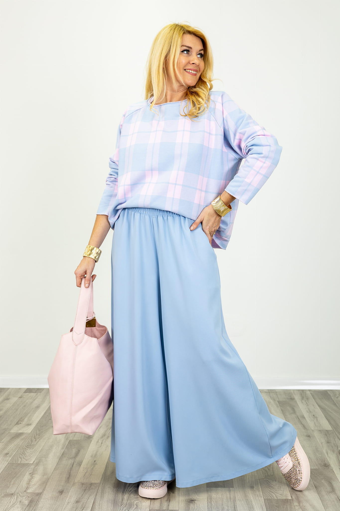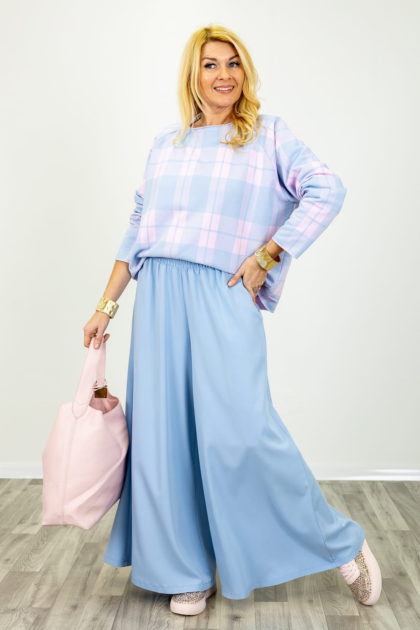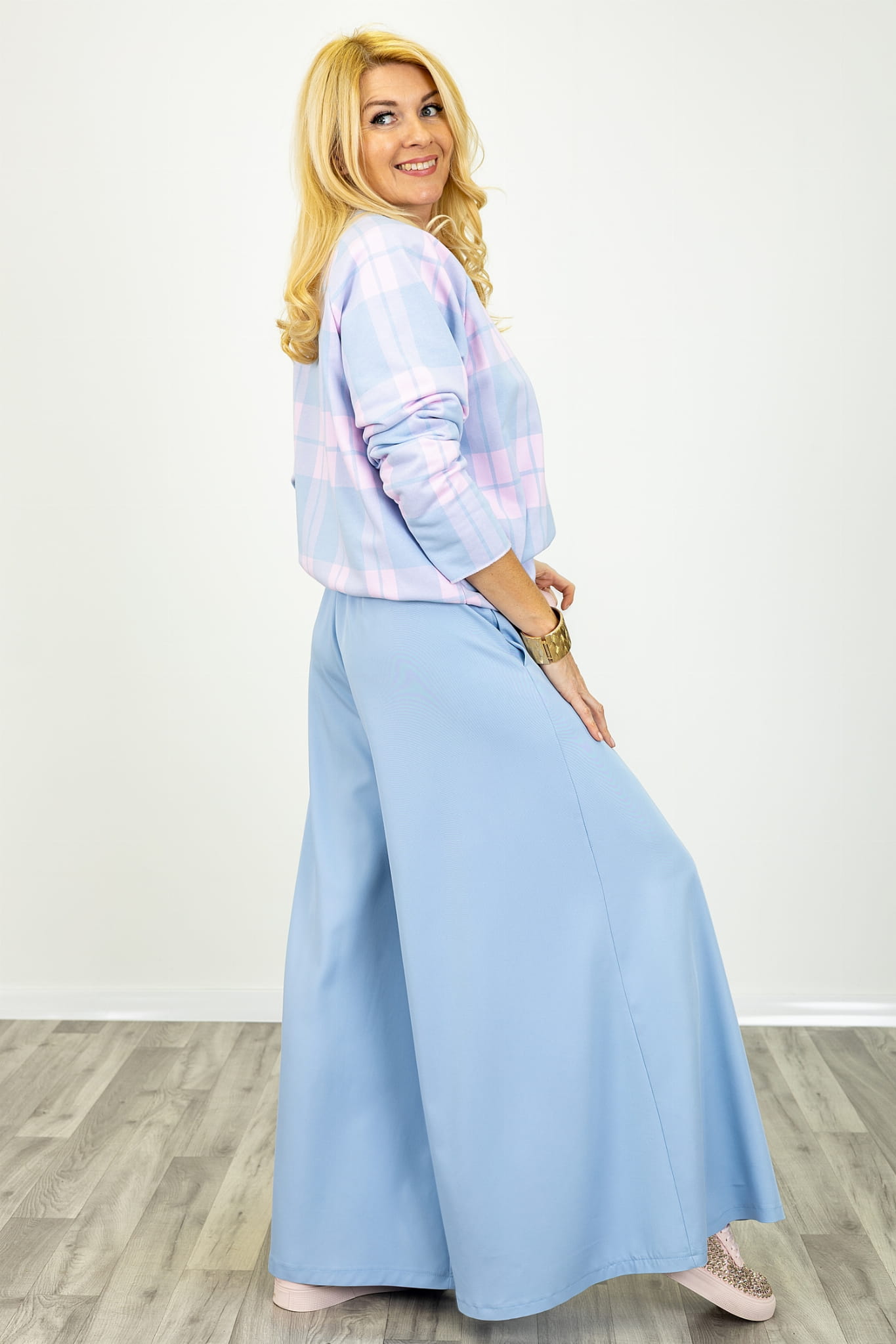 Spodnie palazzo z wysokim stanem gumką w pasie kieszeniami po bokach i szeroką nogawką Valdisotto błękitne
