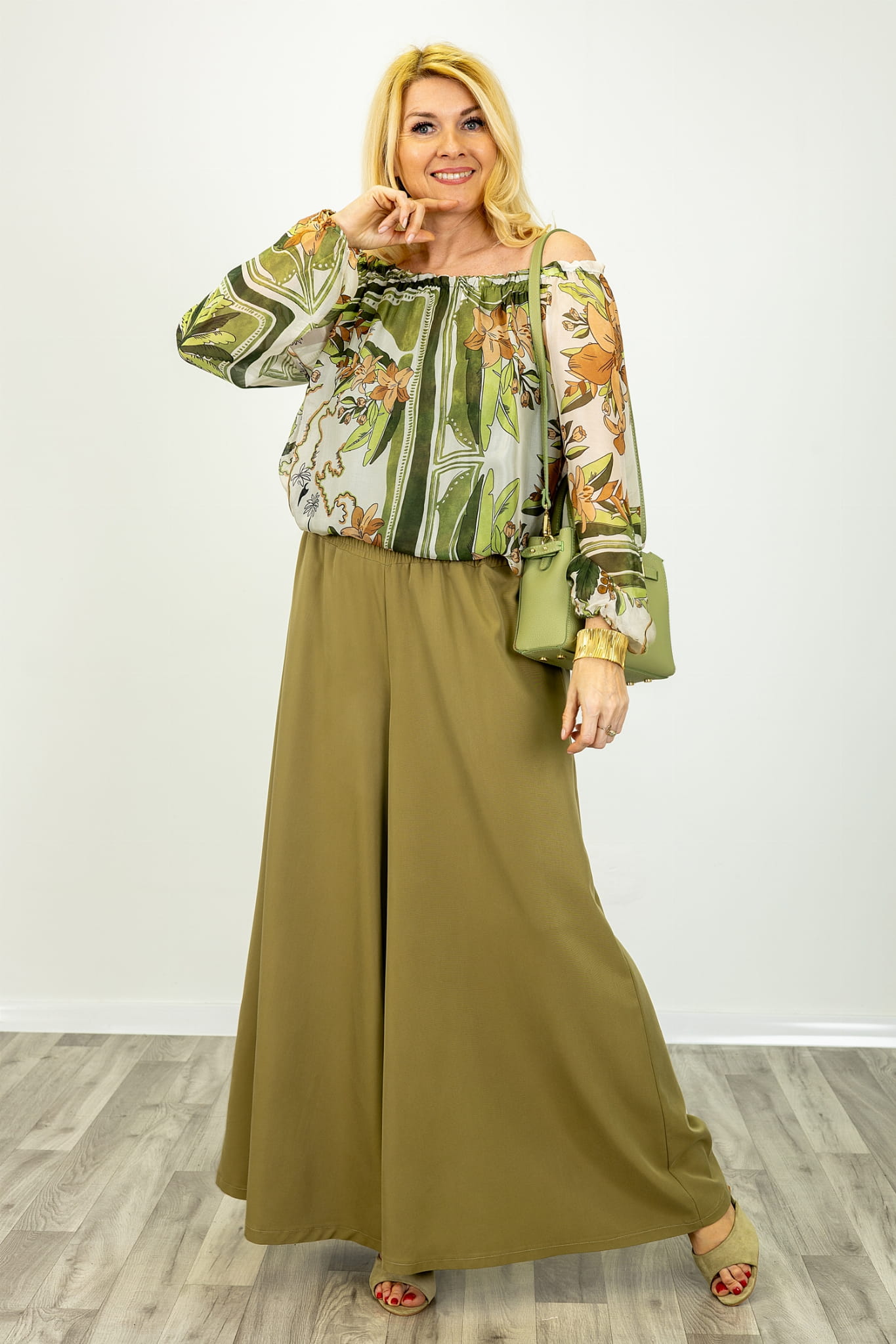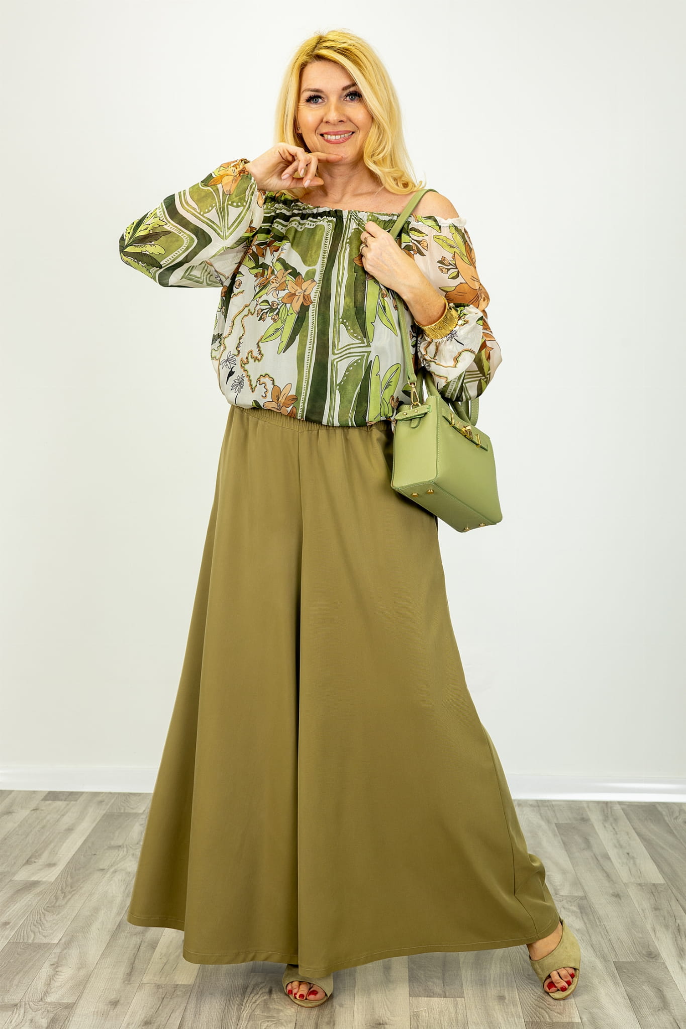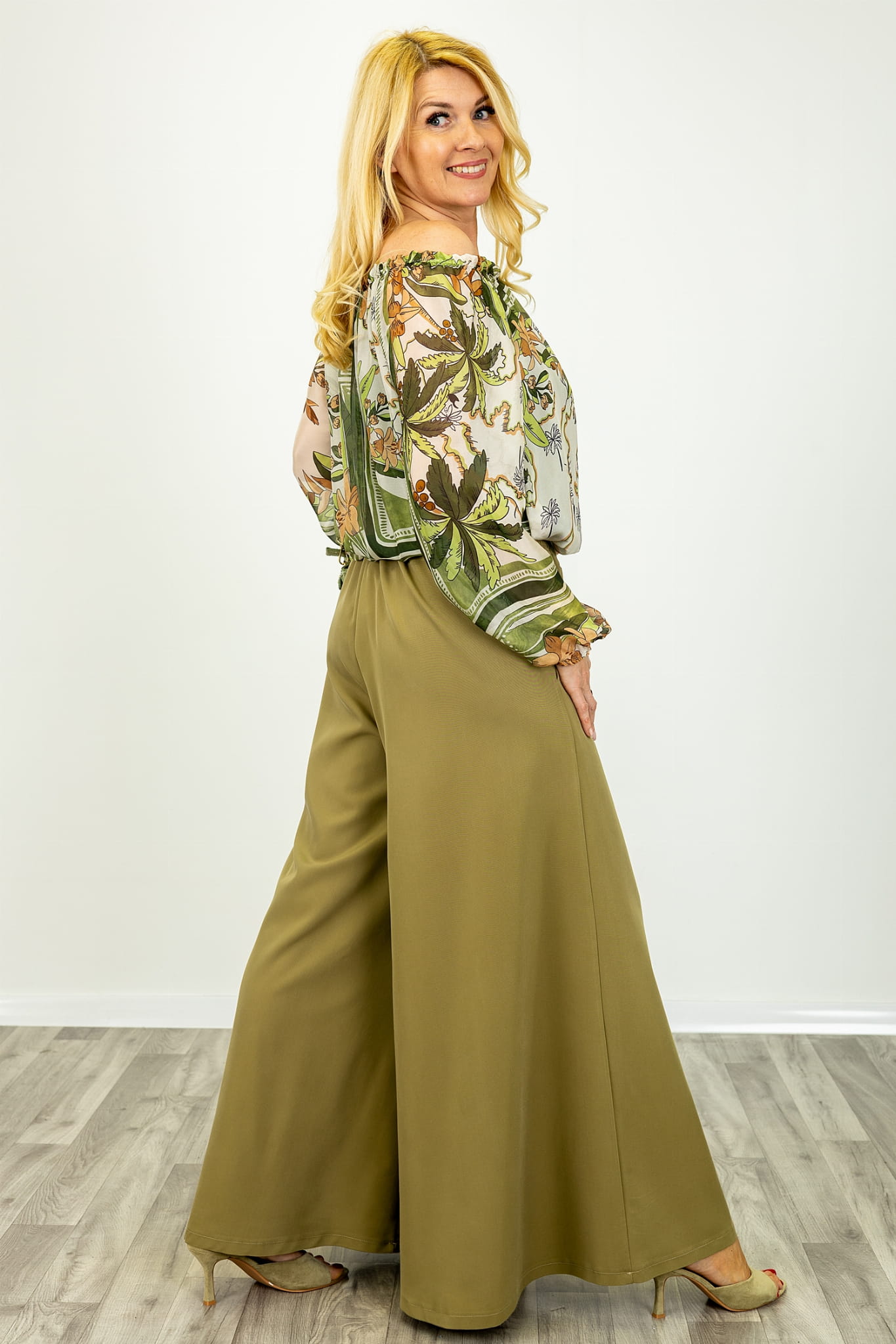 Spodnie palazzo z wysokim stanem gumką w pasie kieszeniami po bokach i szeroką nogawką Valdisotto oliwkowe