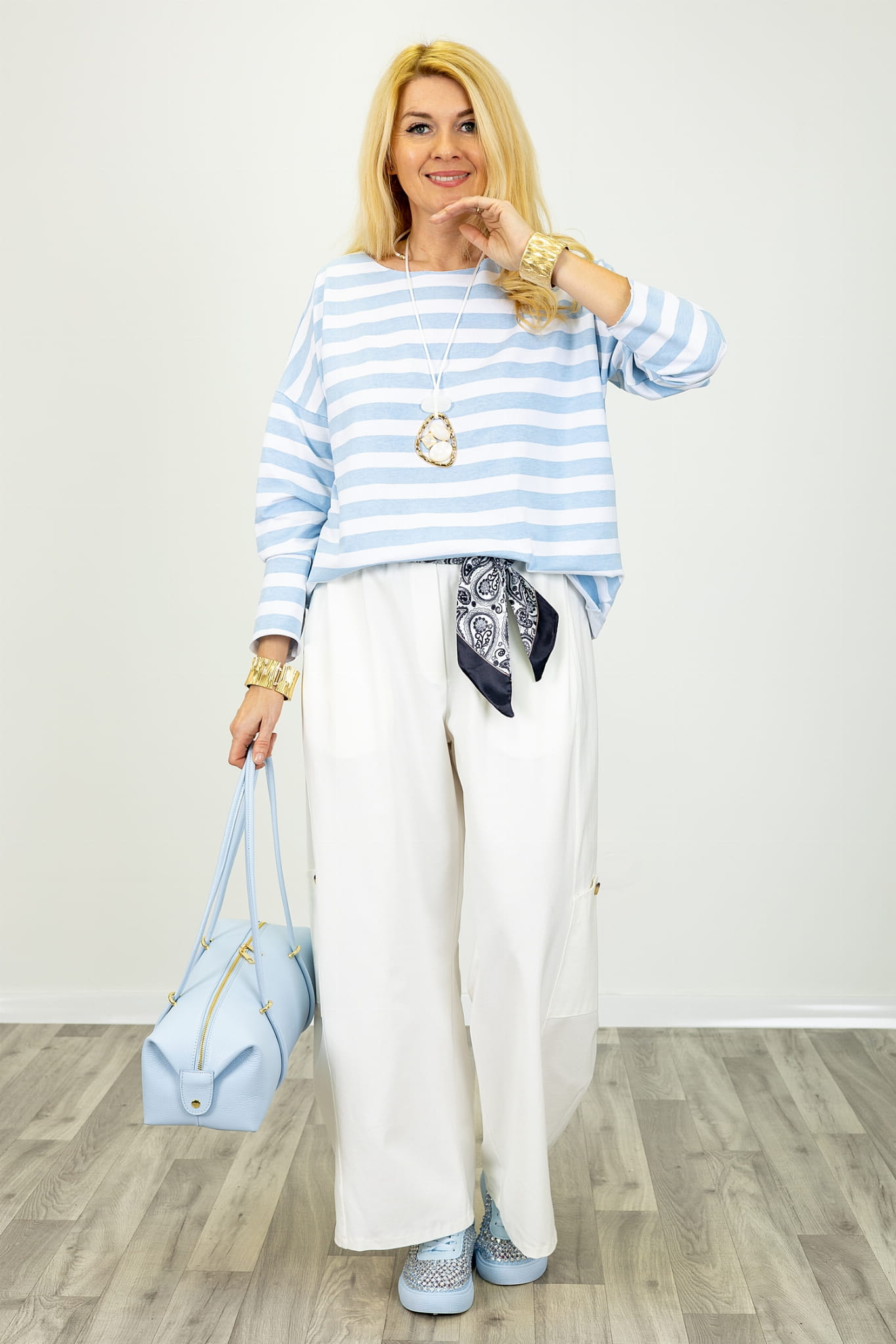 Na nogawkach znajdują się praktyczne kieszenie , które podnoszą funkcjonalność spodni i nadają im nowoczesny charakter. Dodatkowym elementem jest dekoracyjna apaszka we wzór paisley, umieszczona w pasie, stanowiąca elastyczny detal bez wpływu na komfort noszenia. Apaszka jest elementem, ozdobnym i uzupełnia całość projektu.