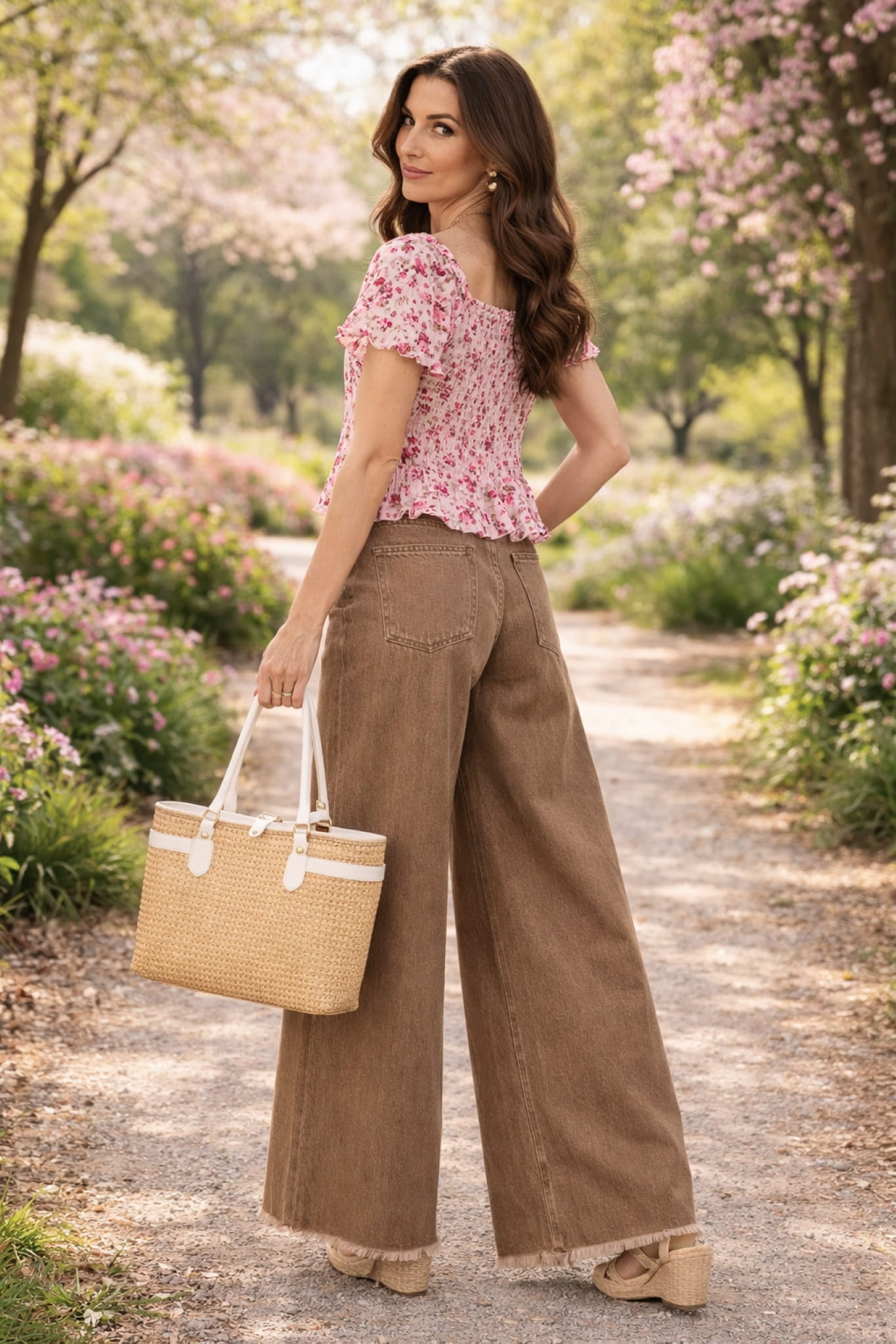Model posiada klasyczne rozwiązania, takie jak spodnie wide leg jeansowe z kieszeniami, co zwiększa ich funkcjonalność i podkreśla casualowy styl. Dodatkowym akcentem są jeansy wide leg postrzępiony dół, który nadaje całości bardziej nowoczesnego i miejskiego wyrazu.