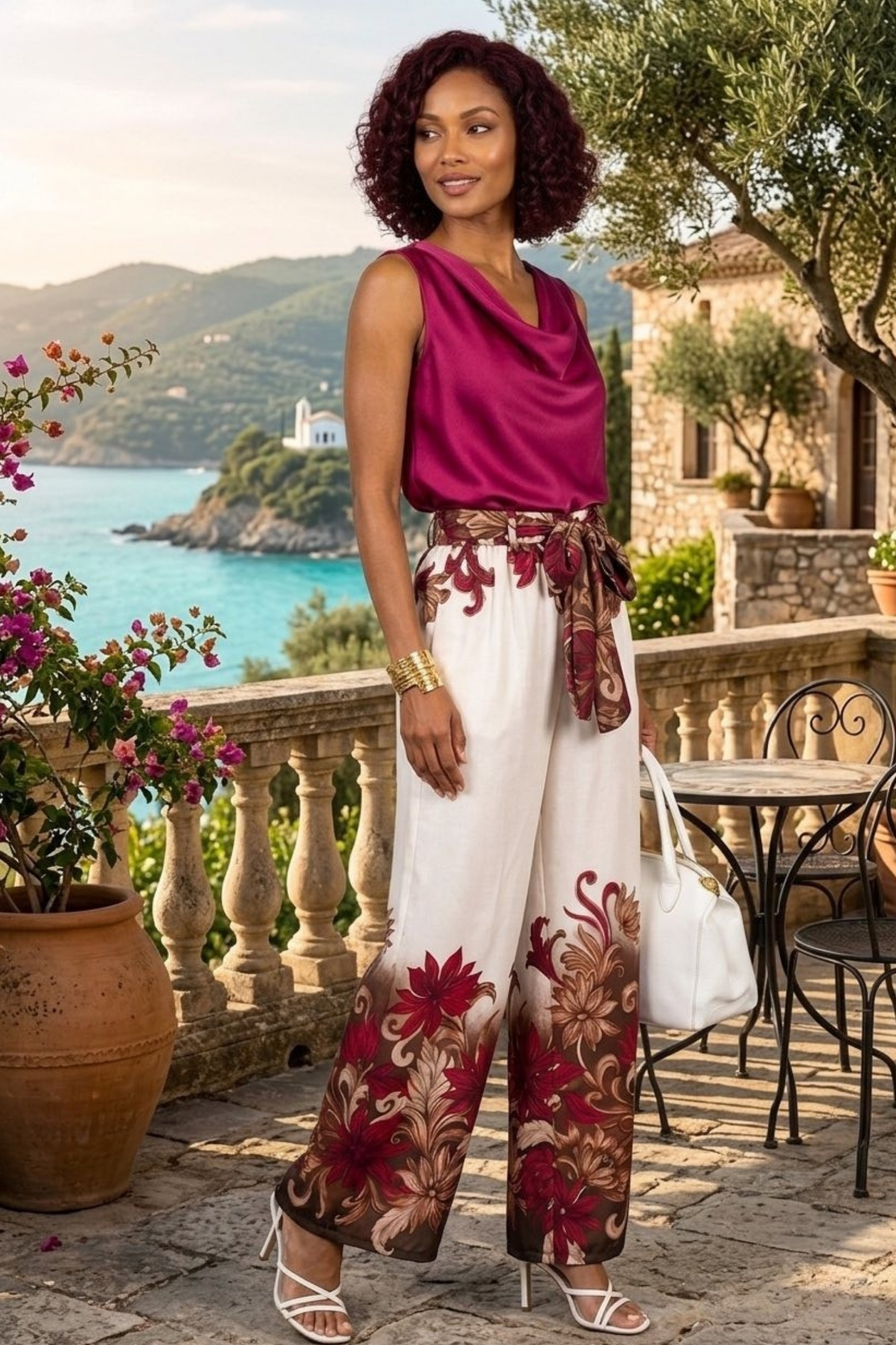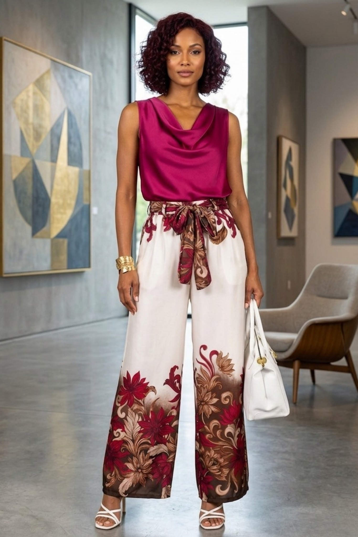 Spodnie wide leg satynowe ecru z burgundem w kwiaty z kieszeniami wiązaniem w pasie na gumce Roccamorice