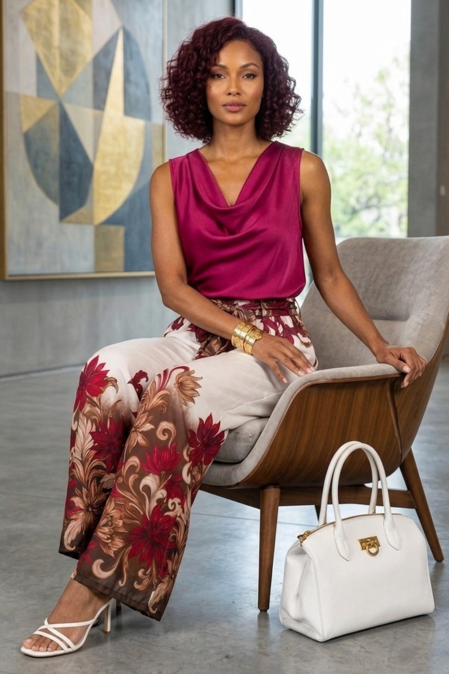 Spodnie satynowe damskie w kwiaty przyciągają uwagę dynamicznym printem, dzięki czemu stylizacja wygląda dopracowanie bez potrzeby dodatkowych ozdób. Spodnie damskie szerokie nogawki miękko układają się na sylwetce i optycznie ją wydłużają, co pomaga wyrównać proporcje. Spodnie satynowe na gumce dopasowują się w talii, a spodnie damskie z wiązaniem w pasie pozwalają dodatkowo regulować dopasowanie i podkreślić linię talii. Spodnie wide leg z kieszeniami zwiększają funkcjonalność i sprawiają, że model jest praktyczny na co dzień. Spodnie wide leg luźne wygodne nie opinają ciała, dlatego dobrze sprawdzają się dla różnych typów sylwetek i zapewniają komfort przez wiele godzin.