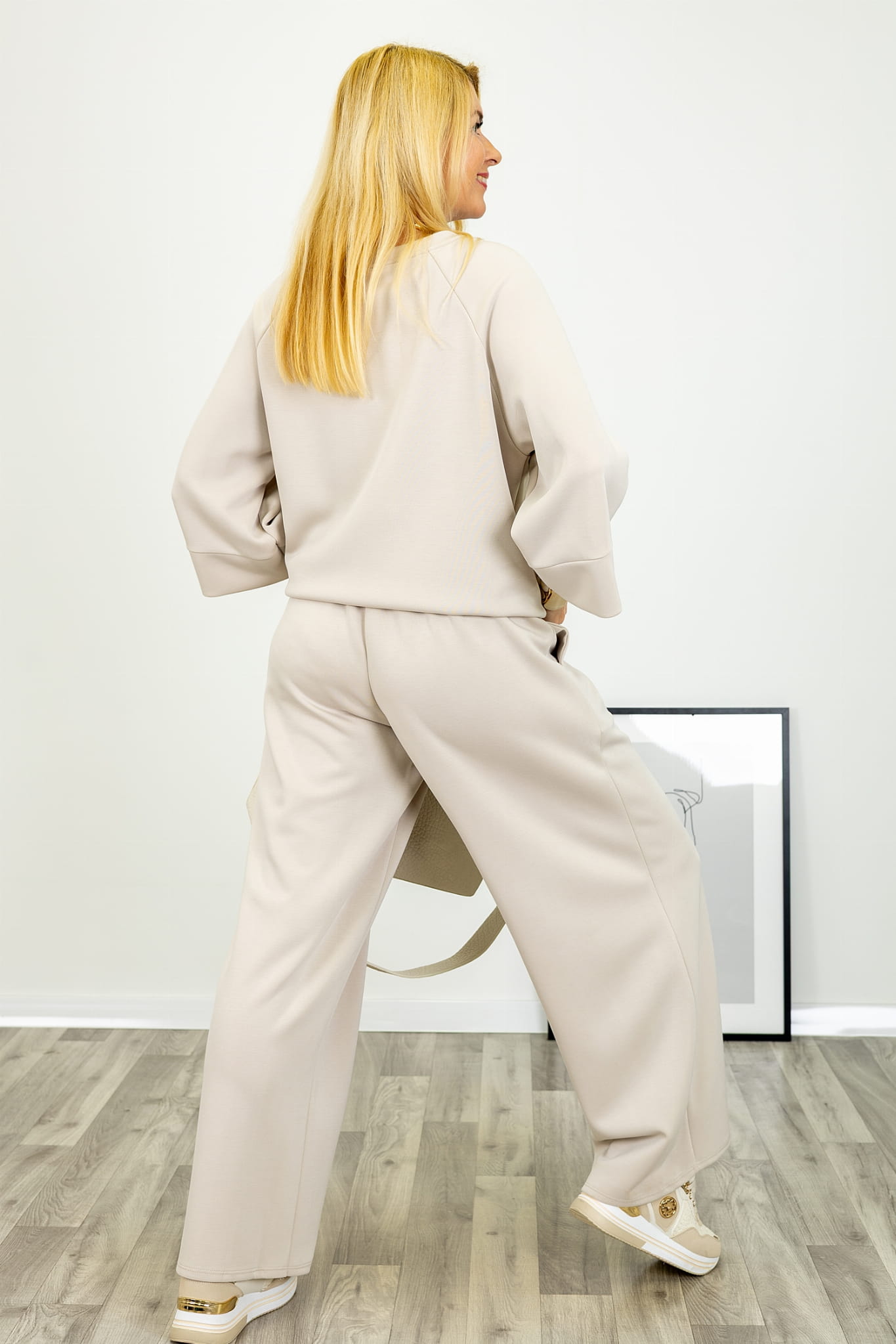 Wykonane z wyjątkowo miękkiego, lejącego się materiału typu „masełko”, spodnie doskonale układają się na sylwetce i zapewniają przyjemne odczucie w kontakcie ze skórą. Szeroka nogawka typu wide leg nadaje całości lekkości i modnego charakteru, a jednocześnie optycznie wydłuża nogi.