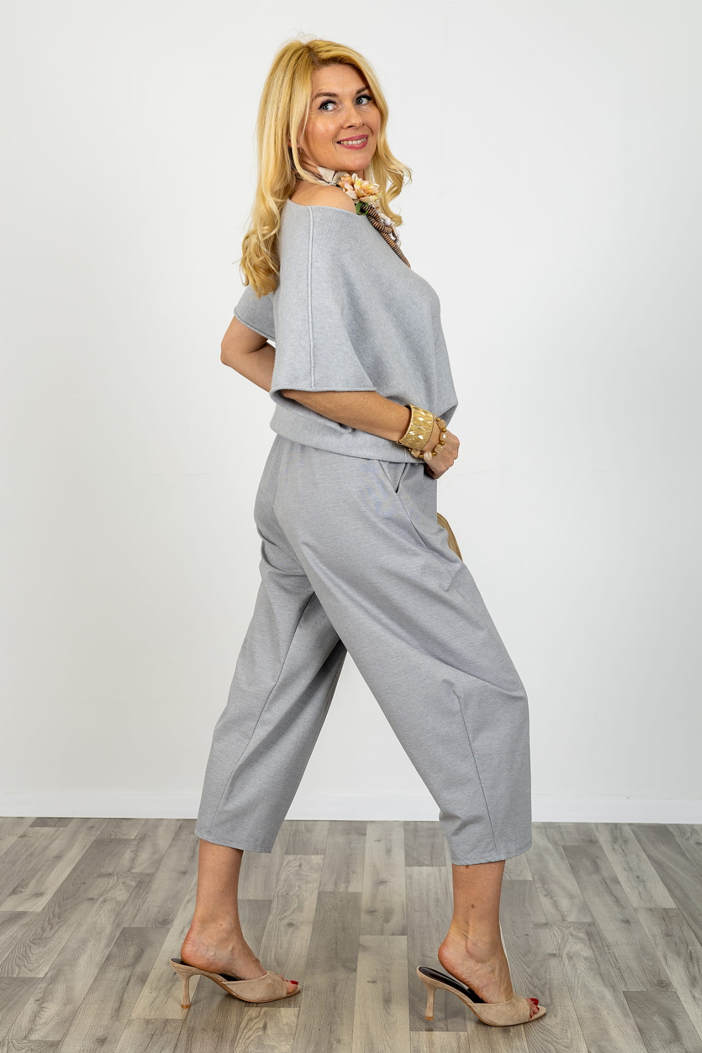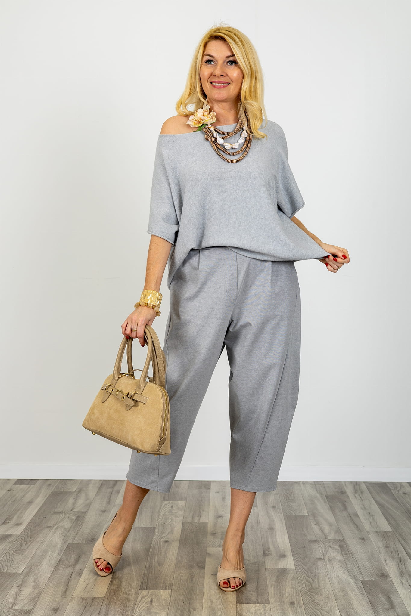 Szare spodnie balloon damskie to propozycja dla kobiet, które cenią wygodę i modny, nowoczesny krój inspirowany włoską modą. Charakterystyczna forma sprawia, że spodnie balloon damskie układają się swobodnie na sylwetce, zapewniając komfort noszenia przez cały dzień. Luźniejsza konstrukcja nogawek sprawia, że spodnie damskie luźny krój balloon prezentują się lekko i bardzo stylowo.